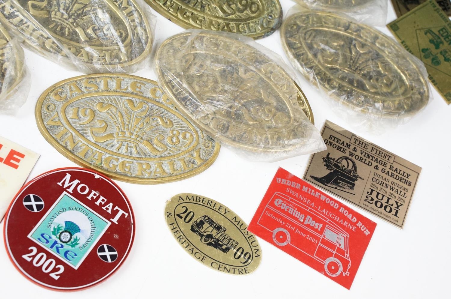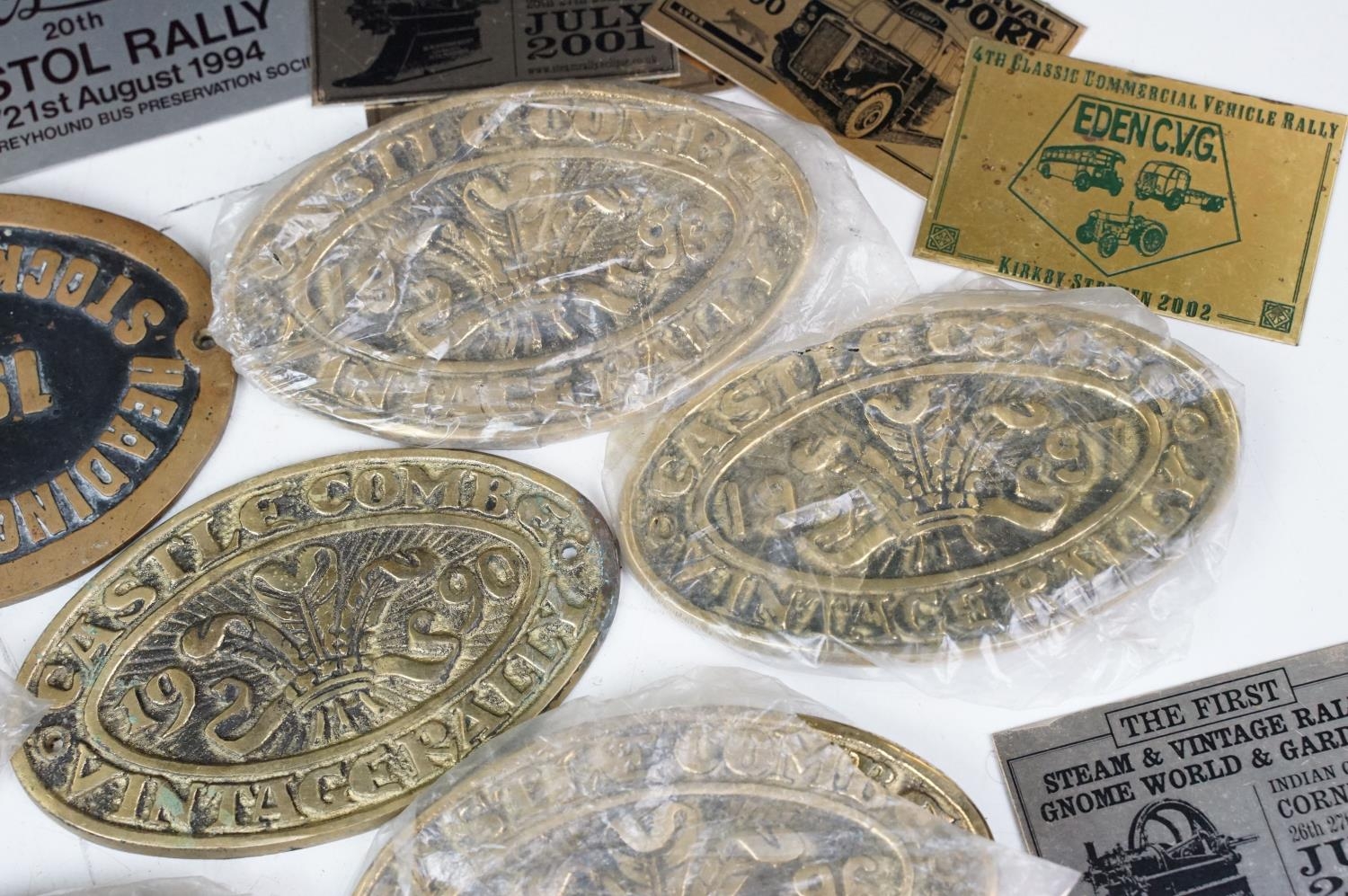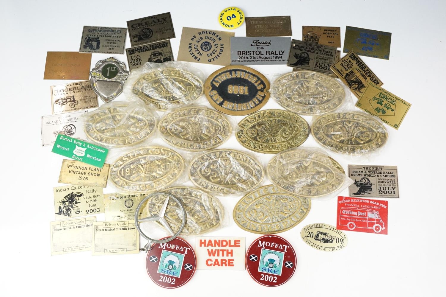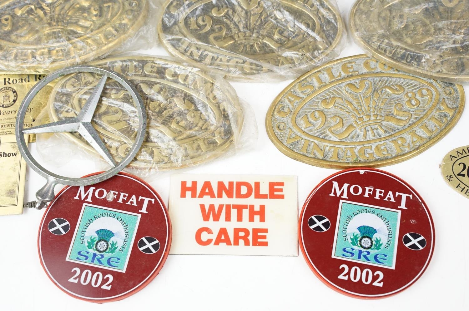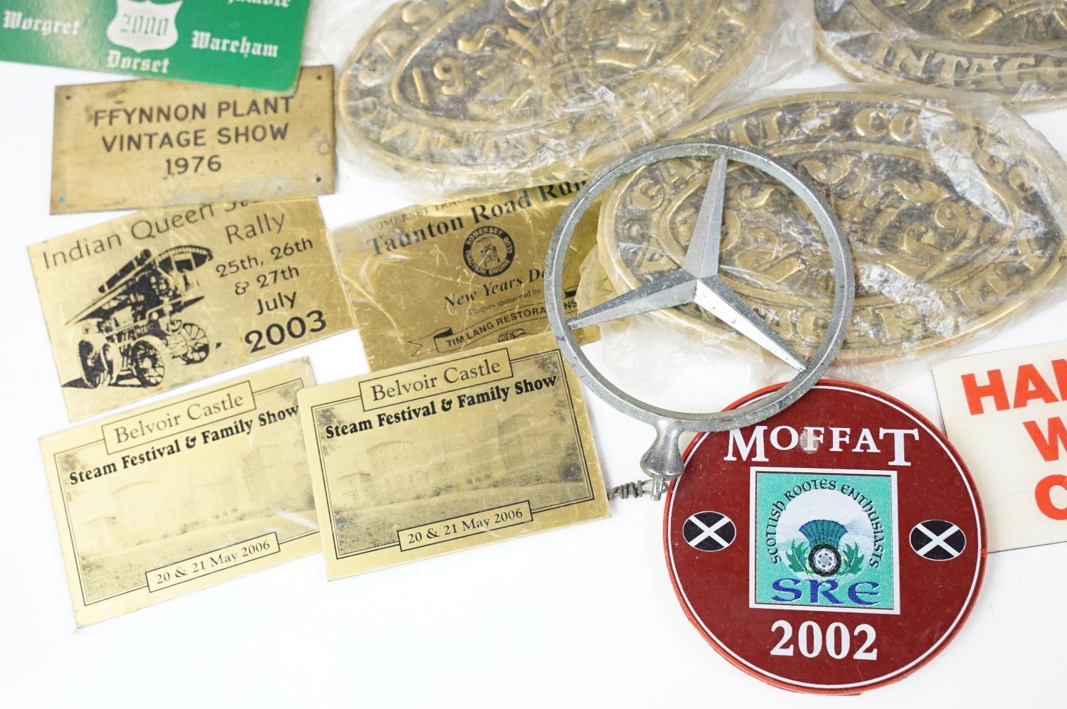 A collection of mixed car badges together with a selection of brass steam rally badges.