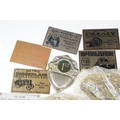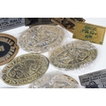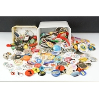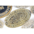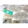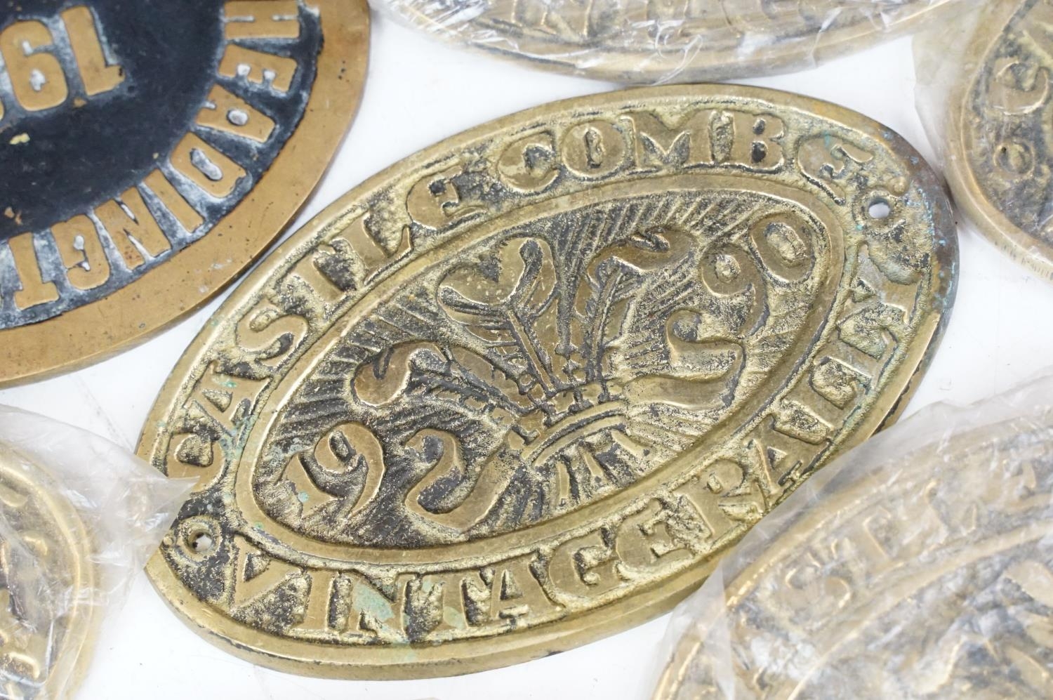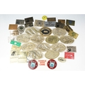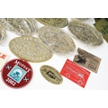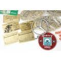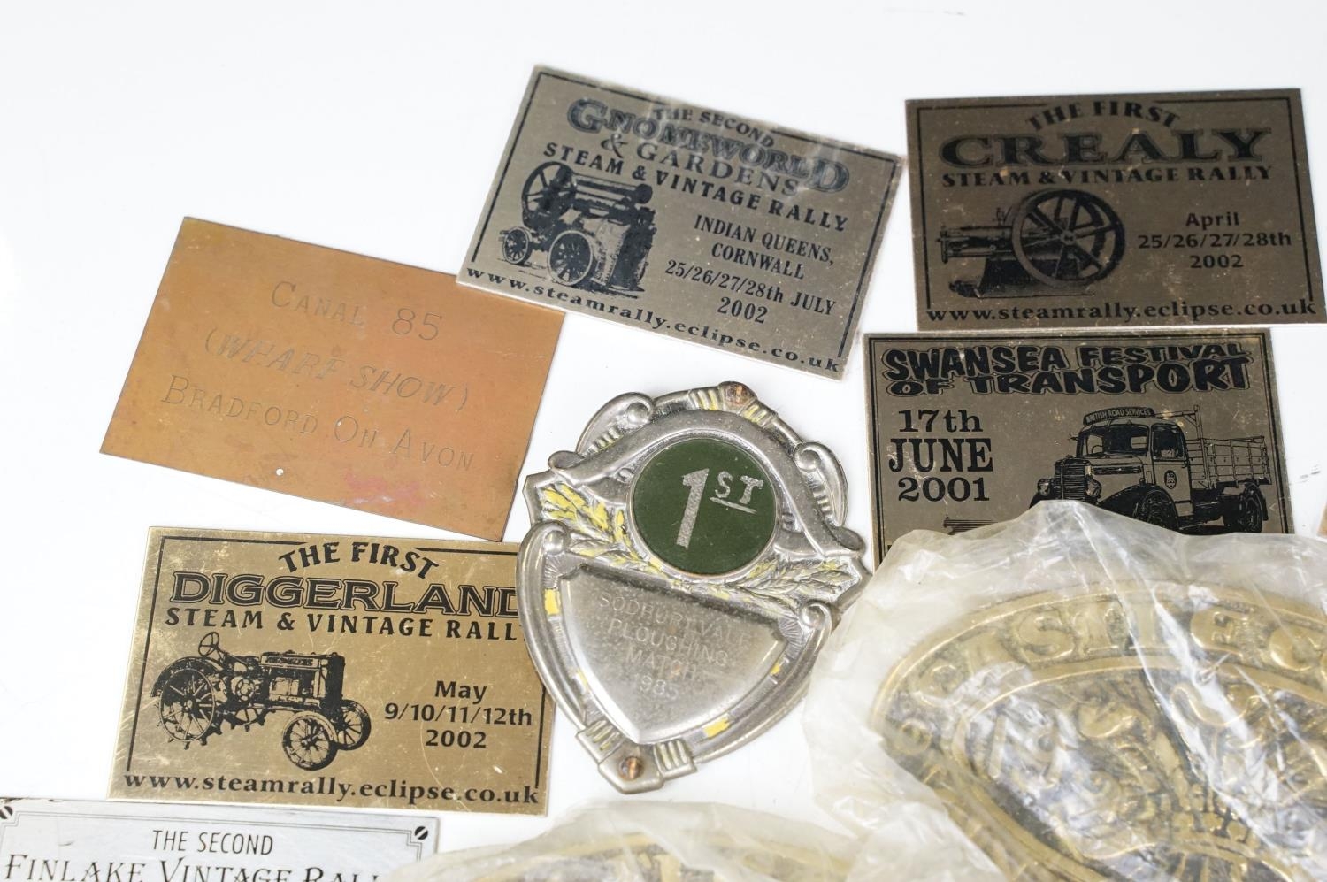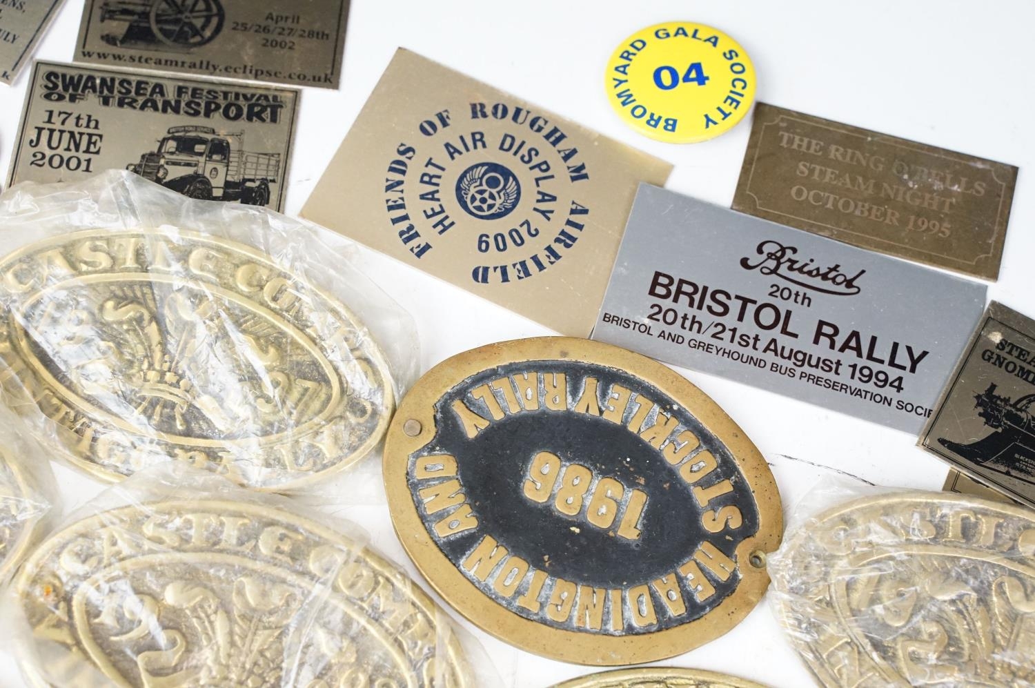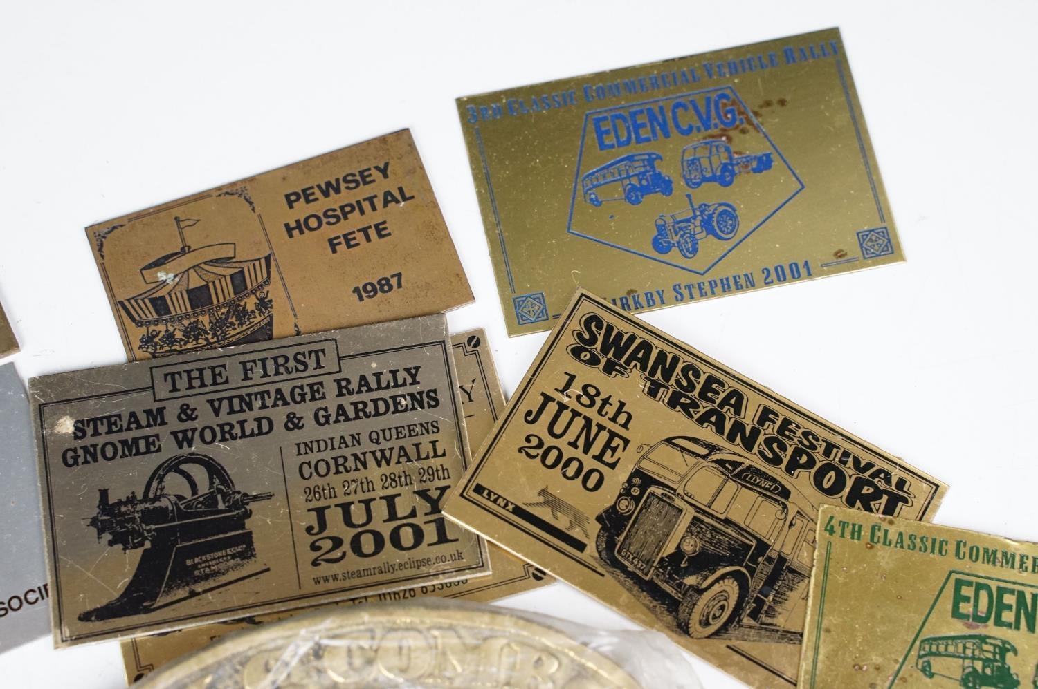 A collection of mixed car badges together with a selection of brass steam rally badges.