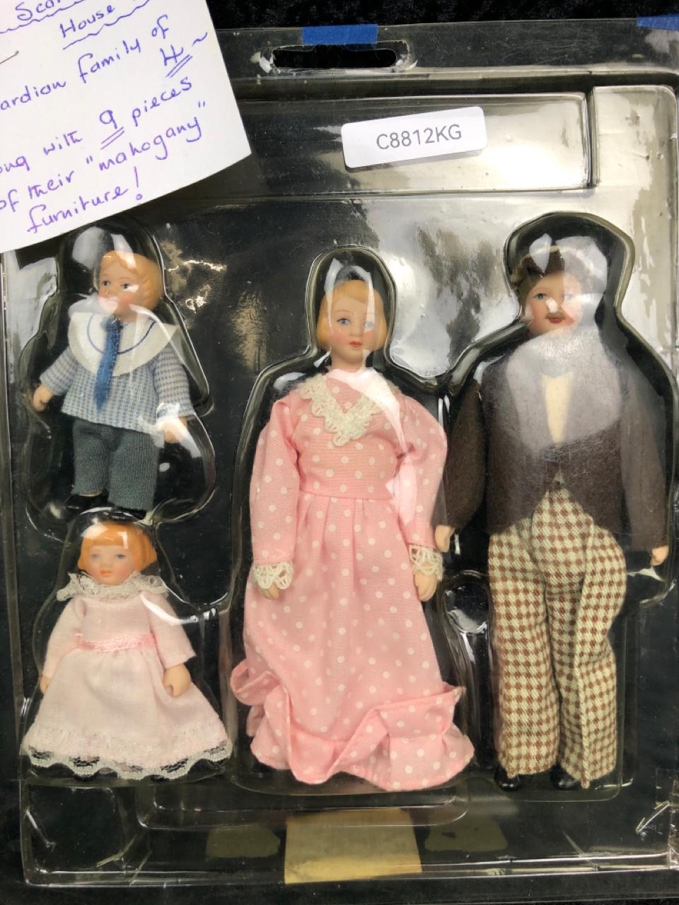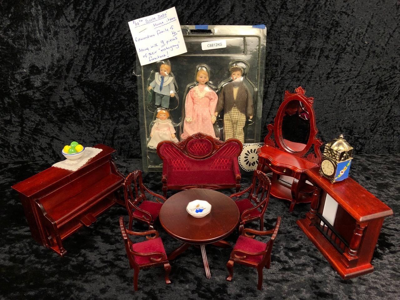 Starter kit for a Victorian doll’s house including a family of figures, mahogany furniture and accessories.
