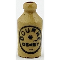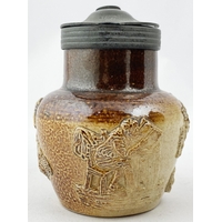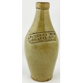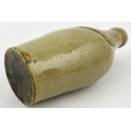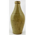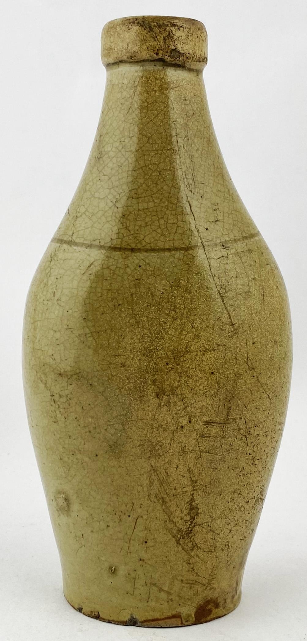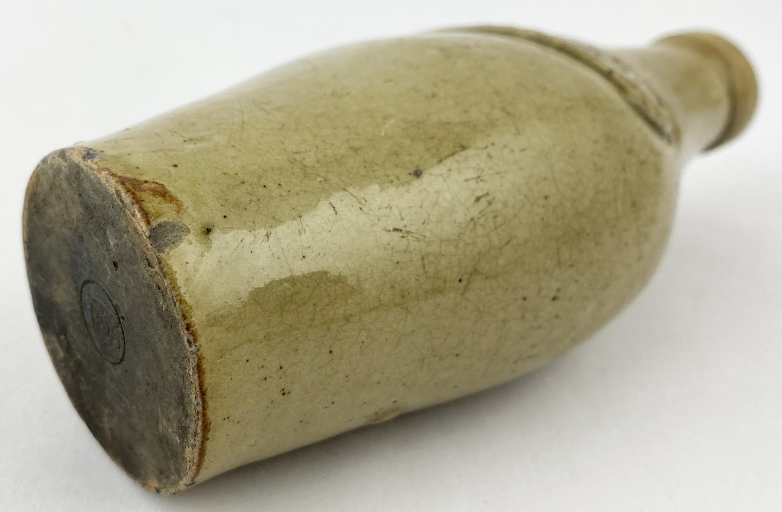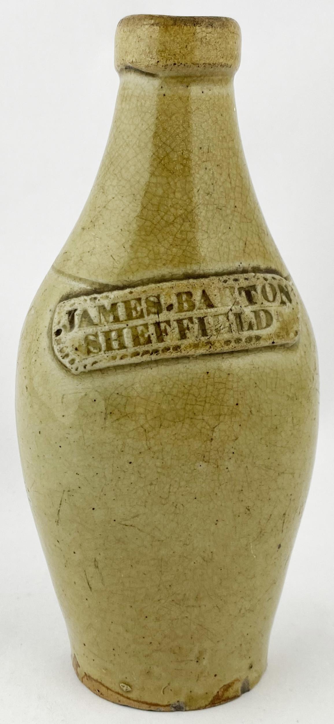 SHEFFIELD SLAB SEALED FLASK. 6.2ins tall. Flattened lozenge shaped grey green slip glaze flask with applied ribbon seal JAMES BARTON/ SHEFFIELD. Usual fine crazing, general aged wear & minute pinhead couple of nicks at bottom but overall very good indeed. A particularly attractive & rare small size example of its type - superb!
