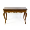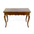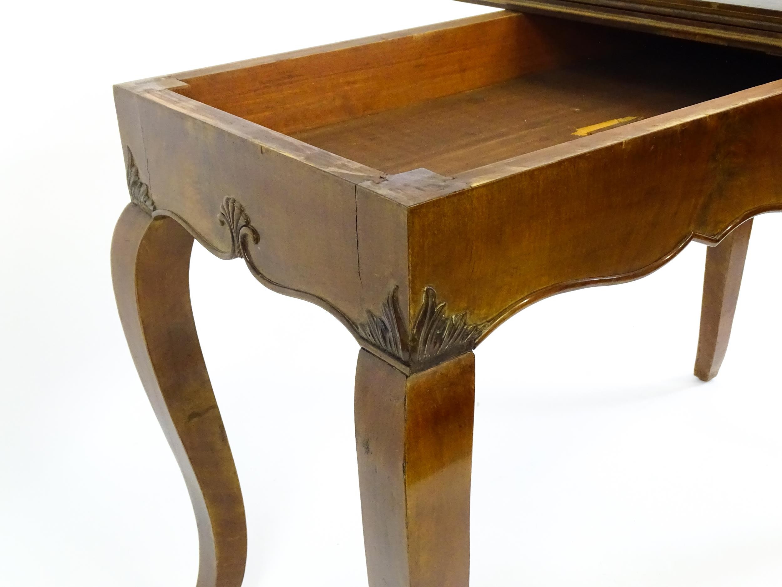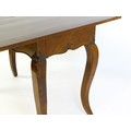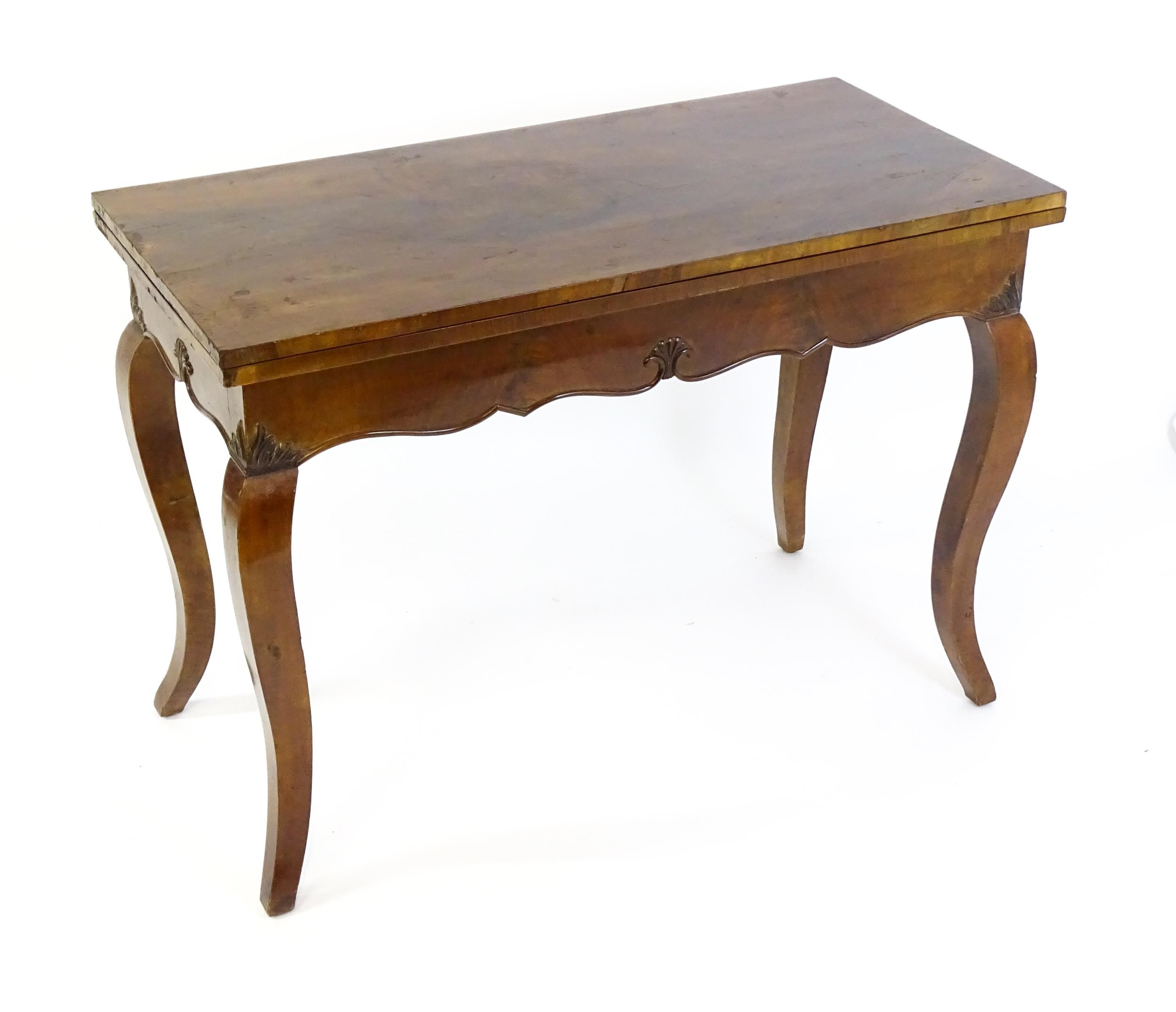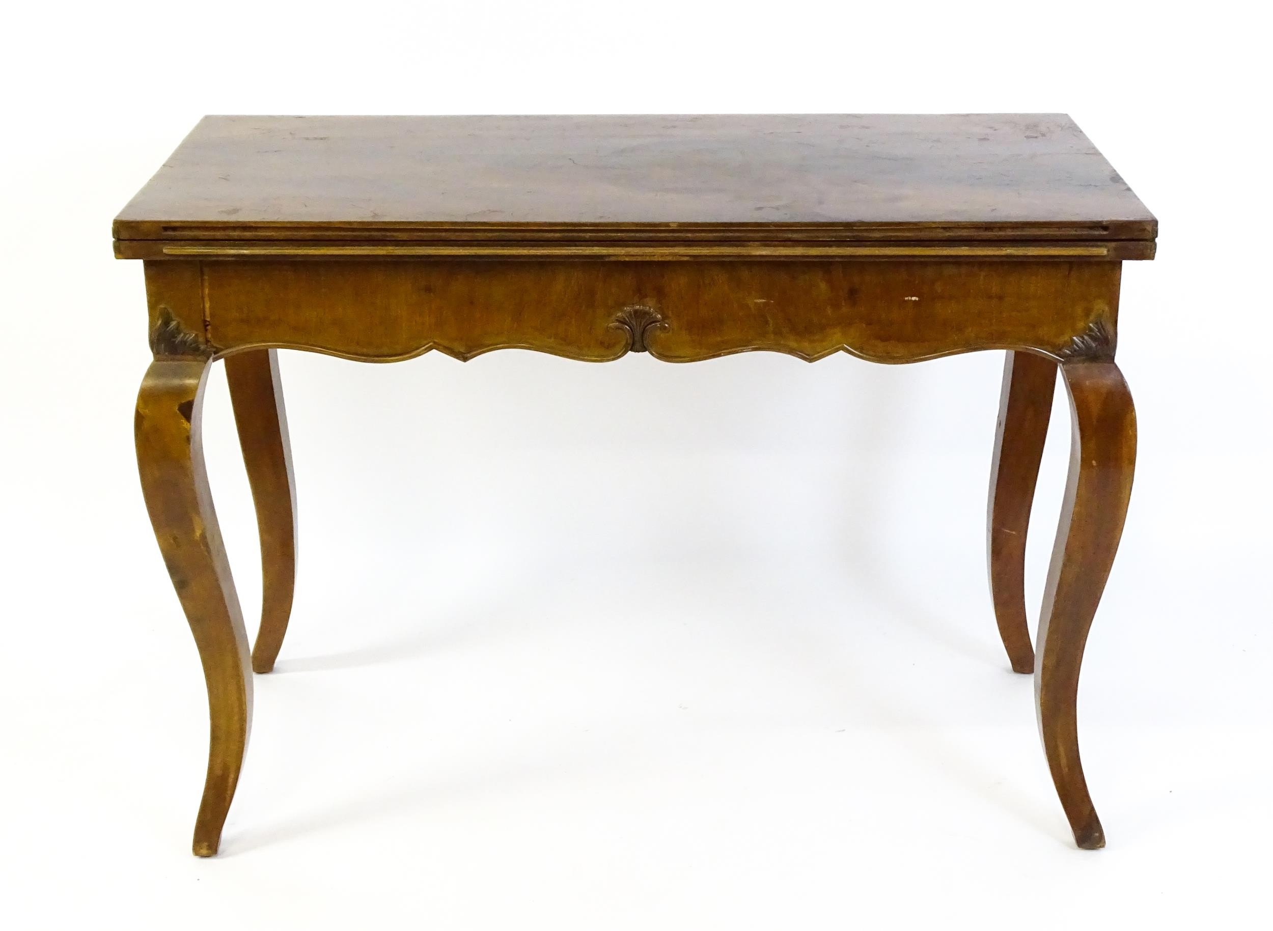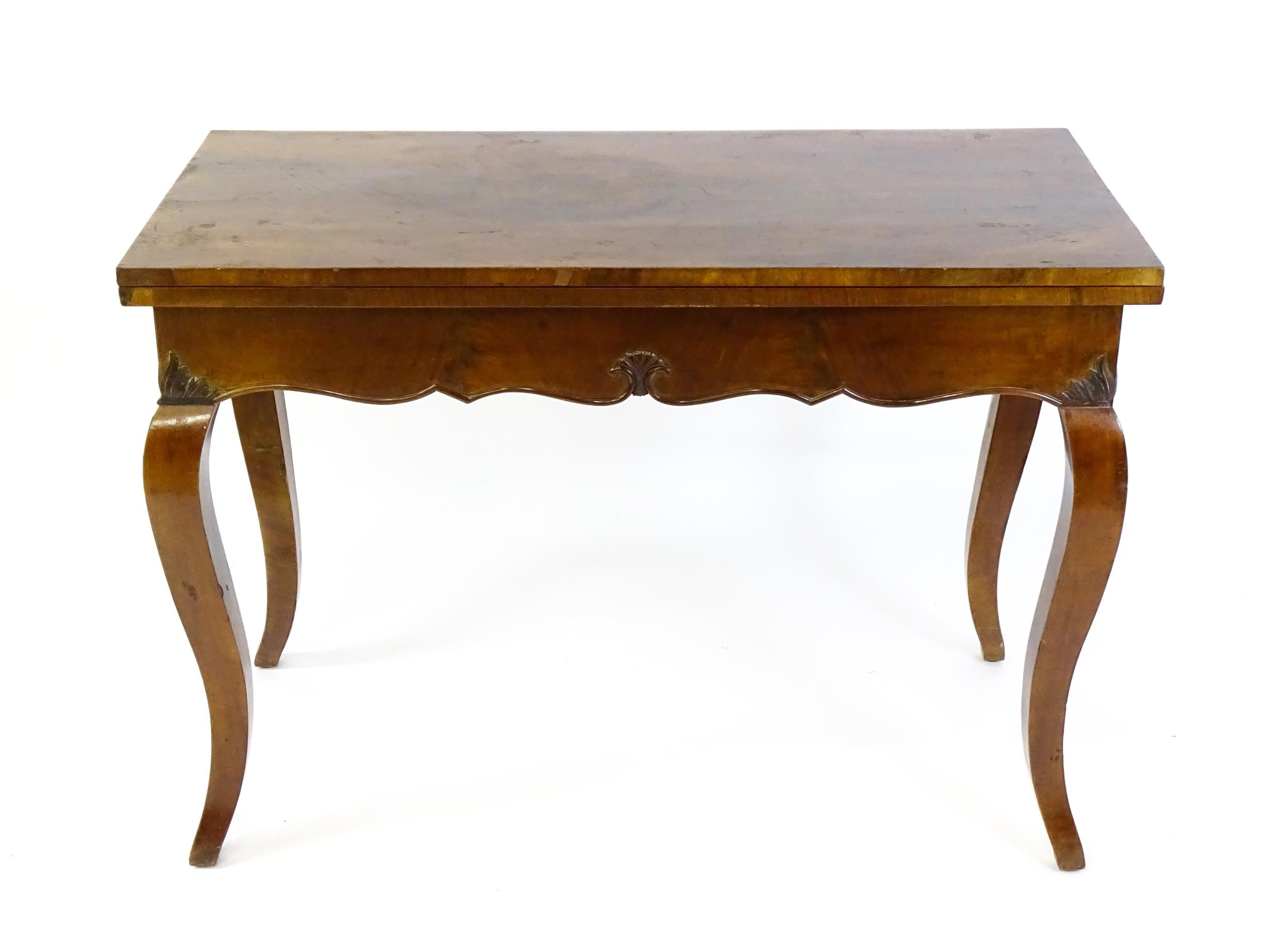 An early 20thC mahogany tea table of large proportions, the hinged rectangular top above a shell carved apron and four cabriole legs. 45" wide x 22" deep x 32" high.