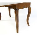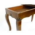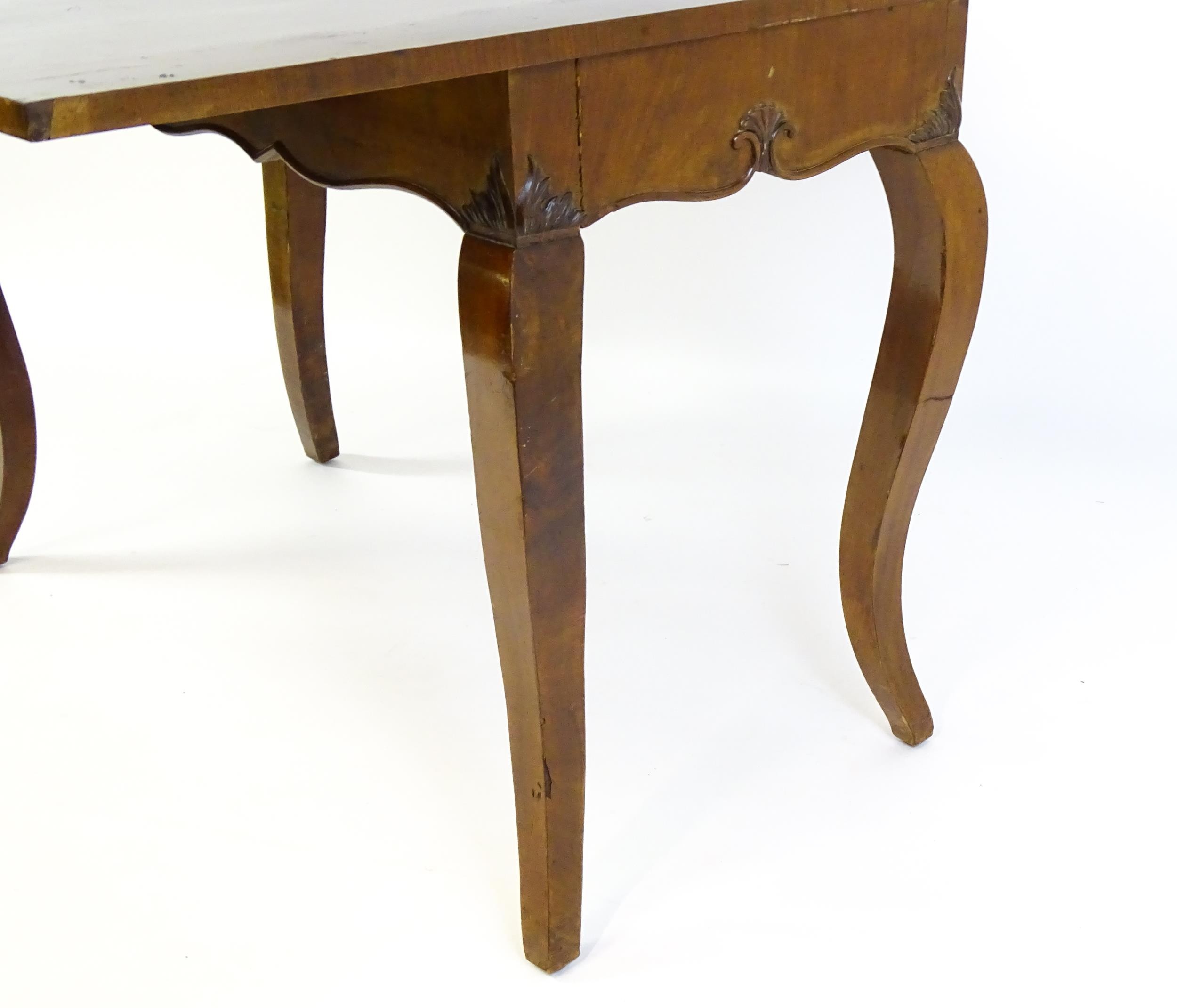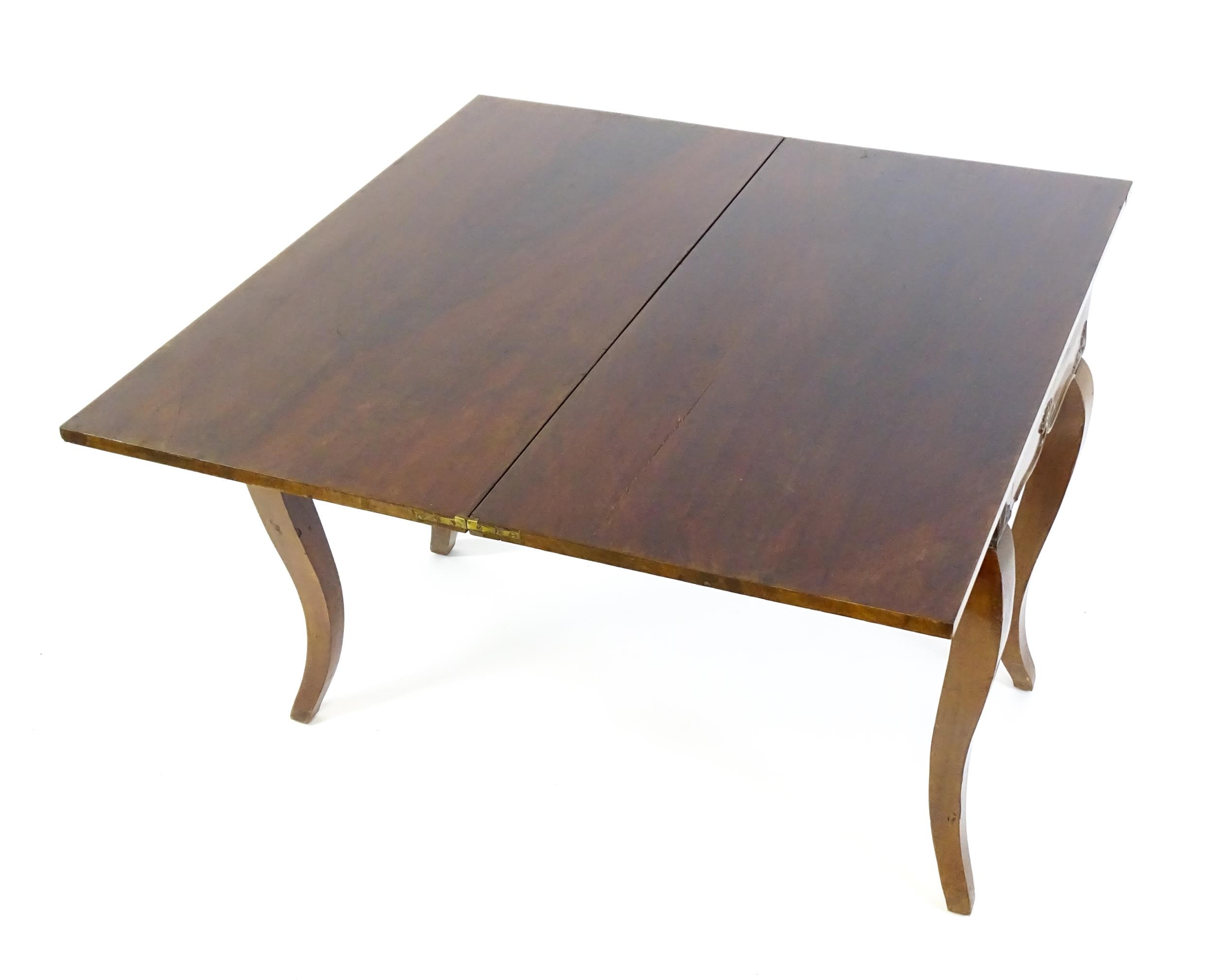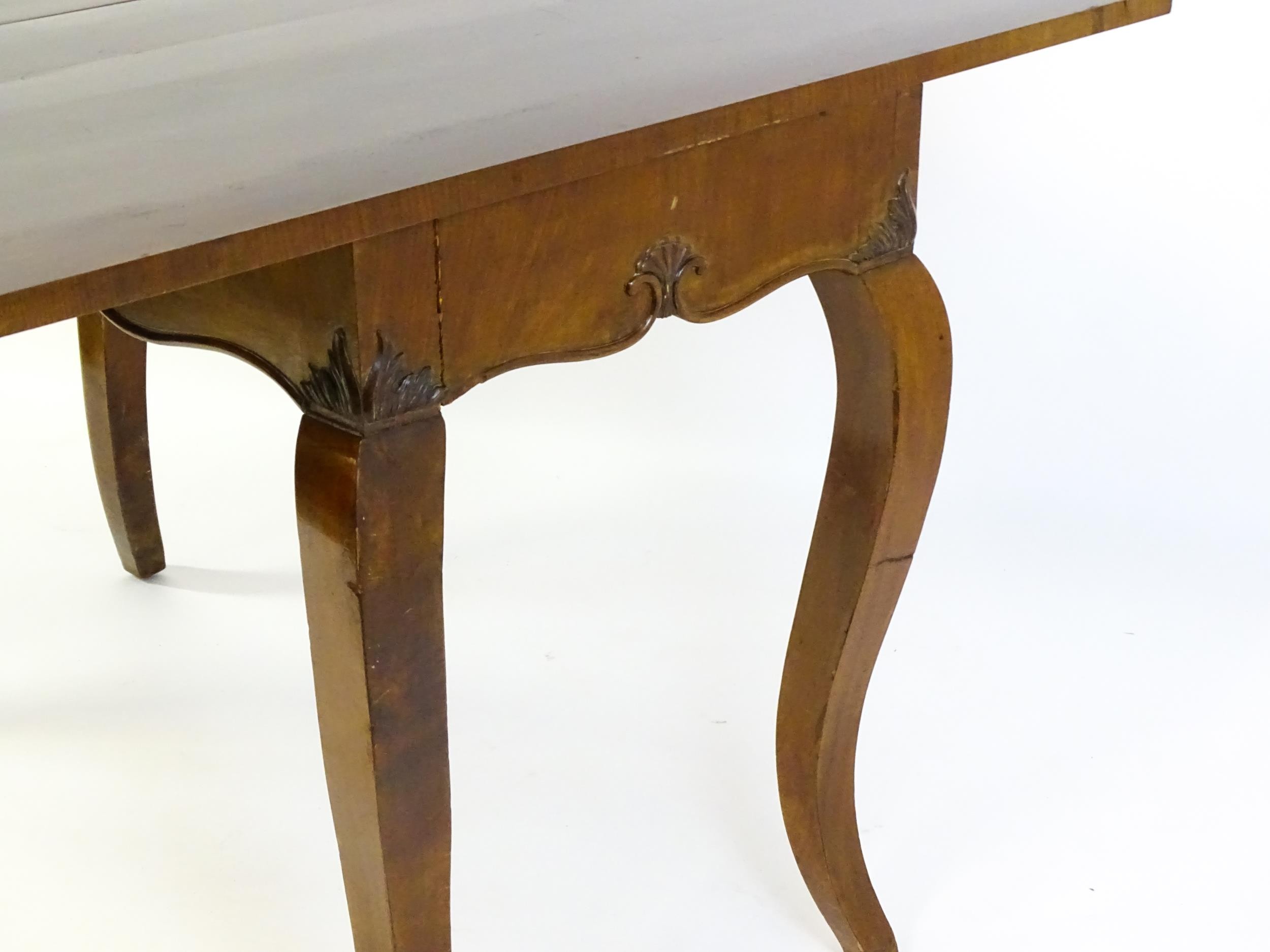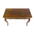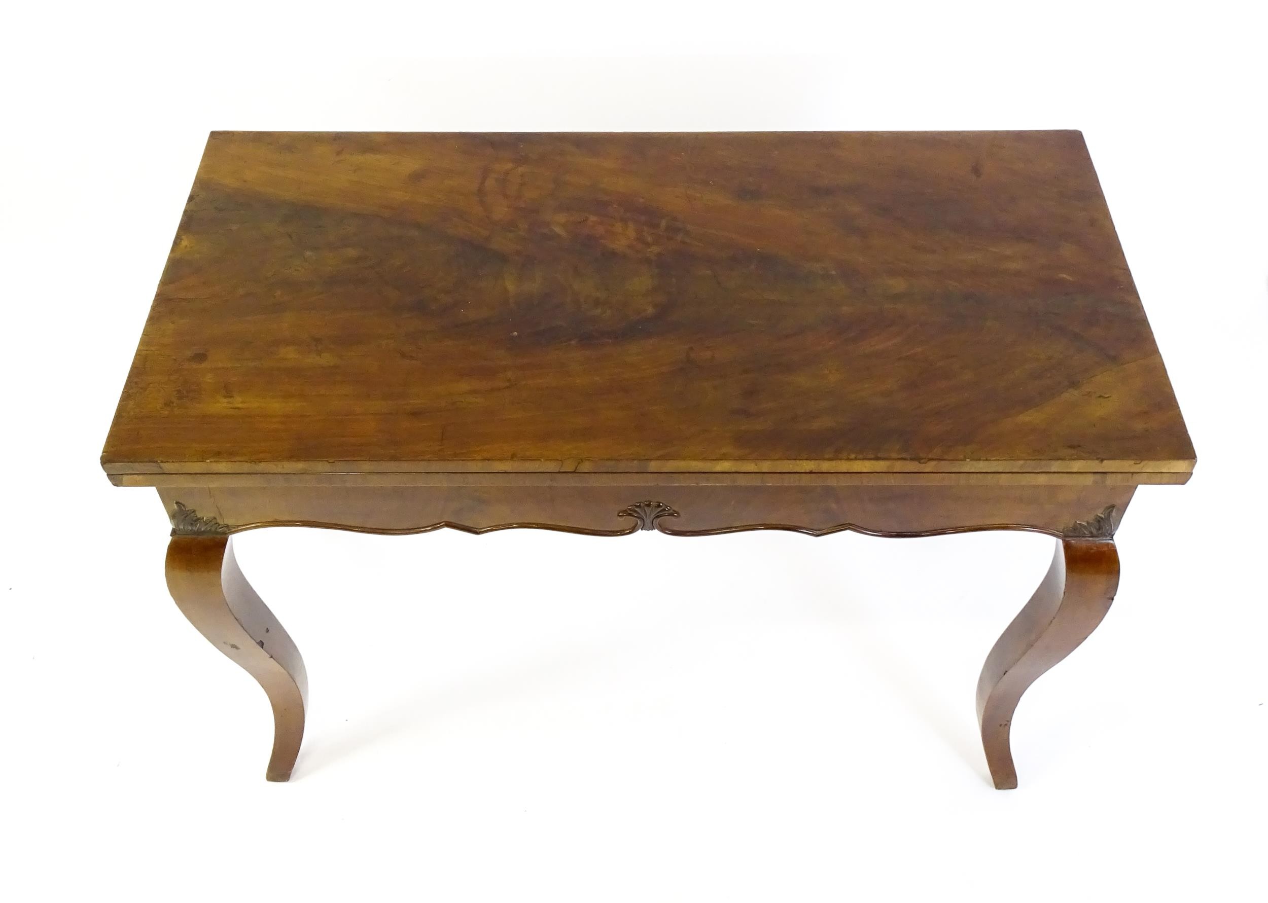 An early 20thC mahogany tea table of large proportions, the hinged rectangular top above a shell carved apron and four cabriole legs. 45" wide x 22" deep x 32" high.