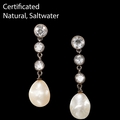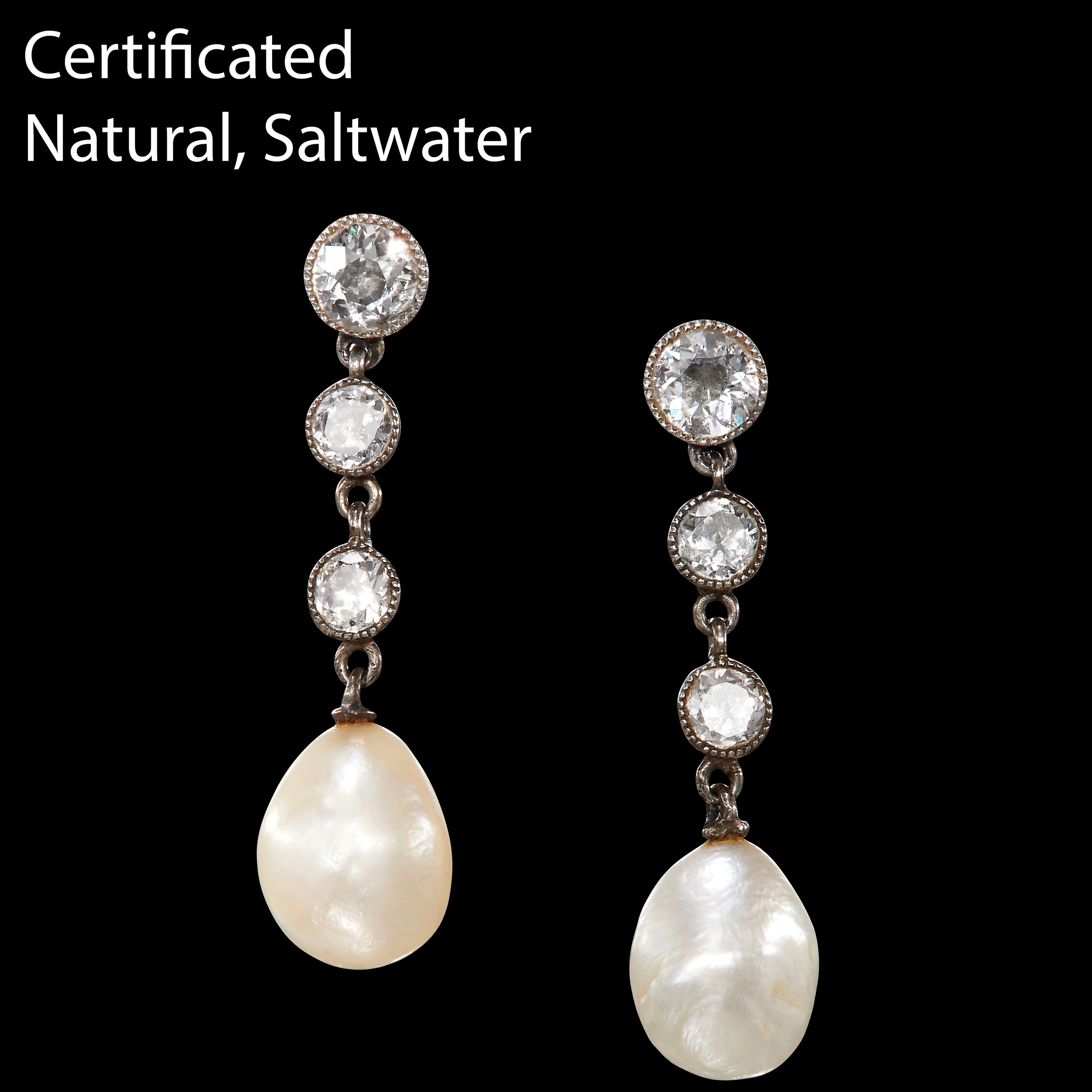 PAIR OF CERTIFICATED NATURAL SALTWATER PEARL AND DIAMOND DROP EARRINGS, Bright and lively diamonds, each suspending a natural pearl drop. L. 2.5 cm. 1.9 grams. Accompanied by GCS London report No. 5783-2692 Stating that the 8.1 x 6.6 - 5.2 mm. and the 8.0 x 6.2 - 5.4 mm. pearls are Natural, Saltwater Silver white, Orient overtone.