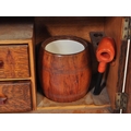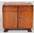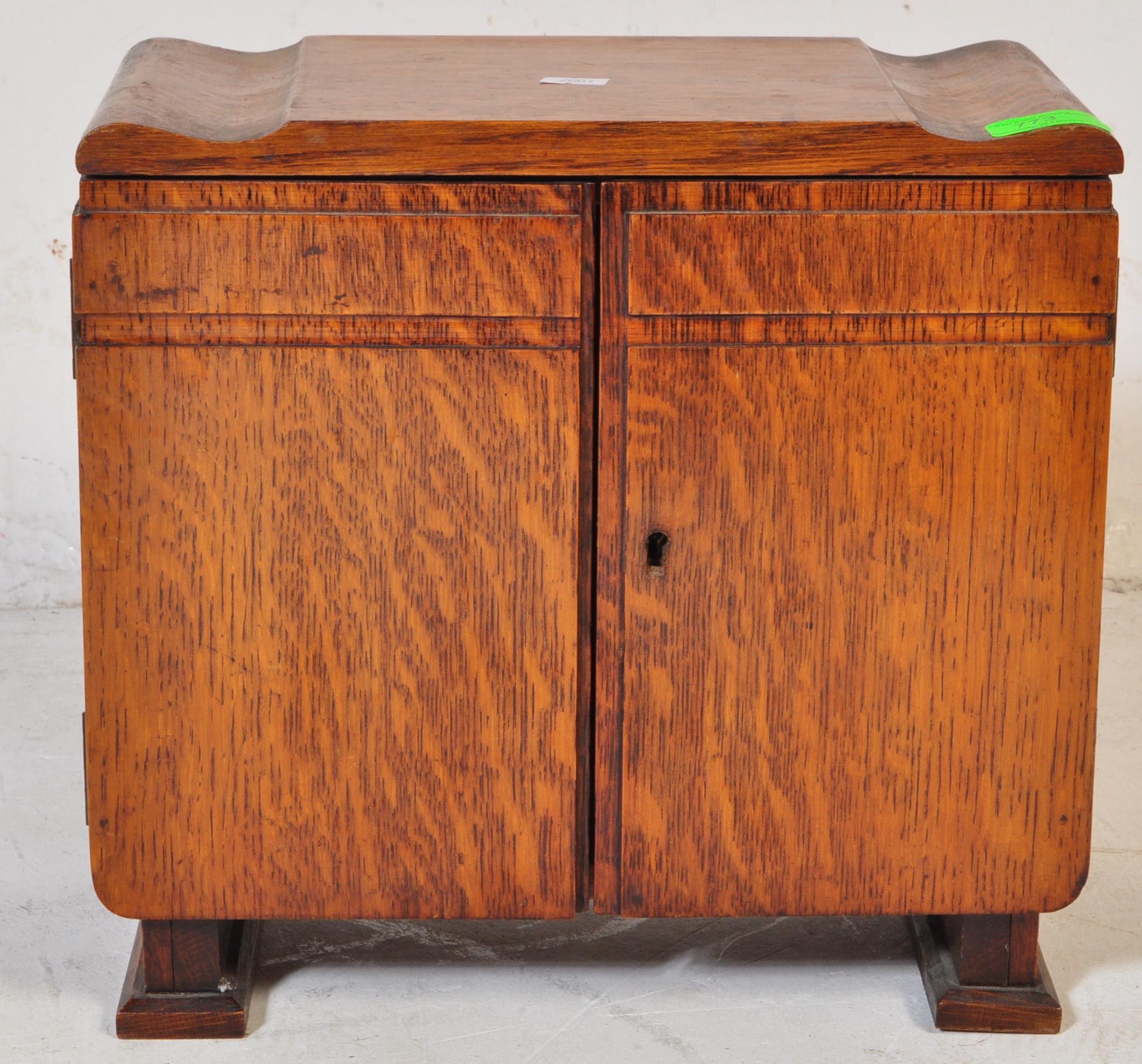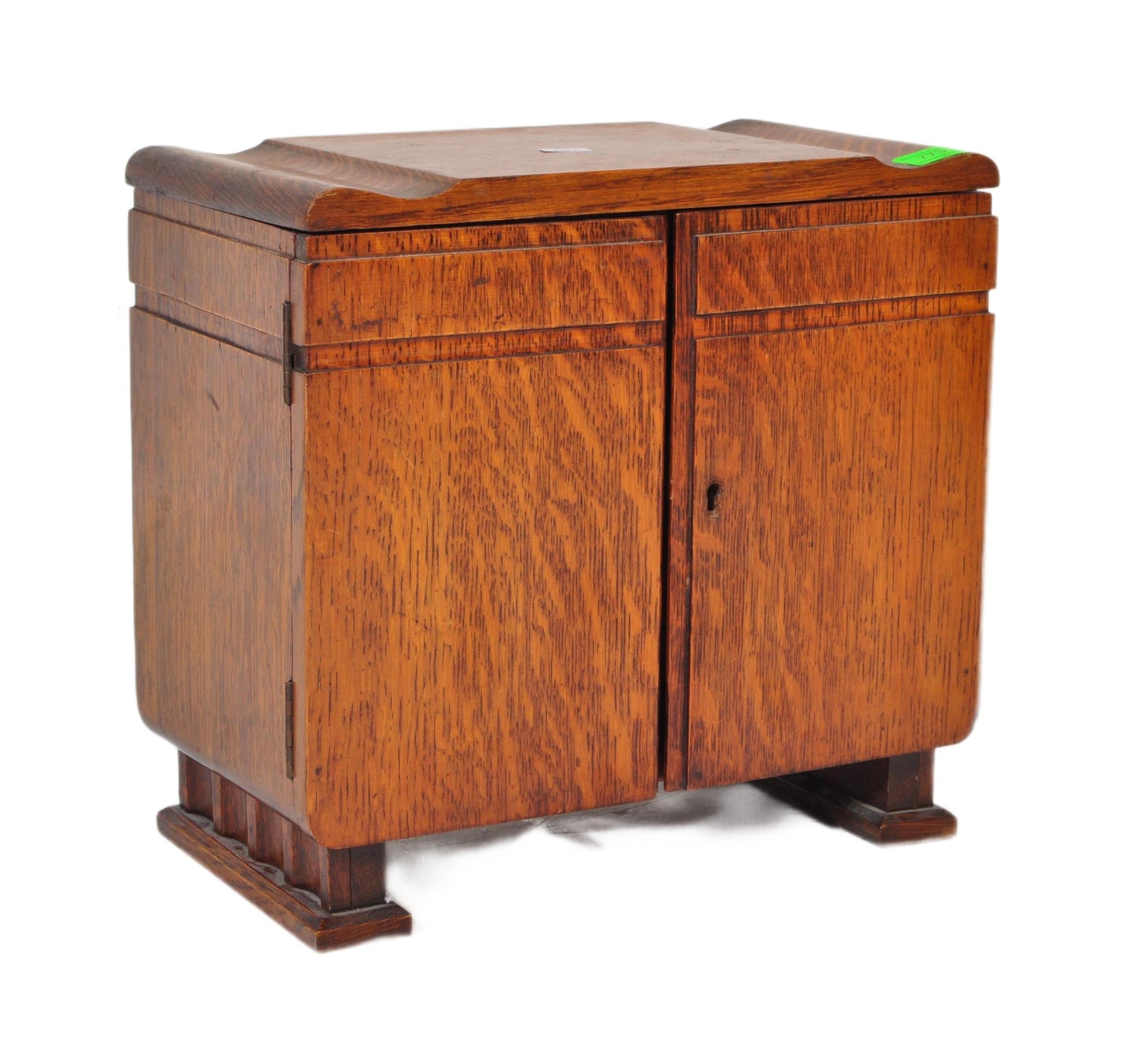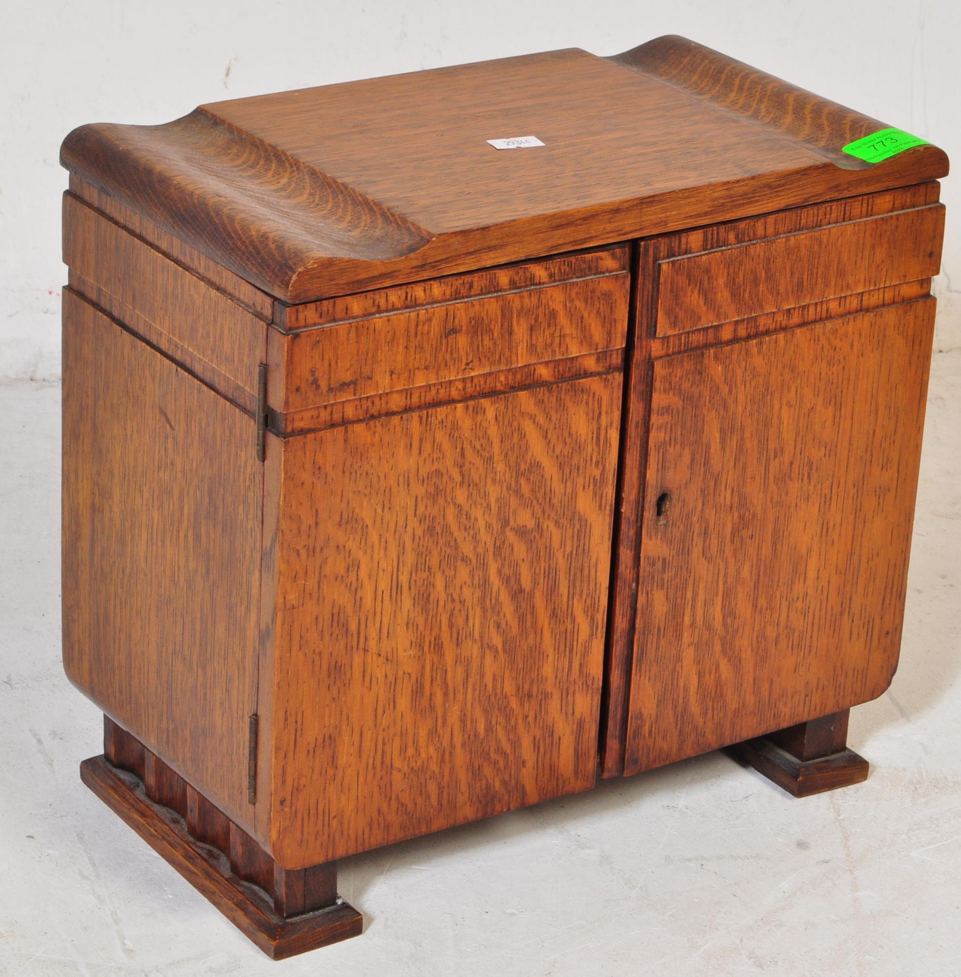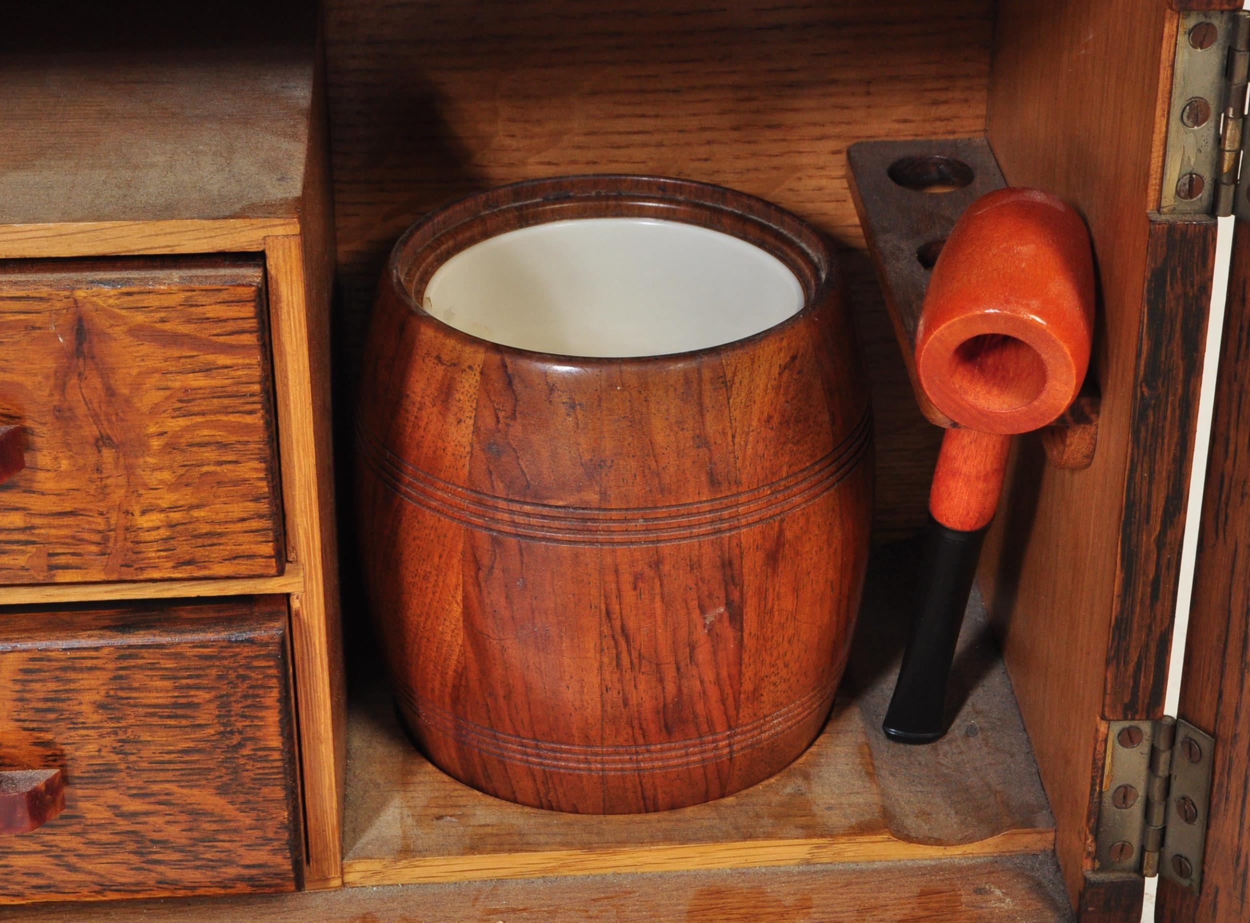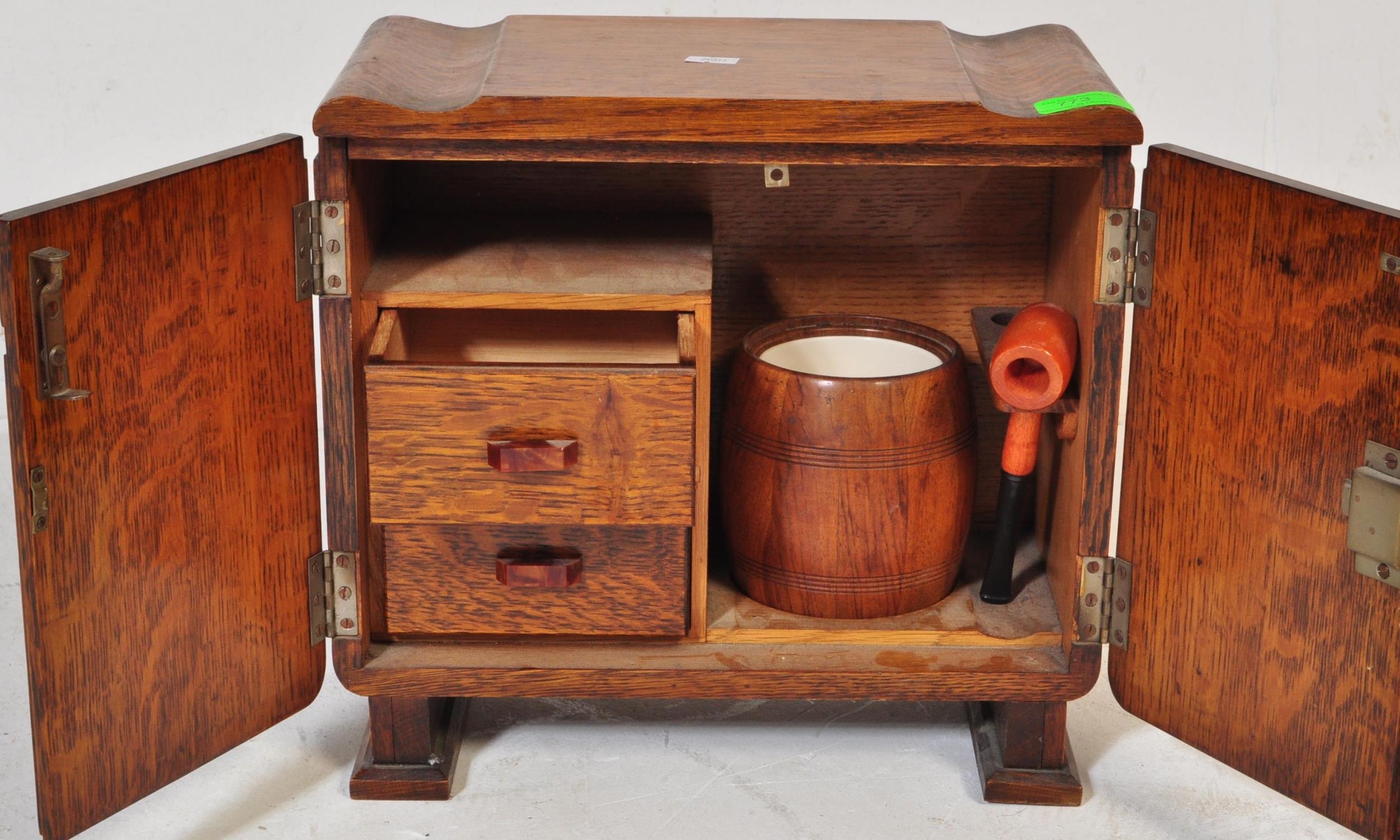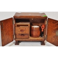 A vintage 20th century circa. 1930's art deco smokers / tobacco cabinet oak cabinet of stepped form. The interior having two drawers, each with bakelite handles, a turned wood tobacco caddy jar and pipe rack with a single American 'corn cob' pipe.