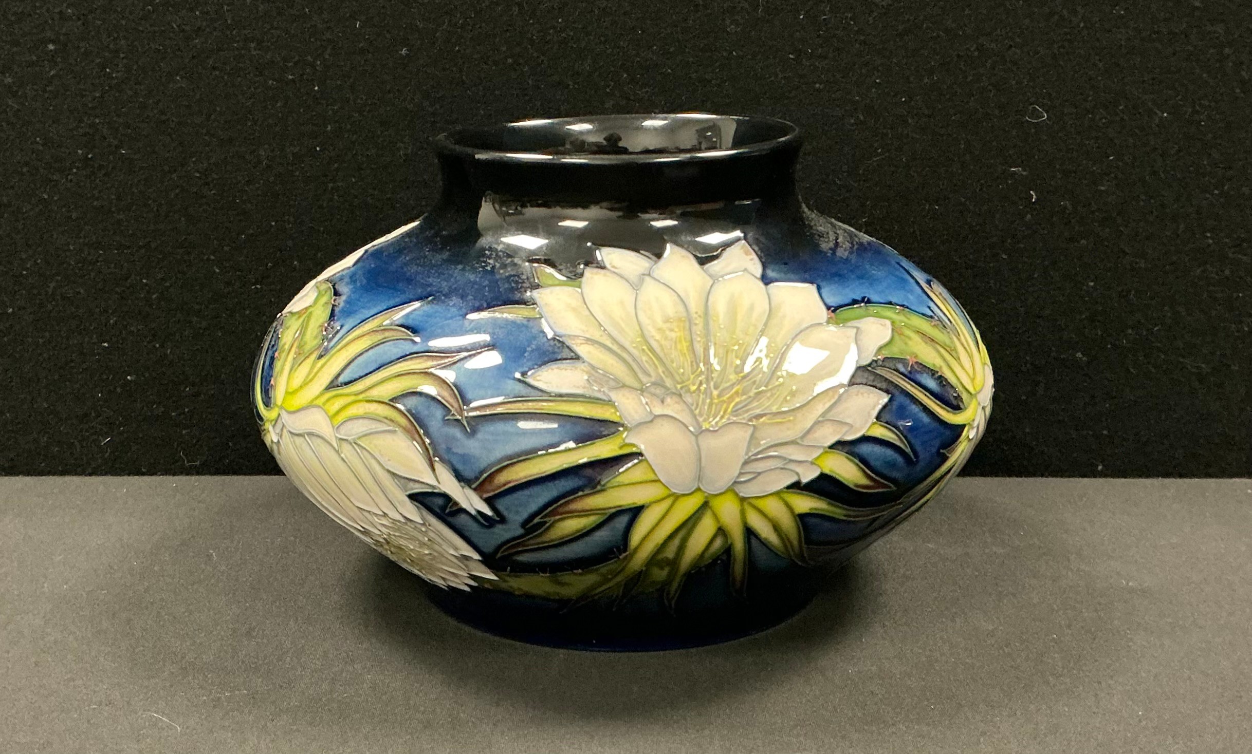A Moorcroft compressed ovoid vase, Queen of the Night pattern, designed by Anji Davenport, tube lined with flowering cactus, in polychrome, 11cm high, impressed and painted marks, signed, c.2001