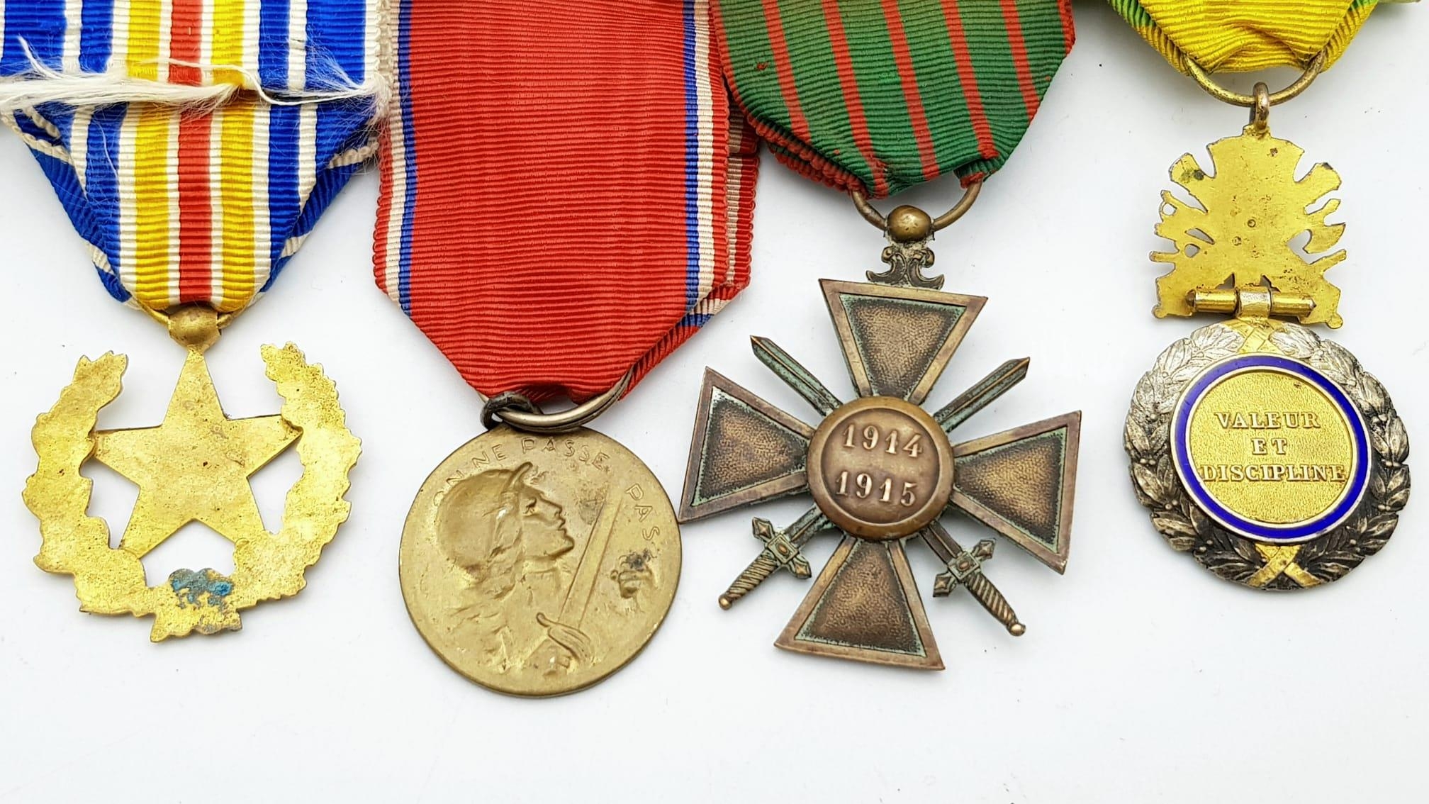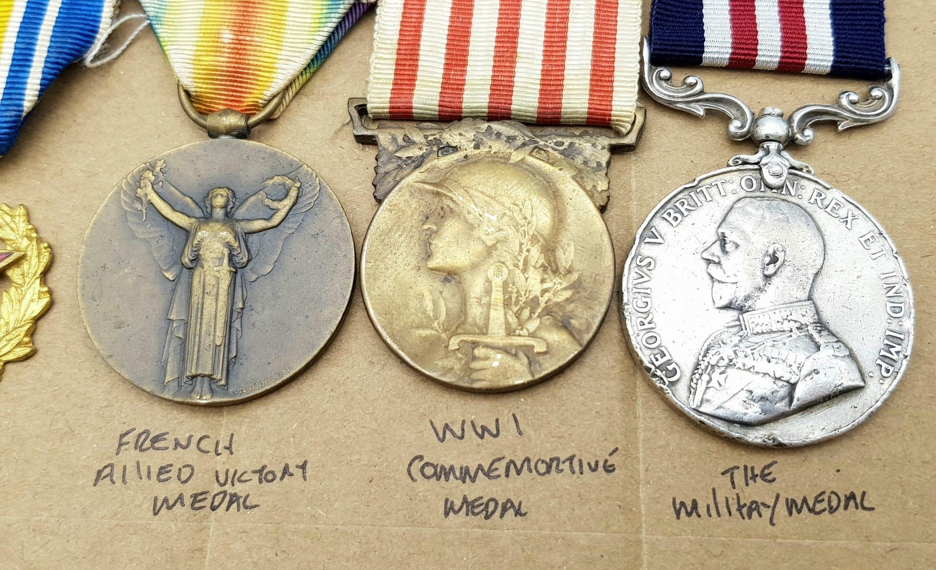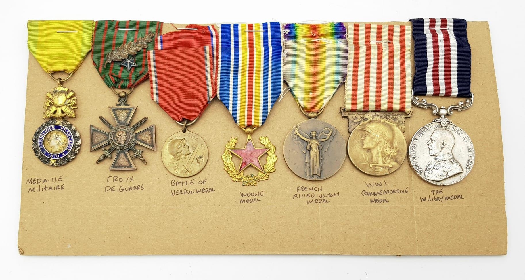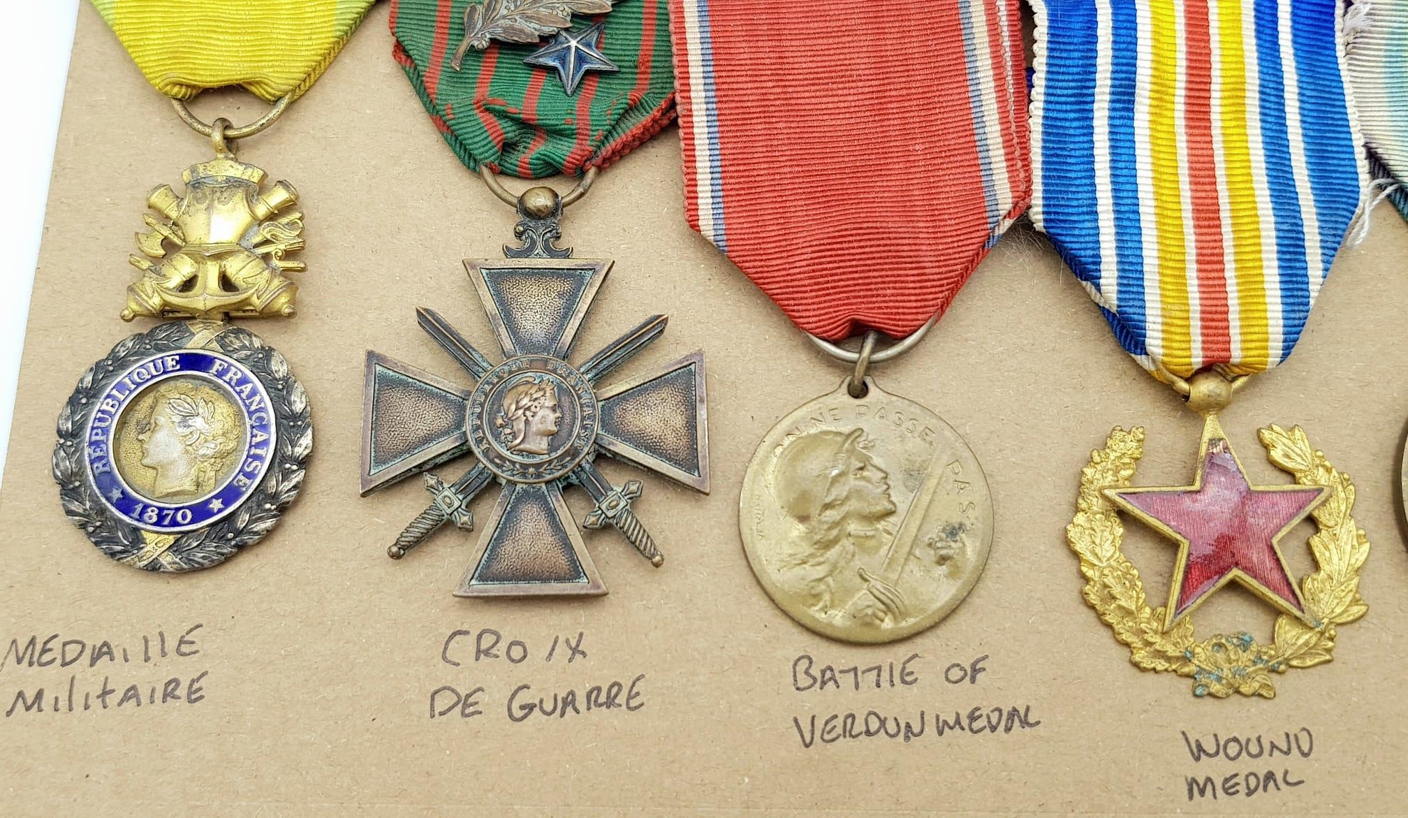 WW1 Military Medal Group awarded to a French soldier for his actions above and beyond the call of duty during the Battle of Verdun. The group consists of a Medaille Militaire, Croix De Guerre 1914-15, Battle of Verdun Medal, War Wounded Medal, French Allied Victory Medal, WW1 Commemorative Medal.