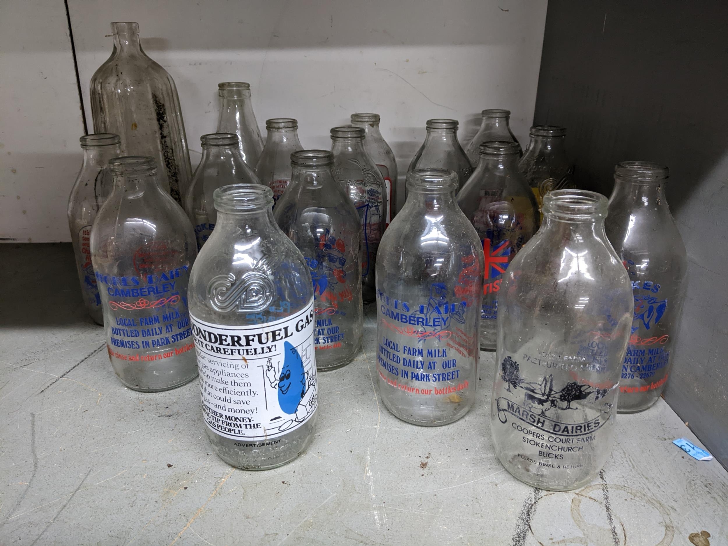 A group of vintage glass milk bottles, some from local dairies, to include Stokes Dairy Camberley and Marsh Dairies Stokenchurch Location:G