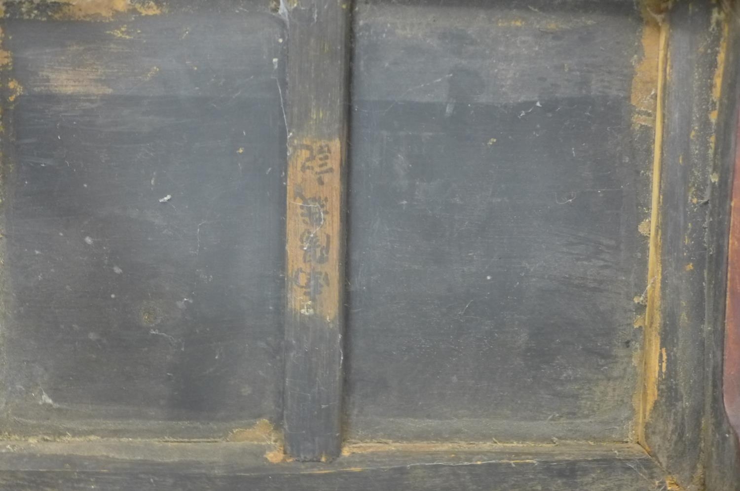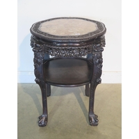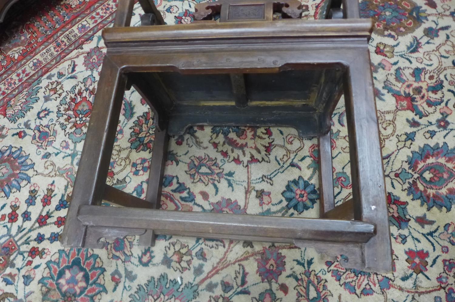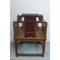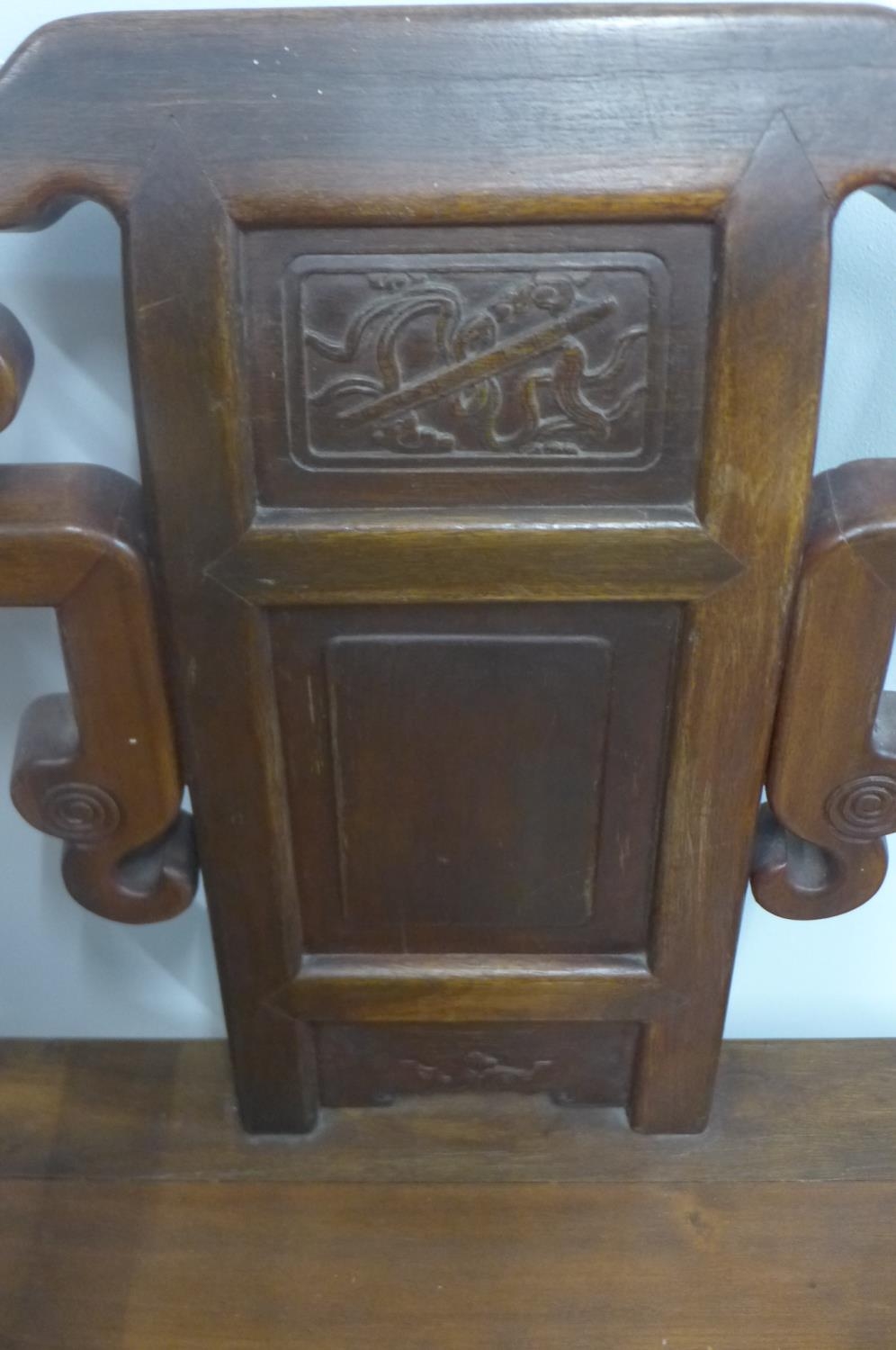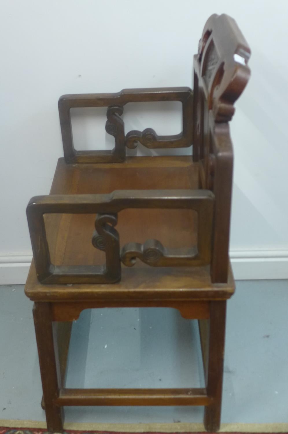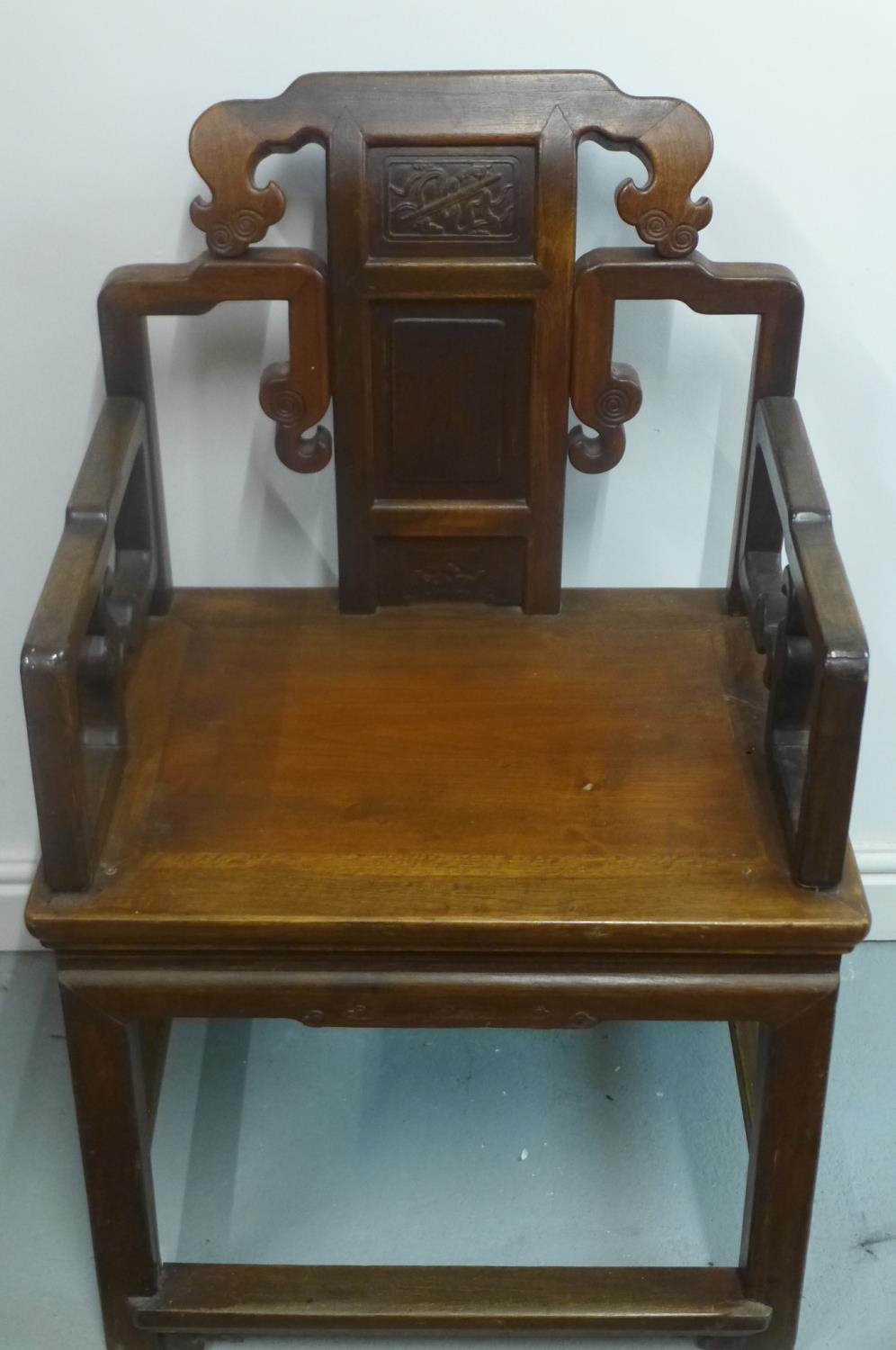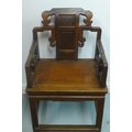 A carved hardwood Chinese open armchair with solid seat, 96cm H x 60cm x 46cm