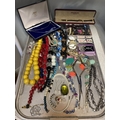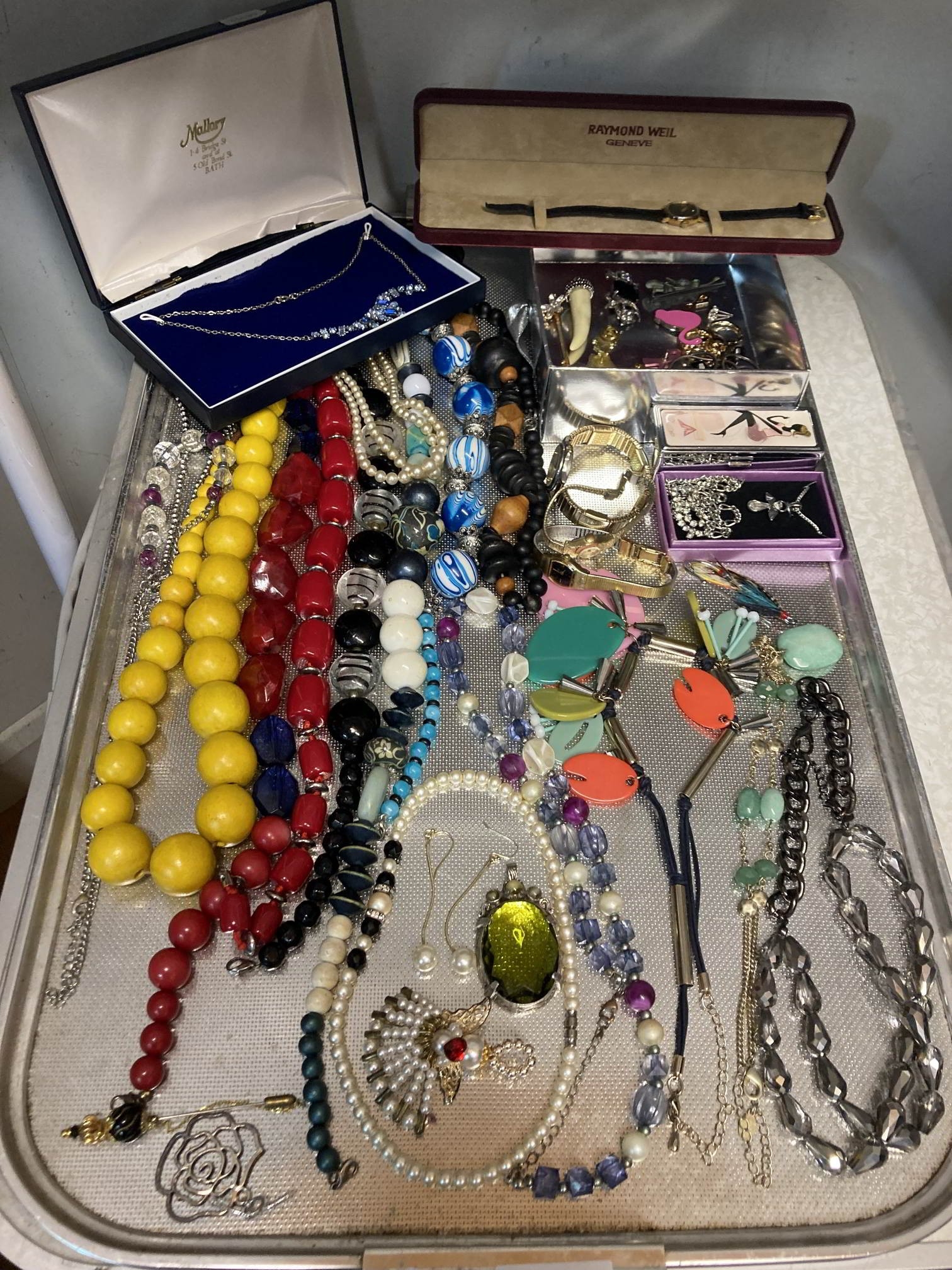Tray of costume jewellery & 4 ladies watches inc. simulated pearls, bead necklaces, Raymond Weil, Seiko etc. (watches untested)