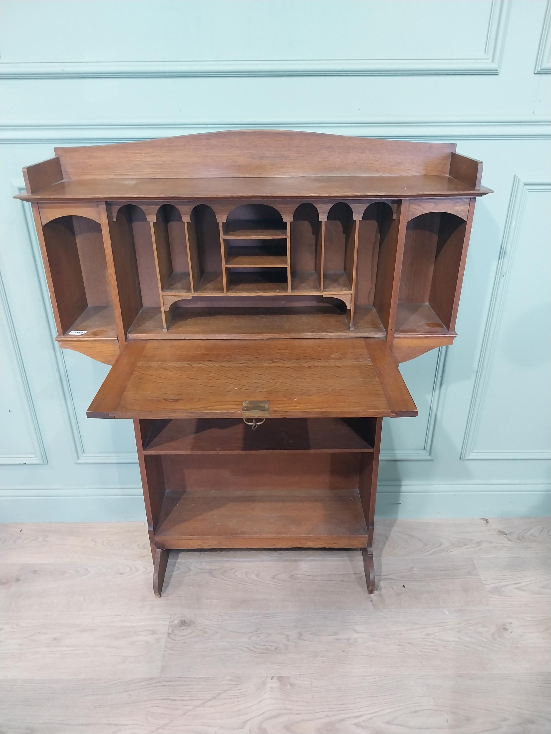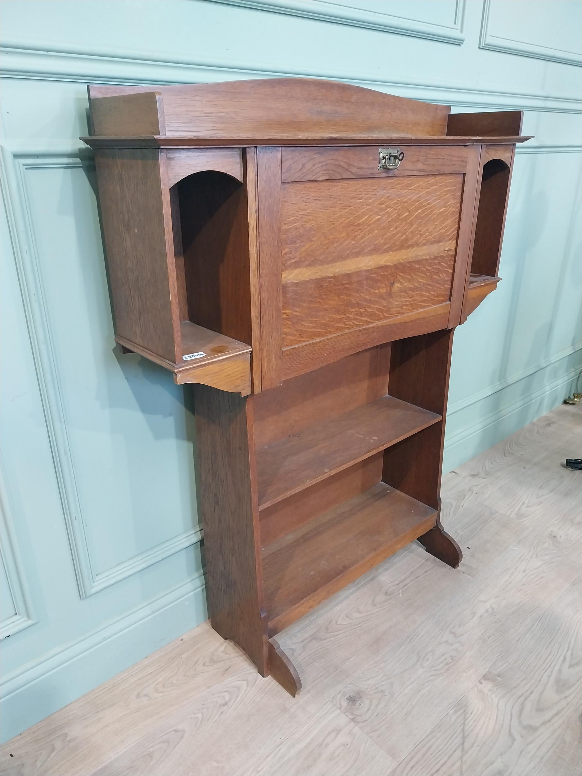 Edwardian oak fold down desk with open bookshelf. {124 cm H x 98 cm W x 24 cm D}.