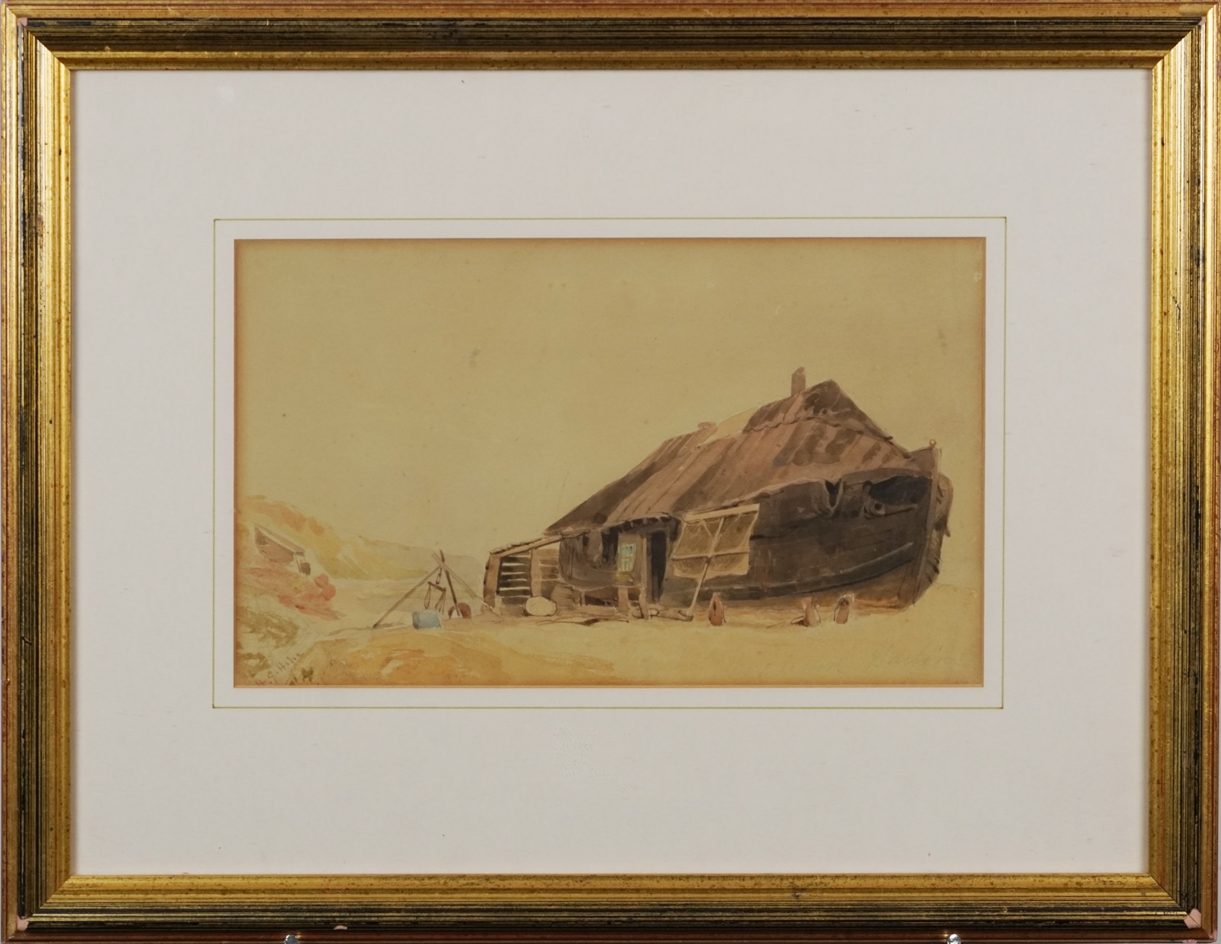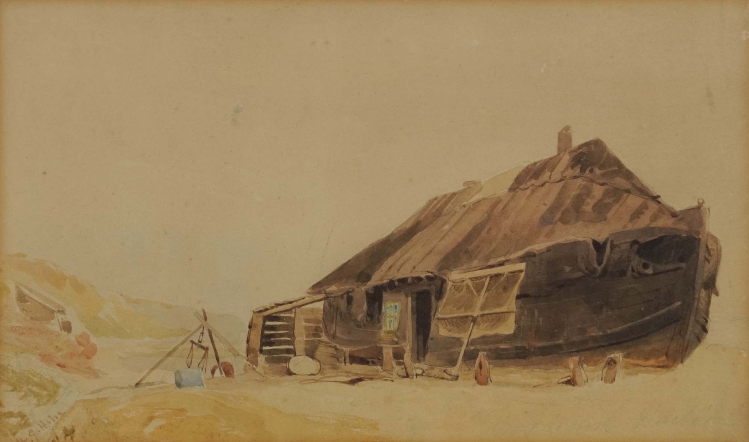 H. G. Hine - House boat on the beach, early 20th century British school watercolour on paper, signed, framed and glazed, 18cm x 30cm.