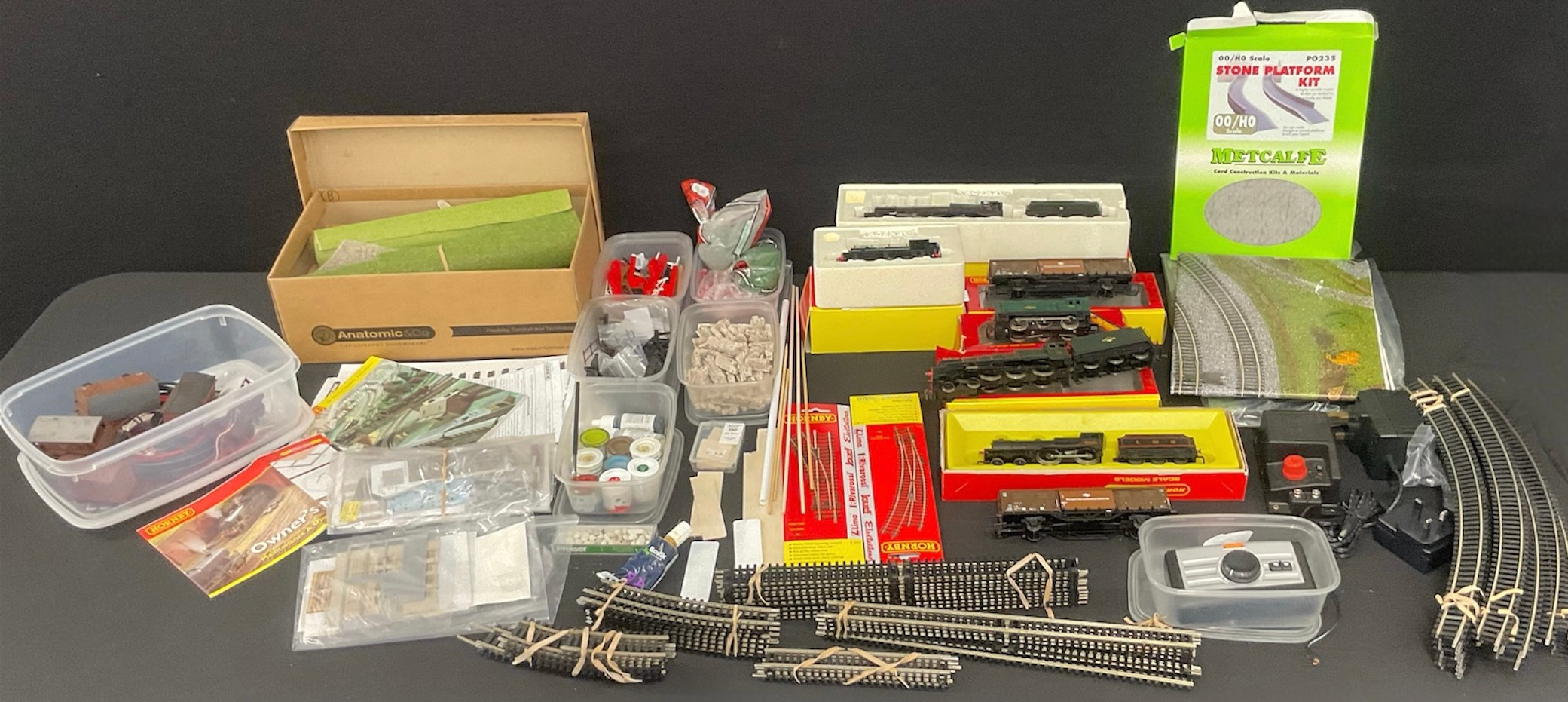 Hornby Model Railways - R2233 GWR 4-6-0 King Class ‘King Stephen’, boxed; another R450 L.M.S. 4-4-0 Class 2P Fowler Locomotive, boxed; others, R2326 BR 0-6-0ST Class J94 Locomotive, boxed; R156 Class 08 Diesel Shunter, boxed, etc; a large quantity of track, scenery and DIY materials (qty)