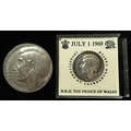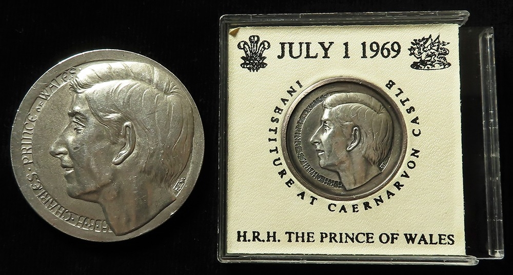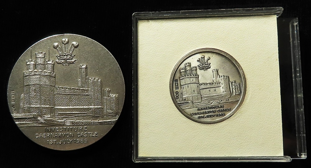 British silver Commemorative medals (2), both relate to HRH The Prince of Wales's Investiture, 1st. July 1969, both medals are hallmarked T&S Birm. 1968, small medal measure 31mm in diameter, the larger one measures 50mm in diameter, total weight of silver 92.5gms.