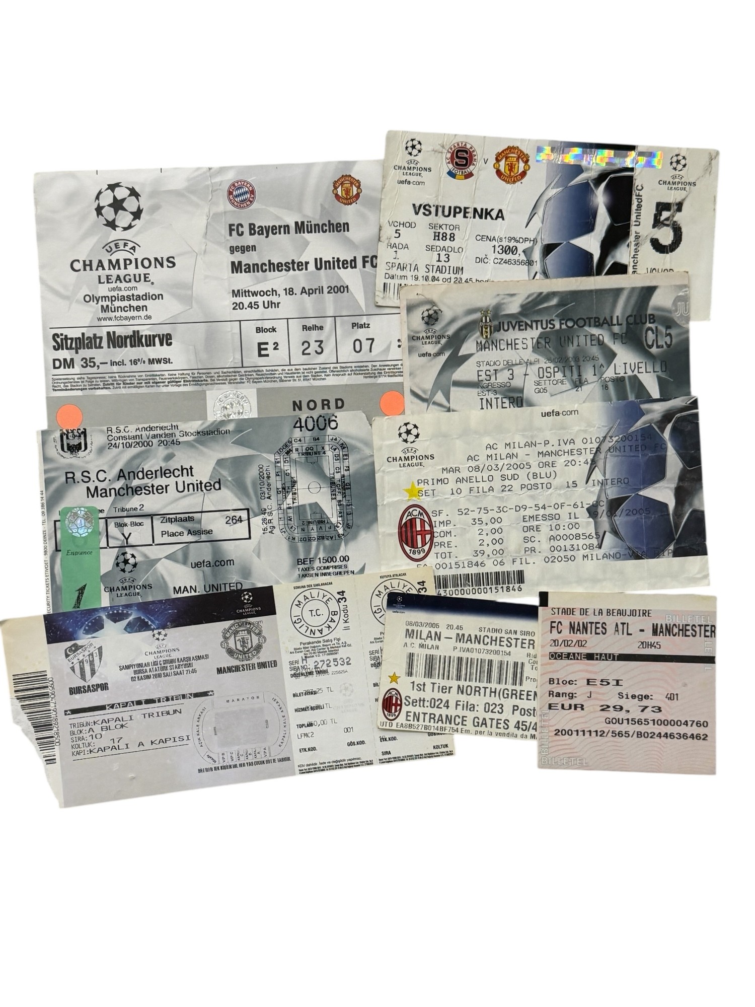 COLLECTION OF MANCHESTER UNITED EUROPEAN AWAY FOOTBALL TICKET STUBS, 8 IN TOTAL, BURSASPOR/ JUVENTUS/ MILAN/ SPARTA PRAHA/ NANTES/ ANDERLECHT/ MUNICH.
