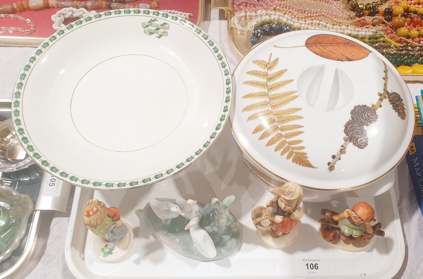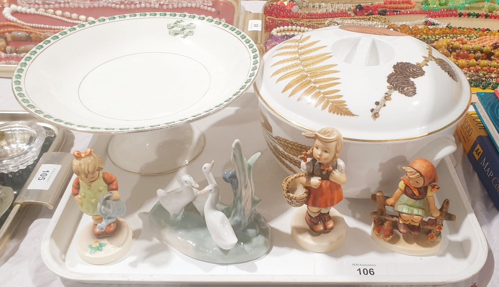 A Royal Worcester "Evesham" pattern tureen, a vintage comport relating to St Jame's U.M. Church, Luddenden, dated 1924 together with three Hummel figures and a Nao group of geese. No shipping. Arrange collection or your own packer and shipper, please.