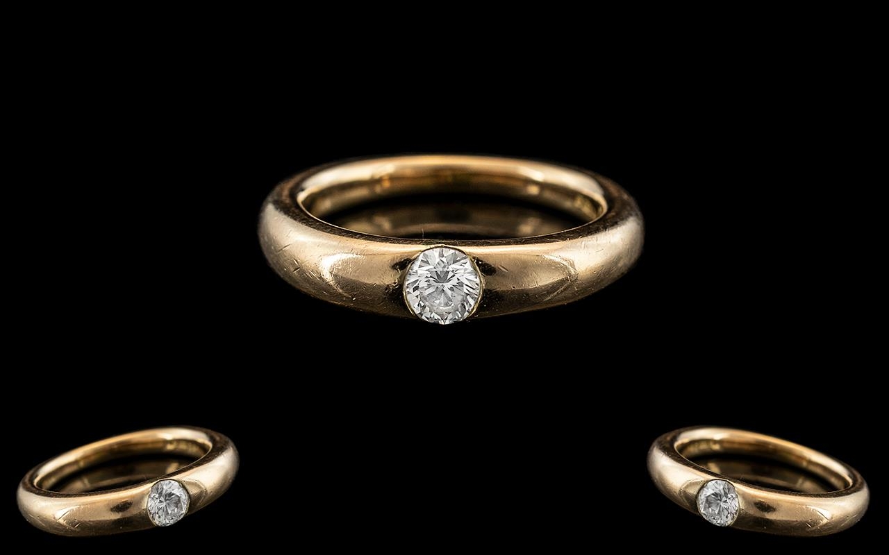 Boodles Style Gents Heavy 18ct Gold - Top Quality Single Stone Diamond Ring, Wedding Band Design. The Round Brilliant Cut Diamonds of Top Colour / Clarity. Est Diamond Weight 0.47 pts. Colour - Est F-G, Clarity VVS2. Ring Size Q. Gold Weight 8.7 grams. As New Condition.