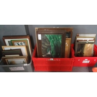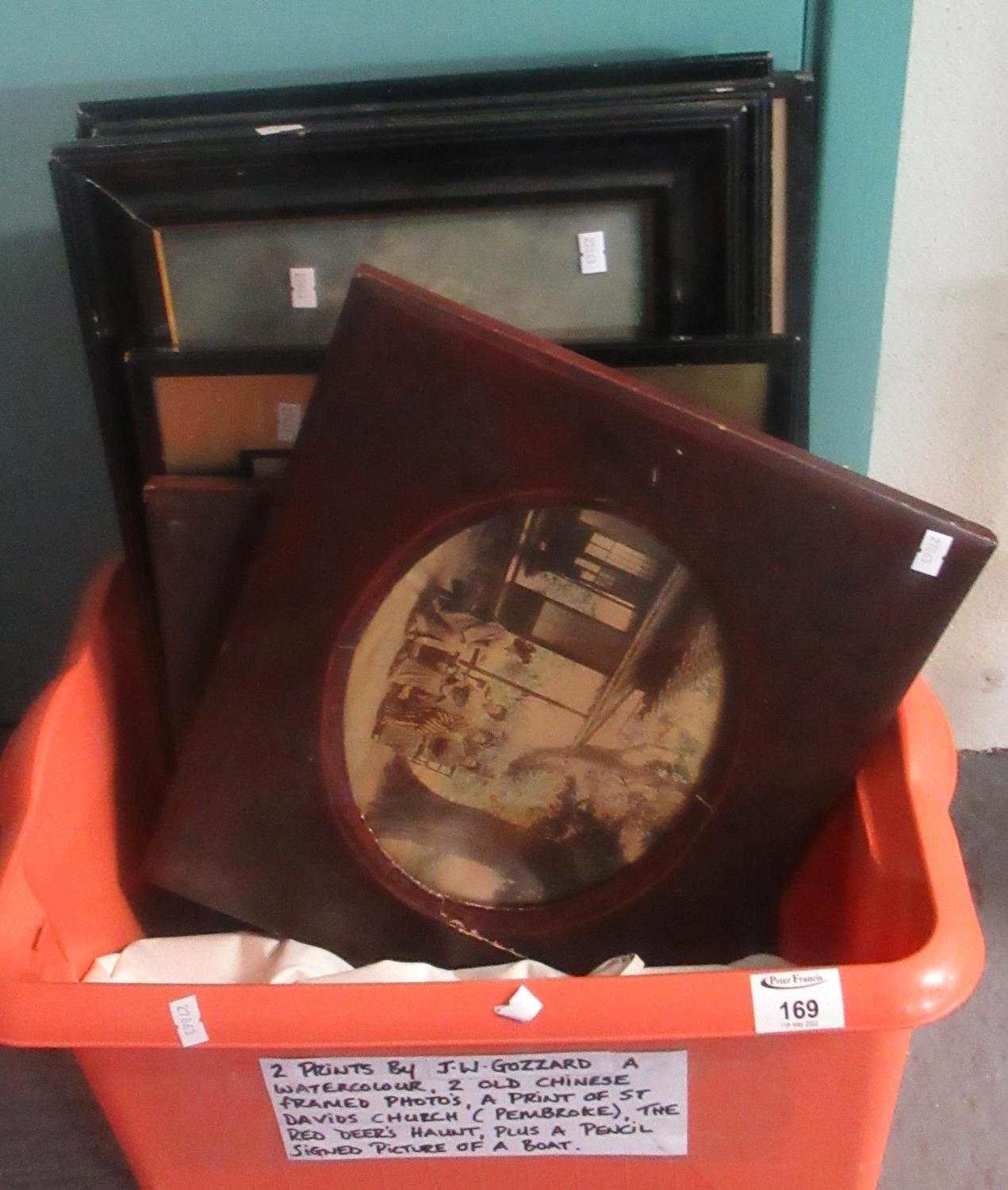 Box of assorted furnishing prints including after Goddard, Chinese photographs, Welsh topographical studies, etc.