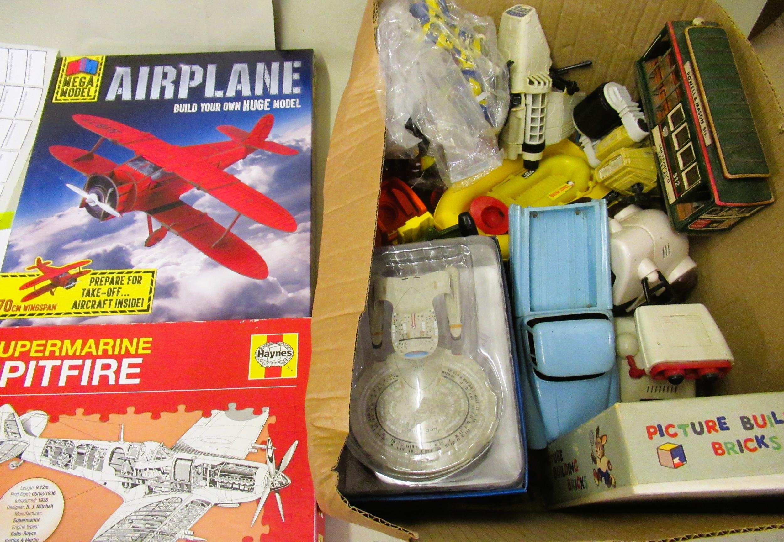 Box containing a quantity of various children's plastic toys and figures including two Star Wars toys, Tomy battery operated toys etc.