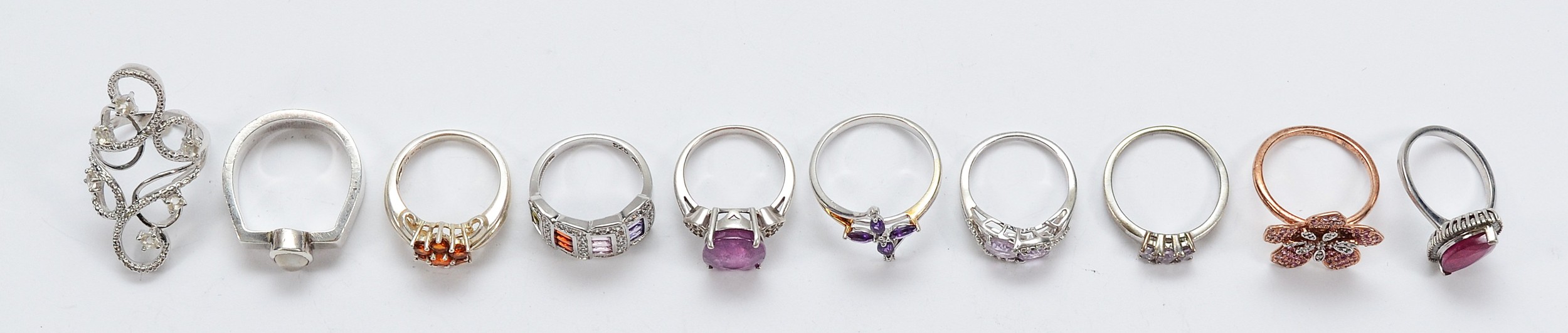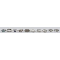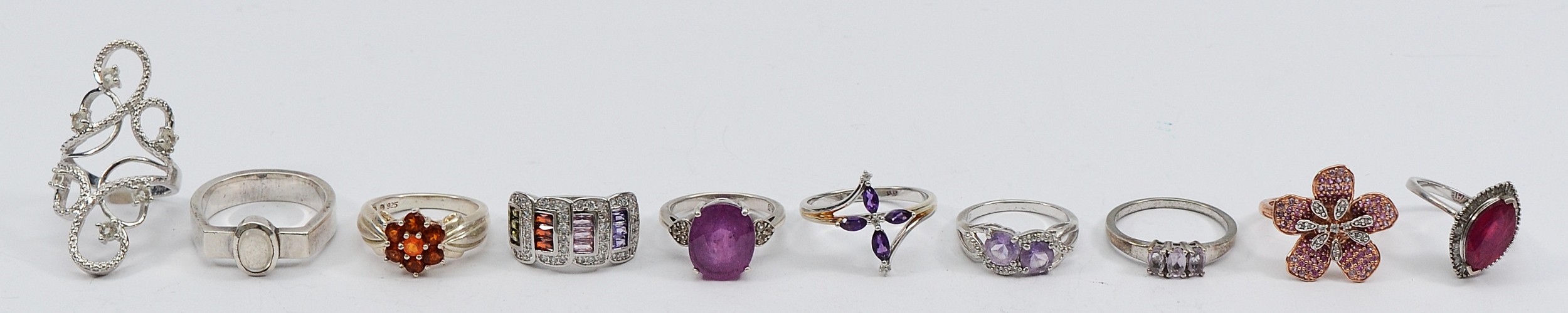 Ten 925 silver gemset rings, N-V, 46g