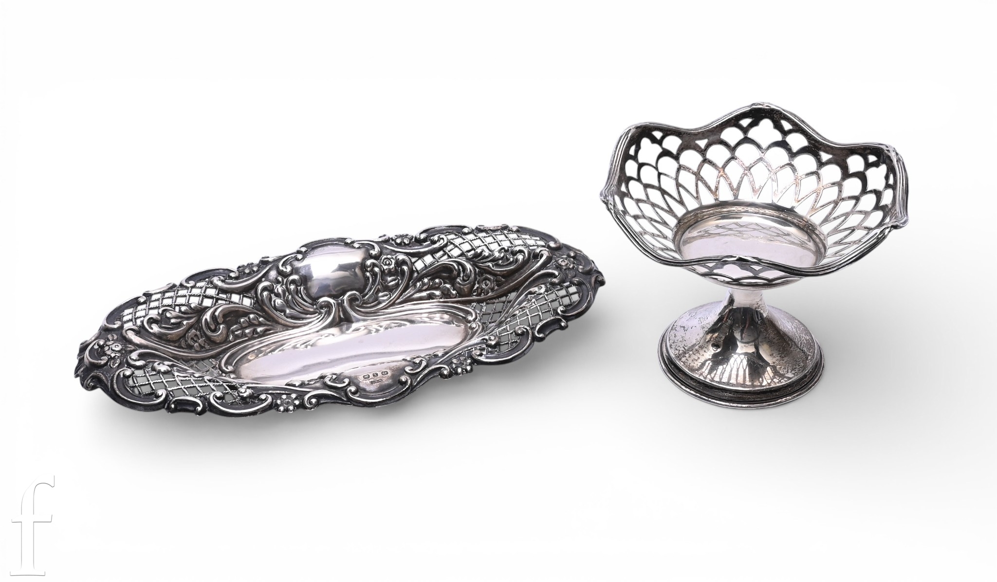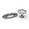 A Victorian silver oval tray with repousse scroll and foliate decoration with openwork decoration, hallmarked Birmingham 1897, length 21cm, together with a silver footed bonbon dish with reticulated decoration to bowl, hallmarked Birmingham 1906, height 8.5cm, total weight 4.5oz. (2)