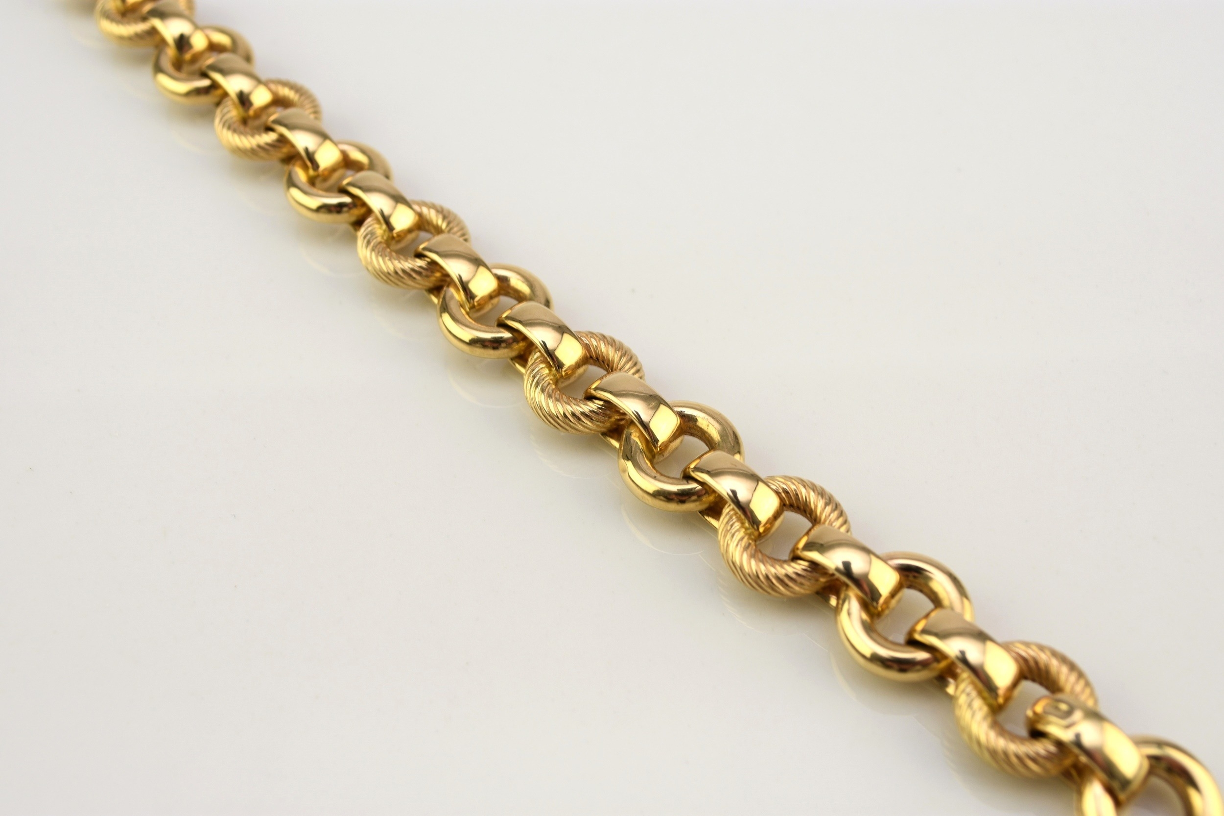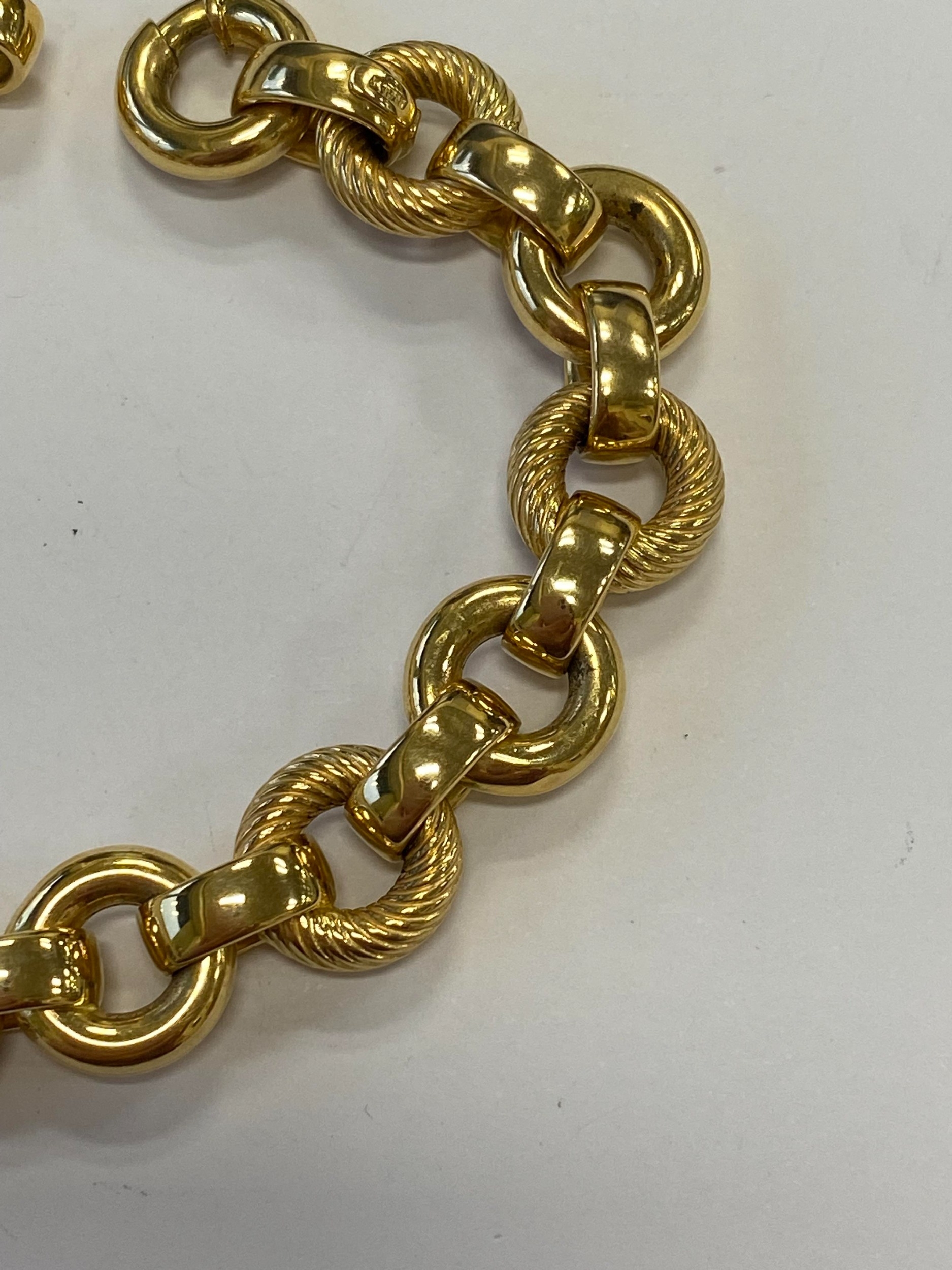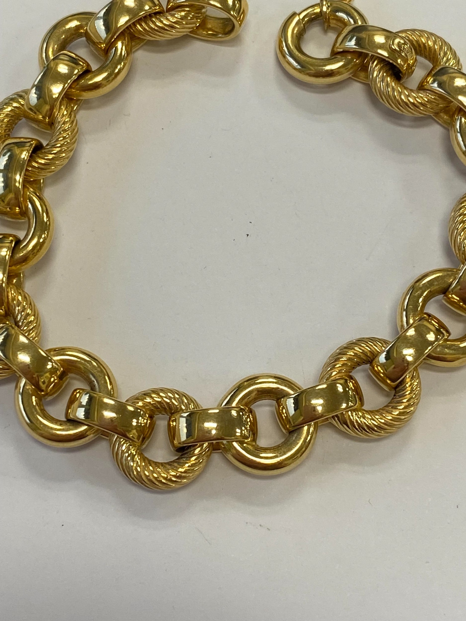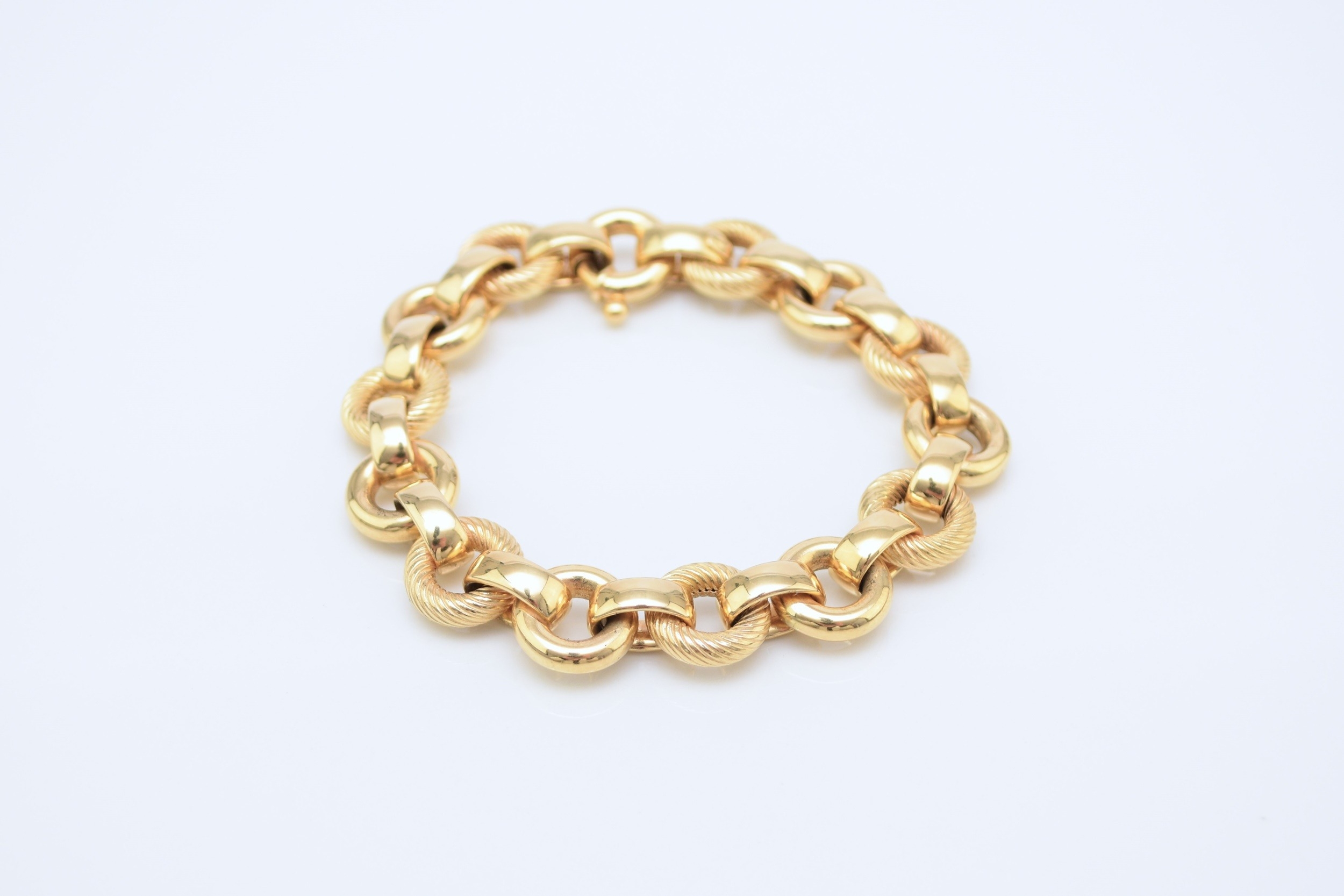 An Italian 18ct yellow gold bracelet, formed of alternating textured and polished hollow circular links with bolt ring clasp, 19.5cm long, weight approx 28.1g Condition:Clasp in good working order and secure, a couple of very small dings but other than this just general wear, refer to images