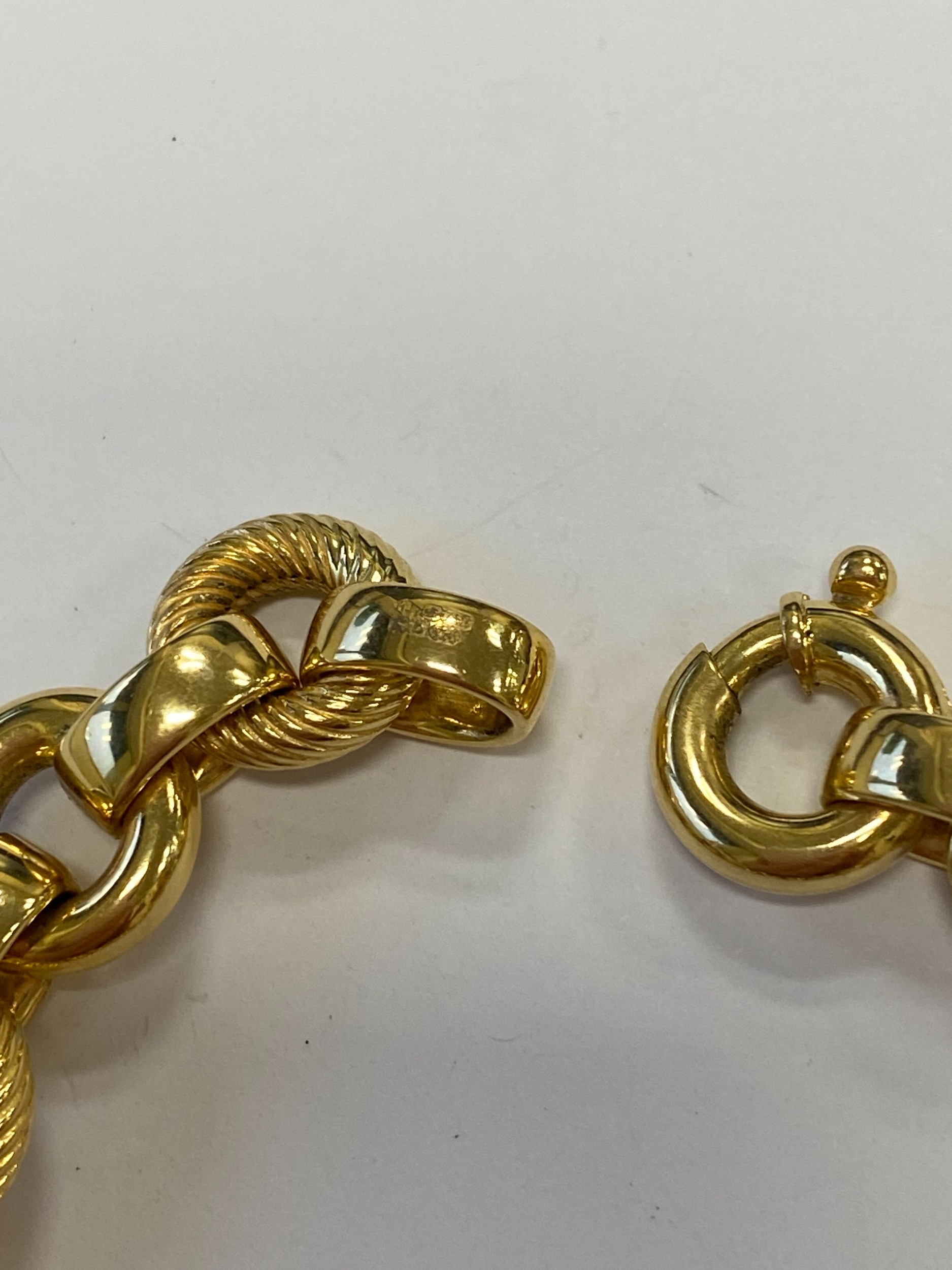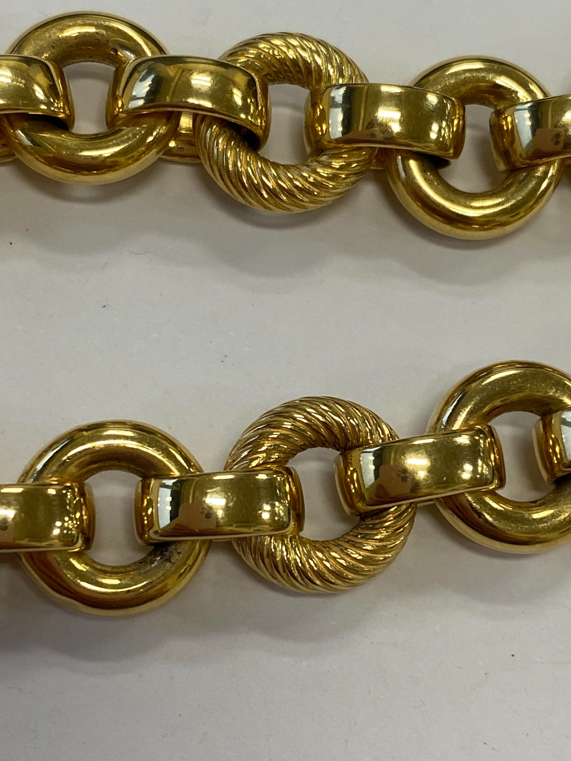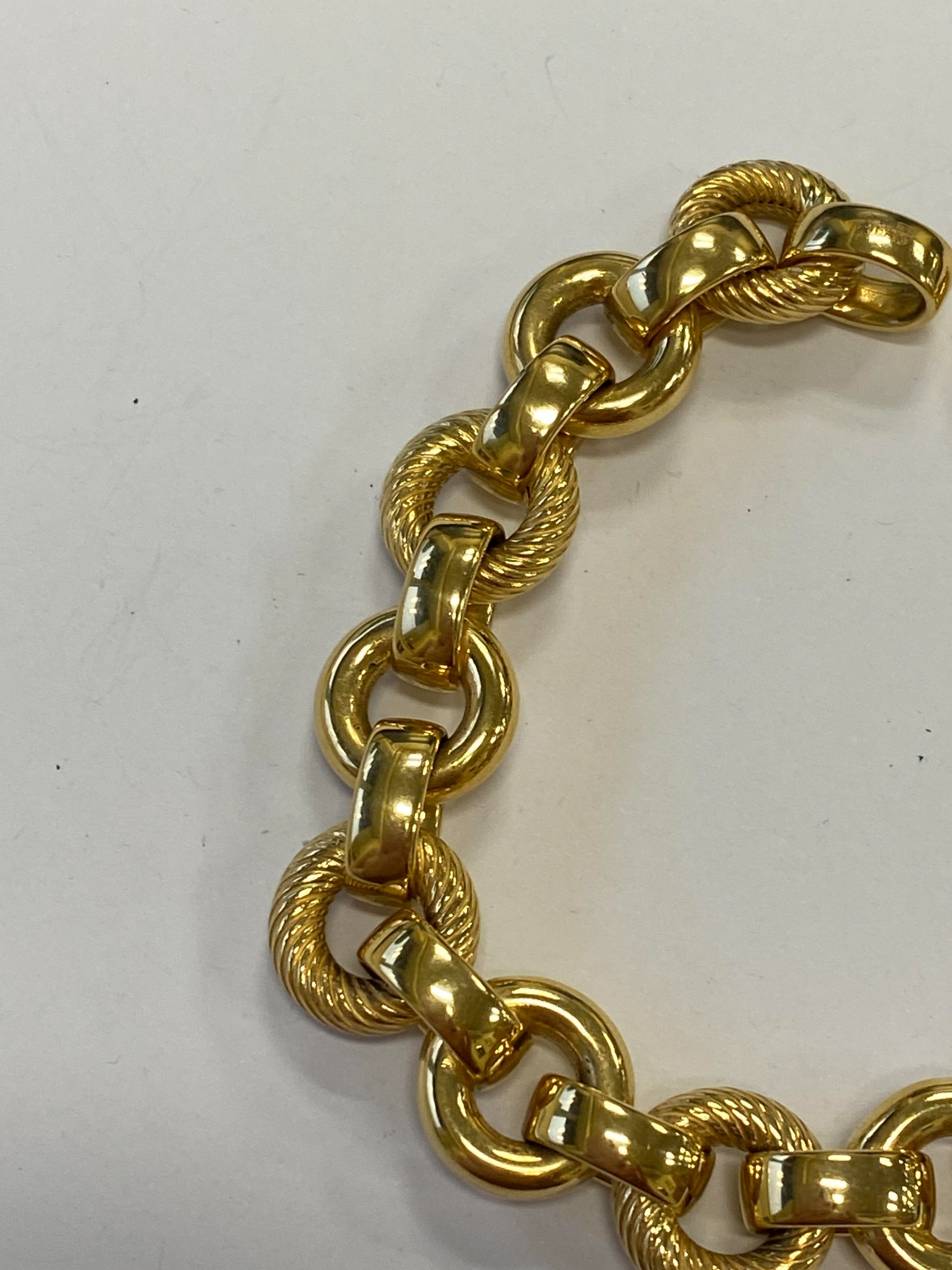 An Italian 18ct yellow gold bracelet, formed of alternating textured and polished hollow circular links with bolt ring clasp, 19.5cm long, weight approx 28.1g Condition:Clasp in good working order and secure, a couple of very small dings but other than this just general wear, refer to images