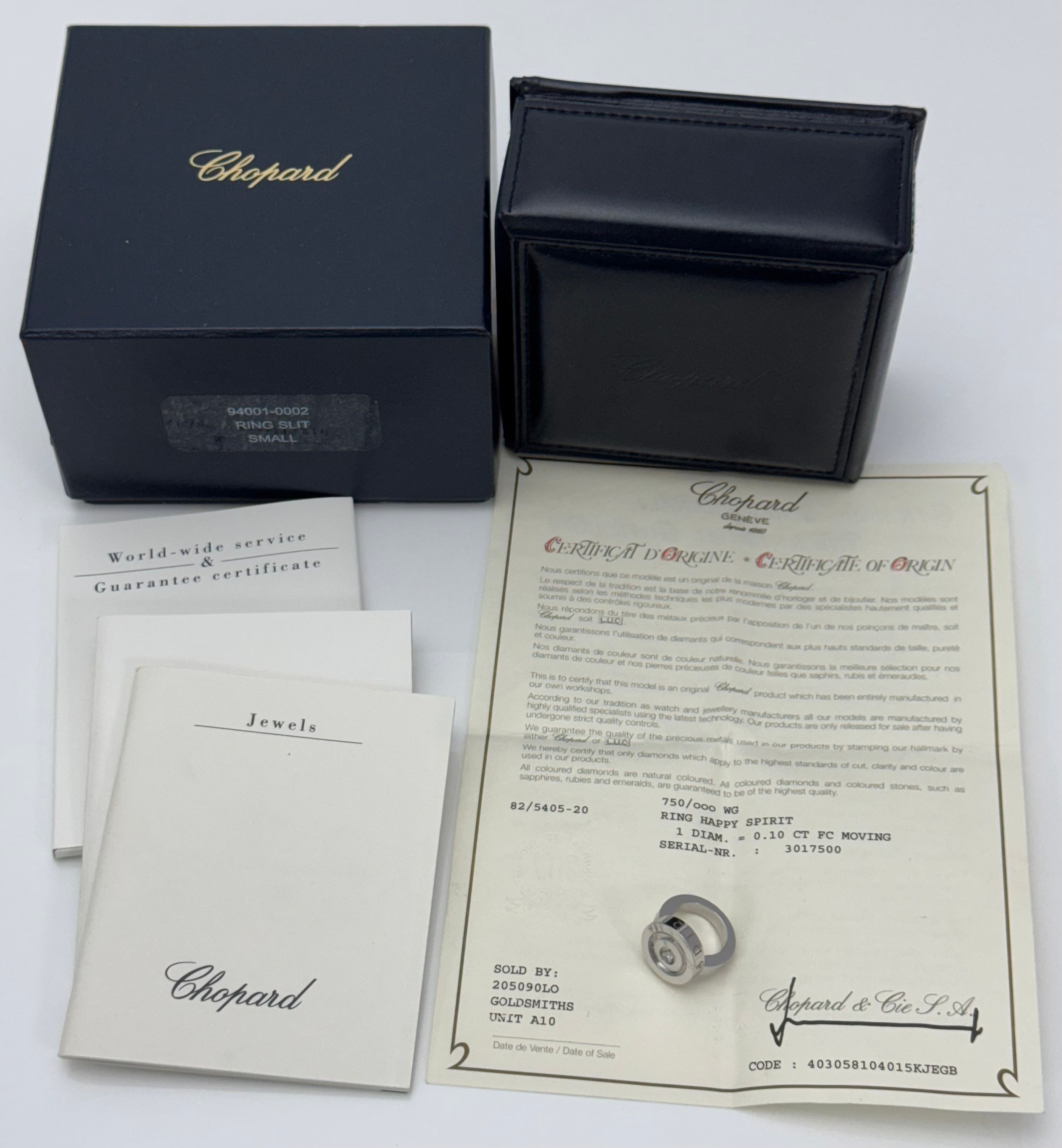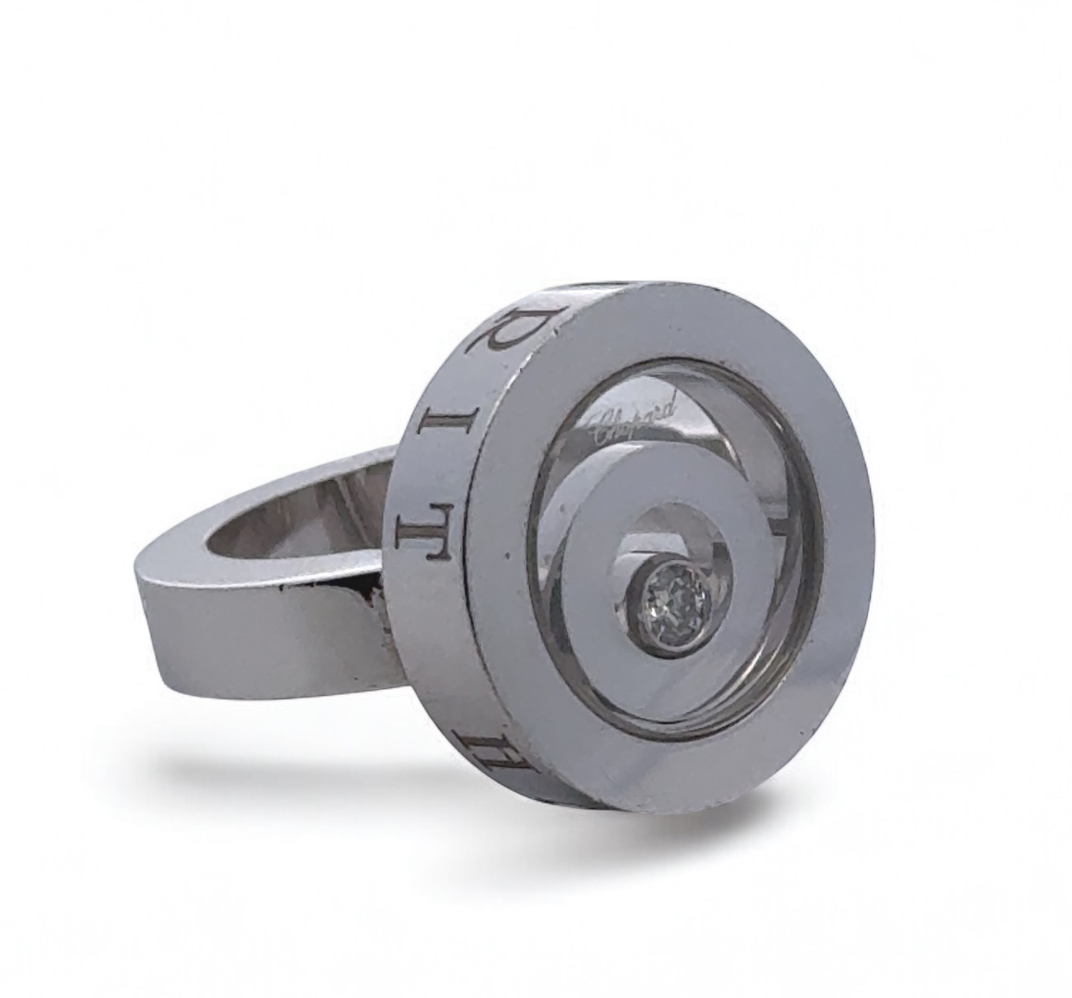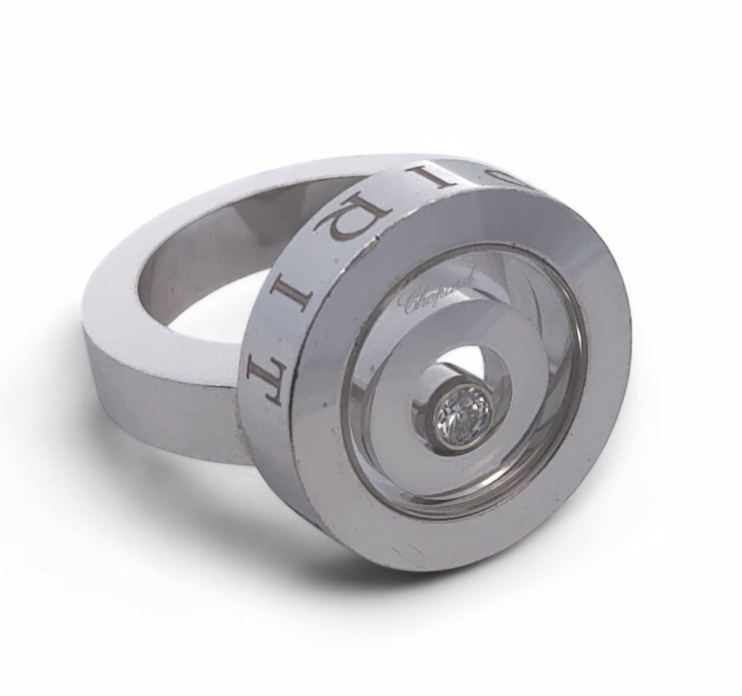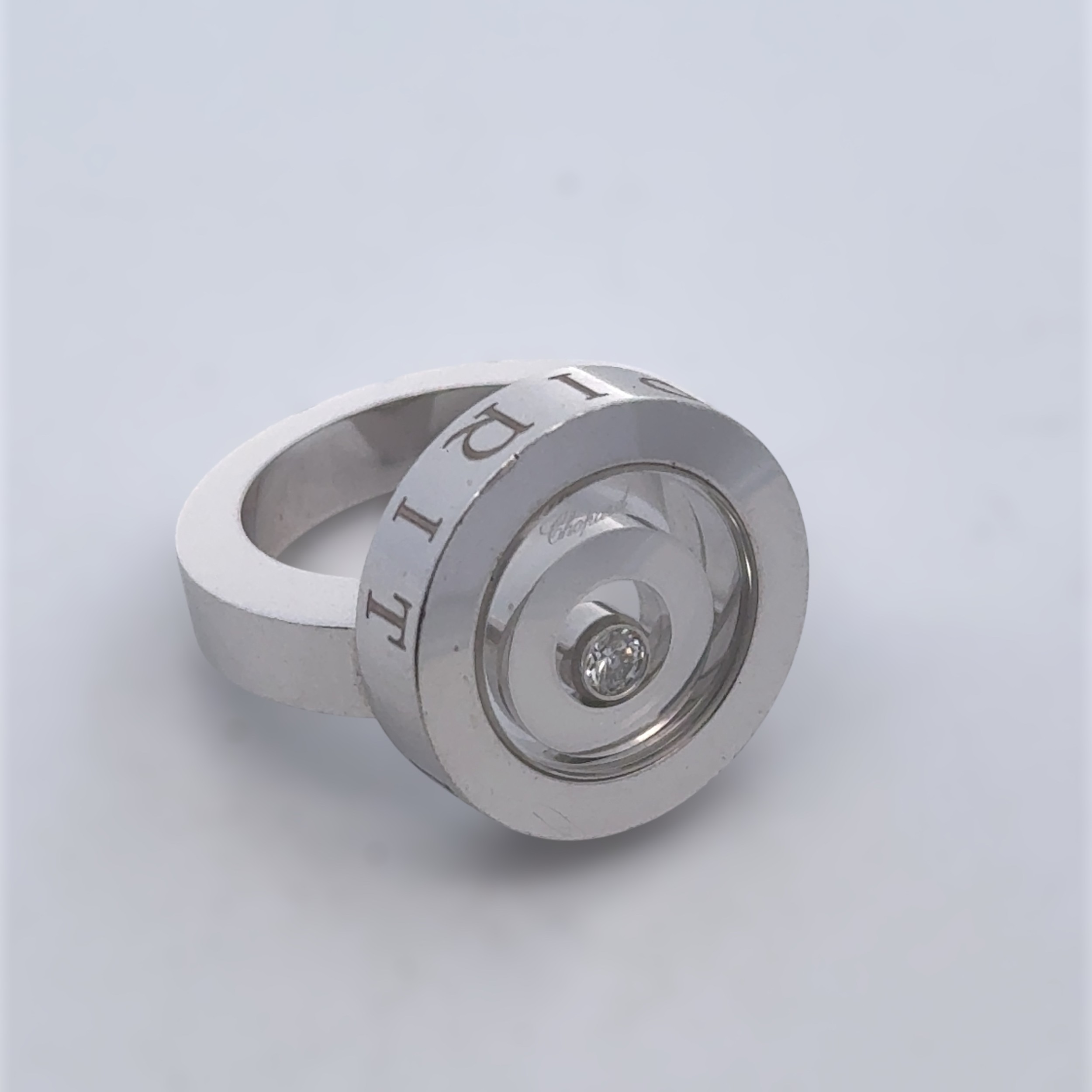 A Chopard 'Happy Spirit' 18ct white gold ring, size I. Designed as concentric circles beneath a glazed compartment revealing a ‘floating’ brilliant-cut diamond. Glazed compartment signed ‘Chopard’, the sides of the bezel inscribed ‘Happy Spirit. Stamped ‘750’ and numbered ‘3017500.’ In Chopard case and box, accompanied by Chopard booklets and Certificate of Origin.