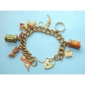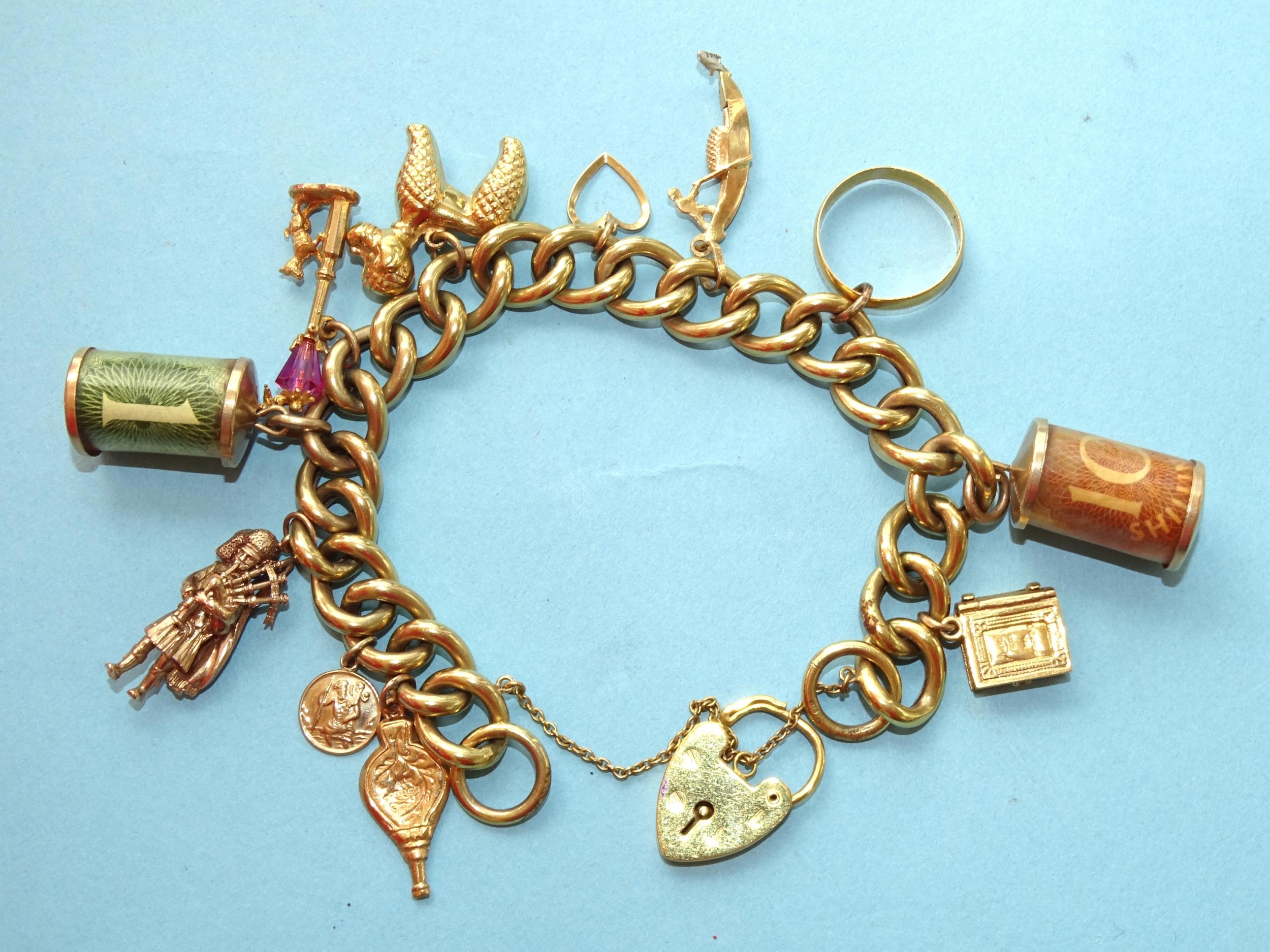 A 9ct gold curb-link bracelet with ten charms, one 22ct gold wedding band and padlock clasp, gross weight 22.8g.