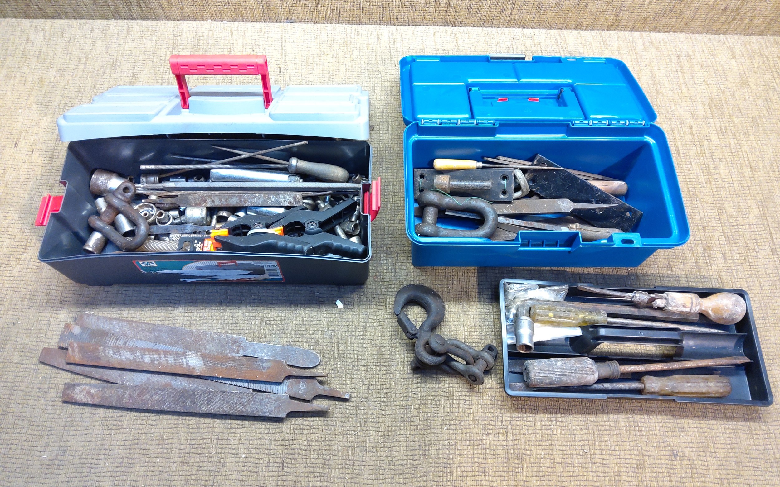 Two tool boxes full of tools.