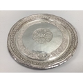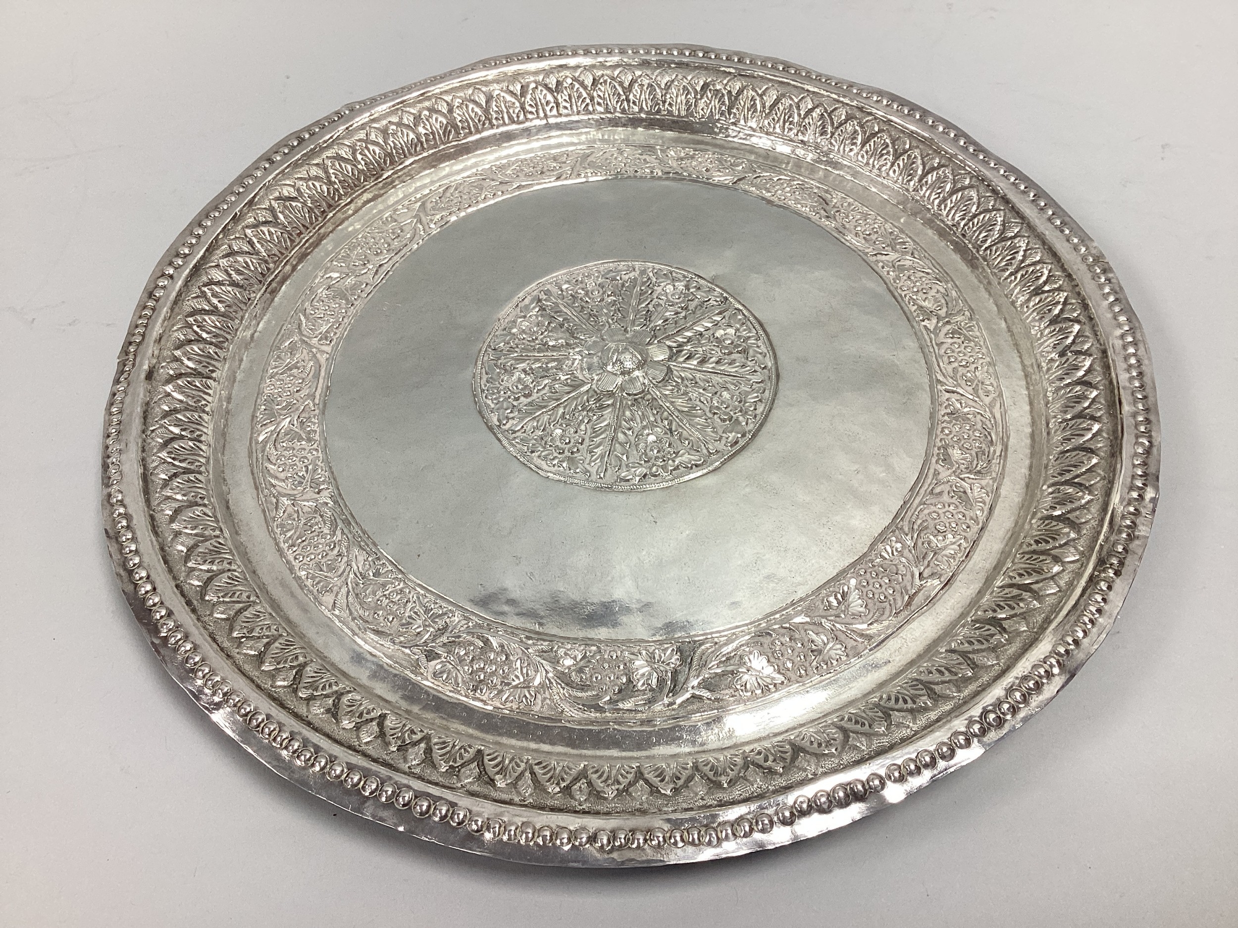A Highly Decorative Middle Eastern Circular Plaque / Tray, central foliate panel in relief, within textured border of fruiting vines and outer border of stylised leaves and punch dot edge, (apparently unmarked) 27.5cm diameter .