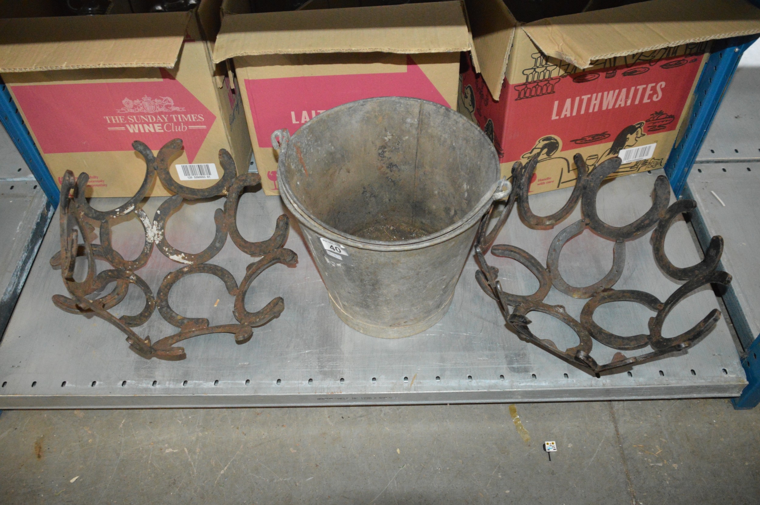 2 horseshoe planters & bucket