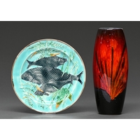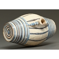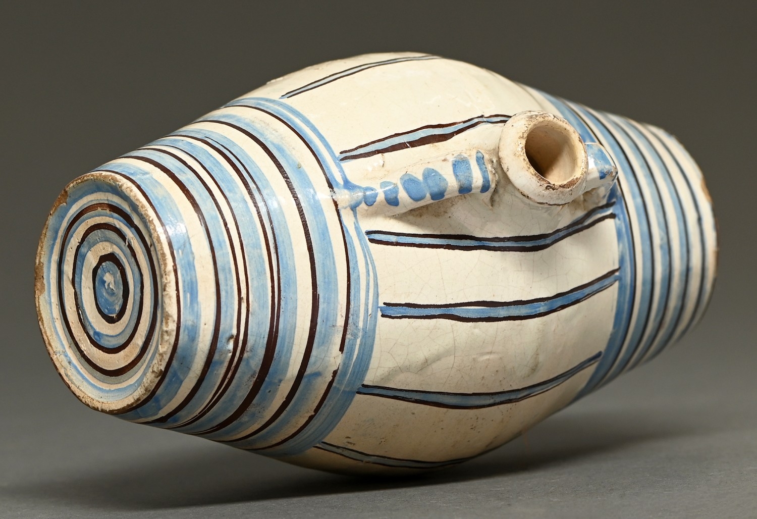 A French faience cask or tonnelet (costrel), mid-18th c, decorated with blue and manganese bands, the bottle neck applied to either side with two handles, 18cm h