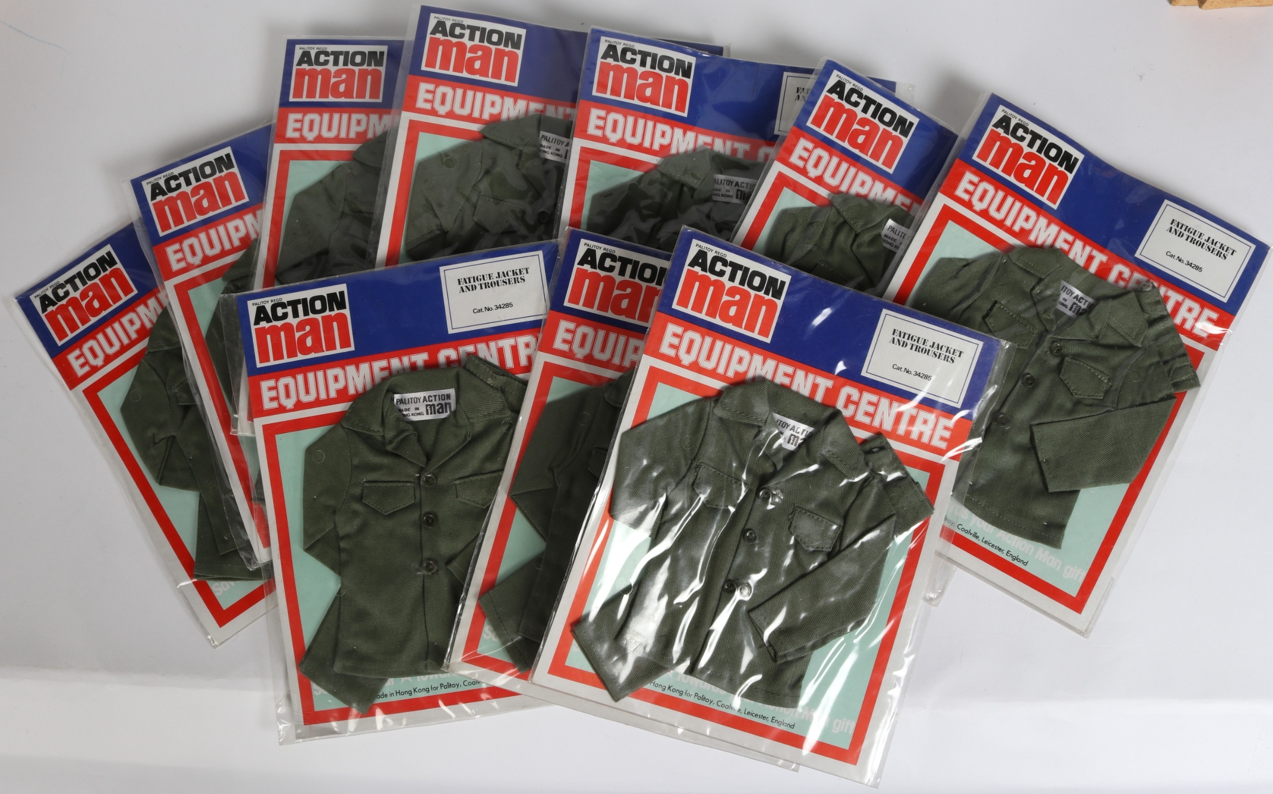 PALITOY ACTION MAN. Equipment Centre, 10 x Fatigue Jacket and Trousers. Dated from 1970's all on original backing cards. Condition - Mint. £100-150