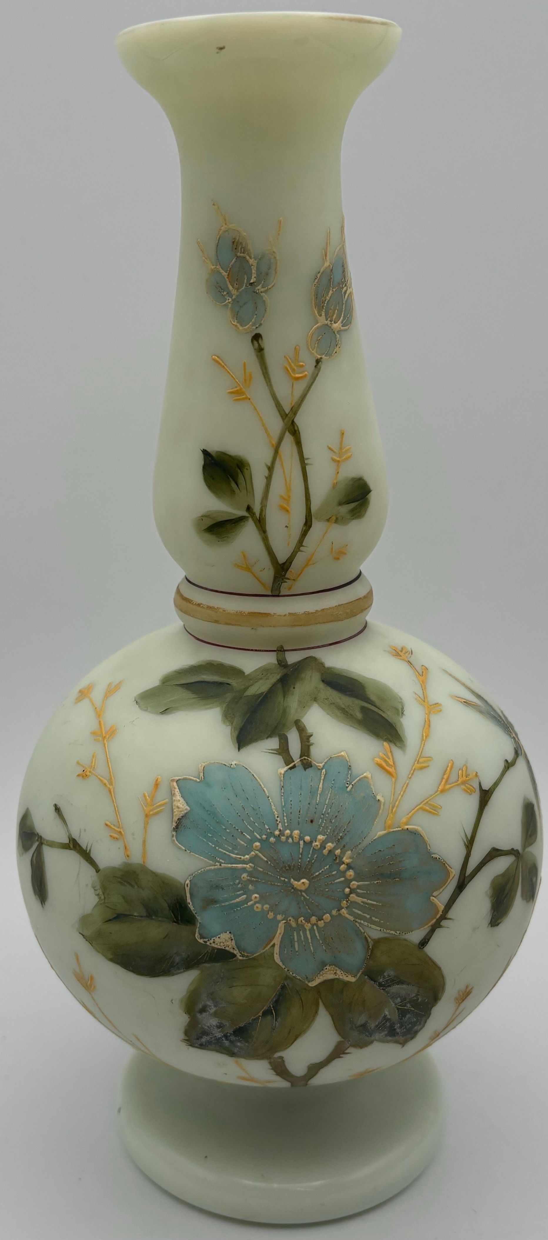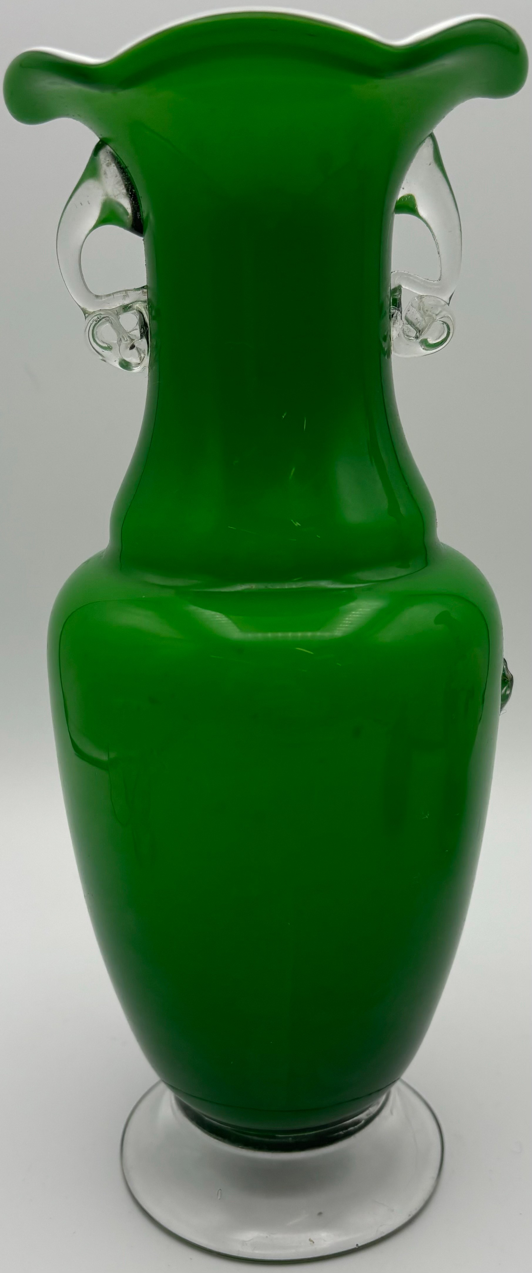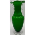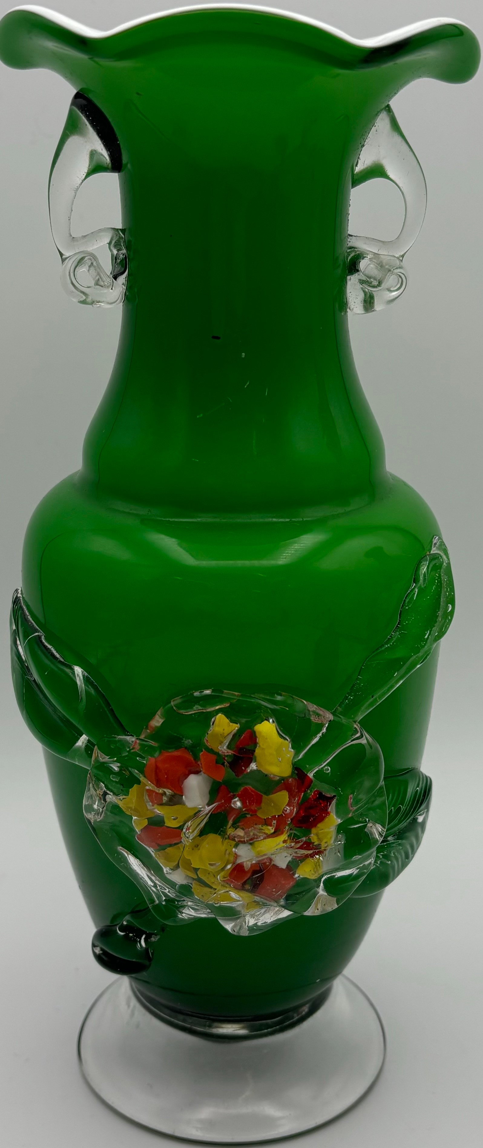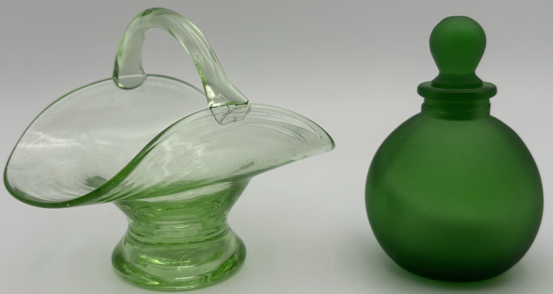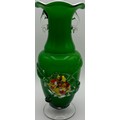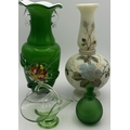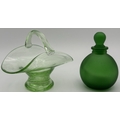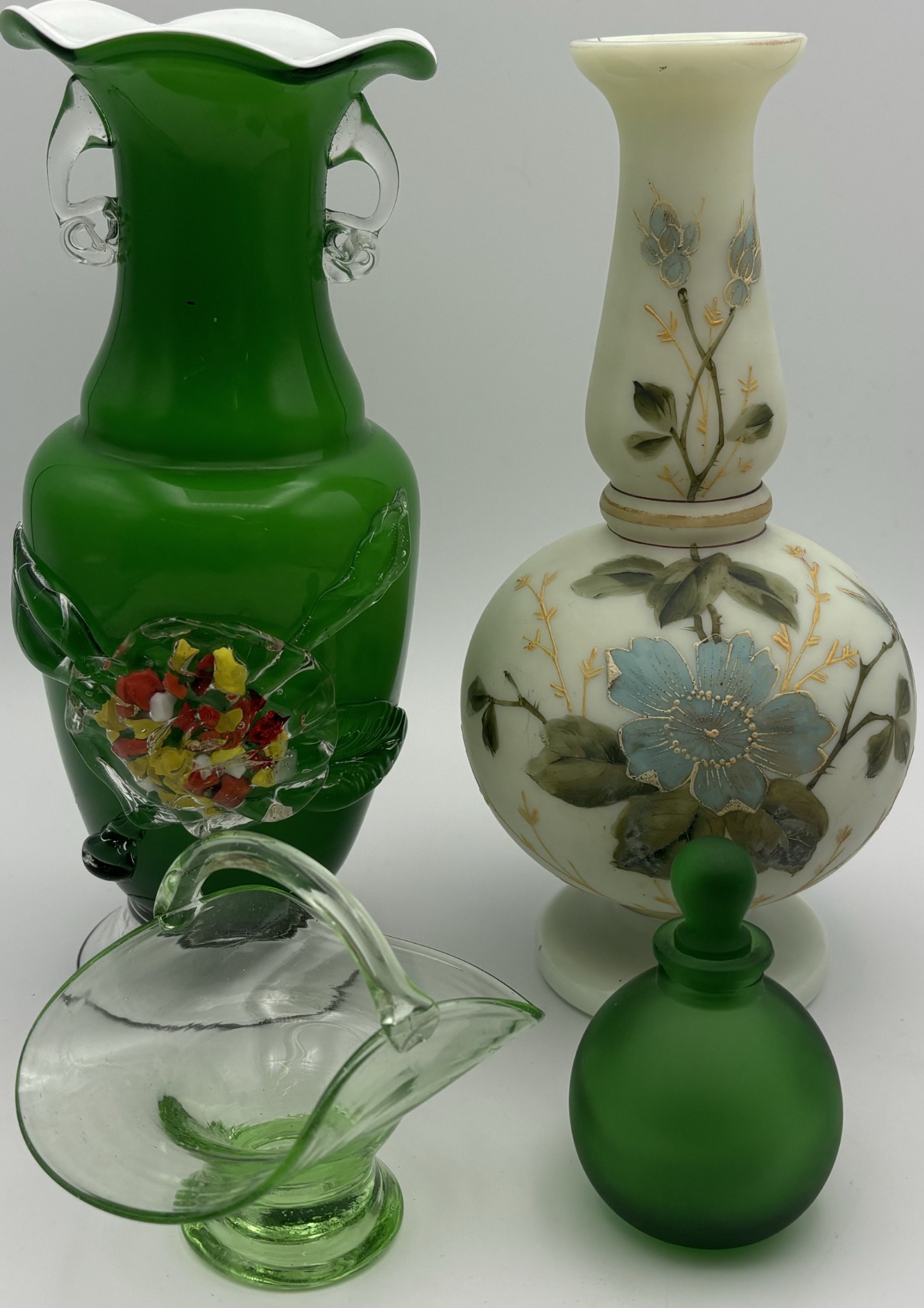 Four pieces of vintage art glass. To include a Murano-style blossom vase, opaline vase, basket & perfume bottle.
