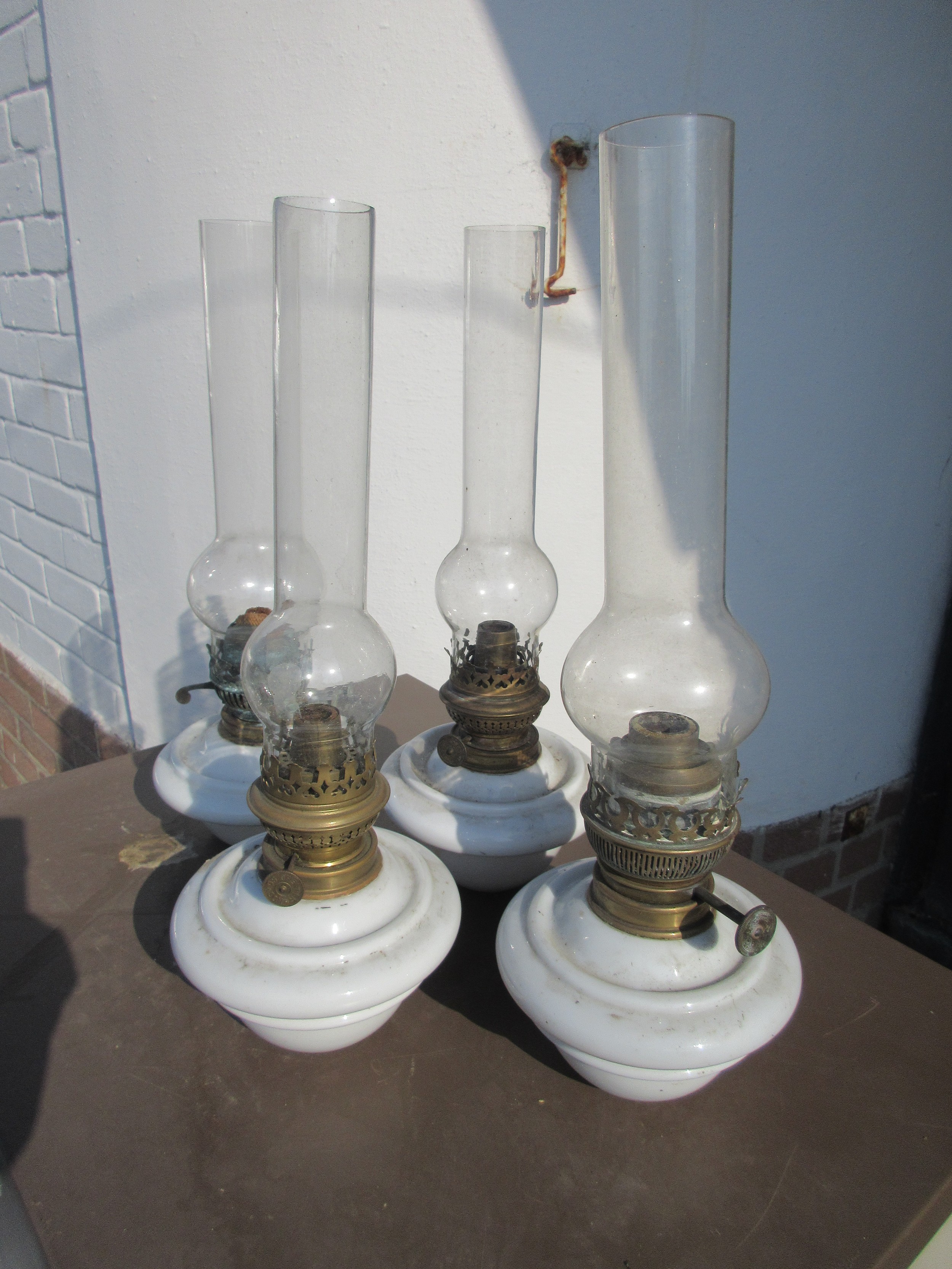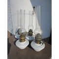 4 porcelain based oil lamps with burners and funnels, all in good order