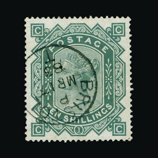 Great Britain - QV (surface printed) : (SG 135) 1867-83 wmk Anchor 10s greenish grey, CC, well centred, neat full BRISTOL cds, pressed-out diagonal crease at bottom, very fresh, super appearance, f.u. Cat. £7000 incl. premium. Cat £7000 (image available) [US1]