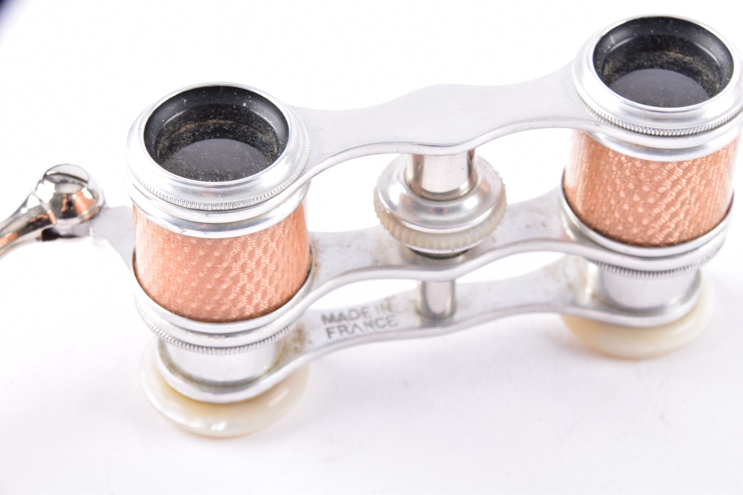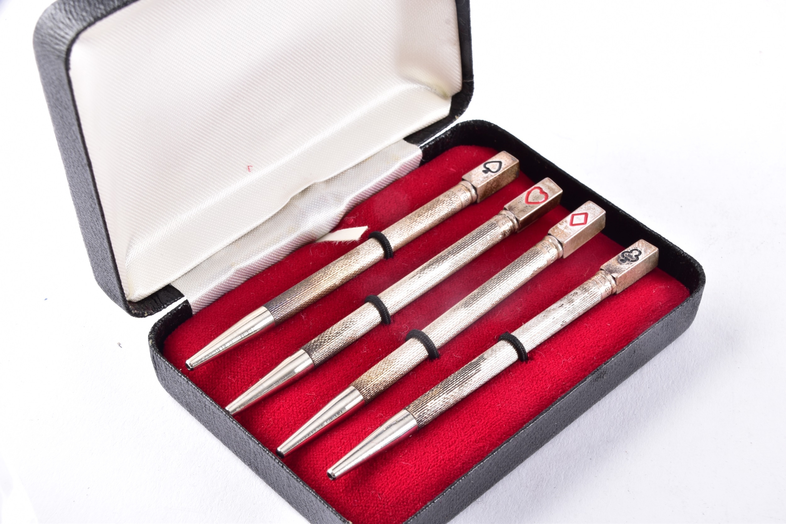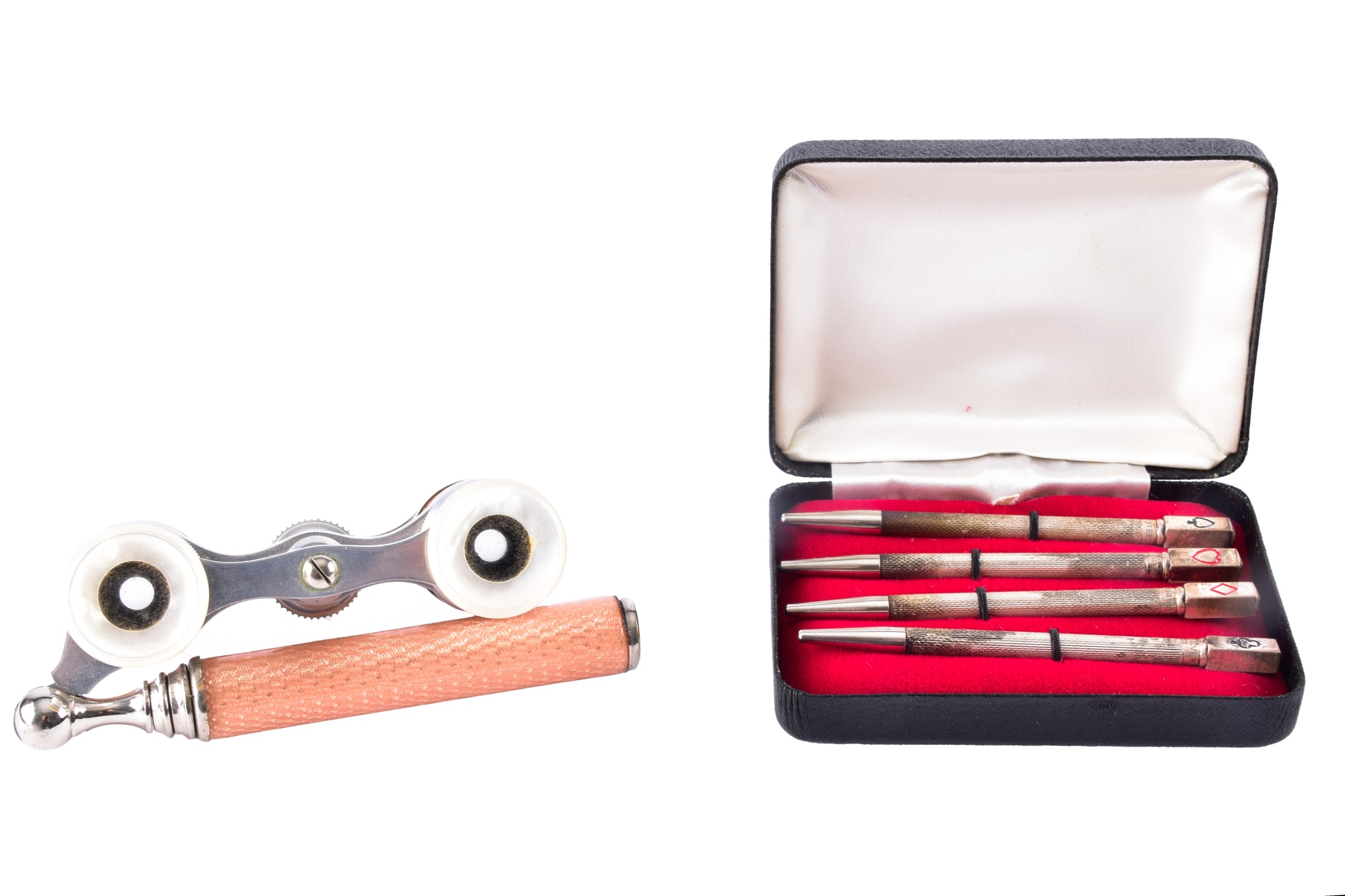 A vintage collection of silver bridge pencils, featuring engine turned decoration to the barrels,meach pencil capped with a terminal enamelled with one of the four card suits, in fitted presentation box, together with a pair of vintage French opera glasses, featuring a handle and embossed enamel decoration. (2)
