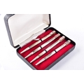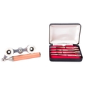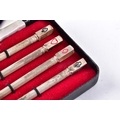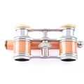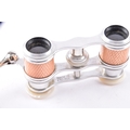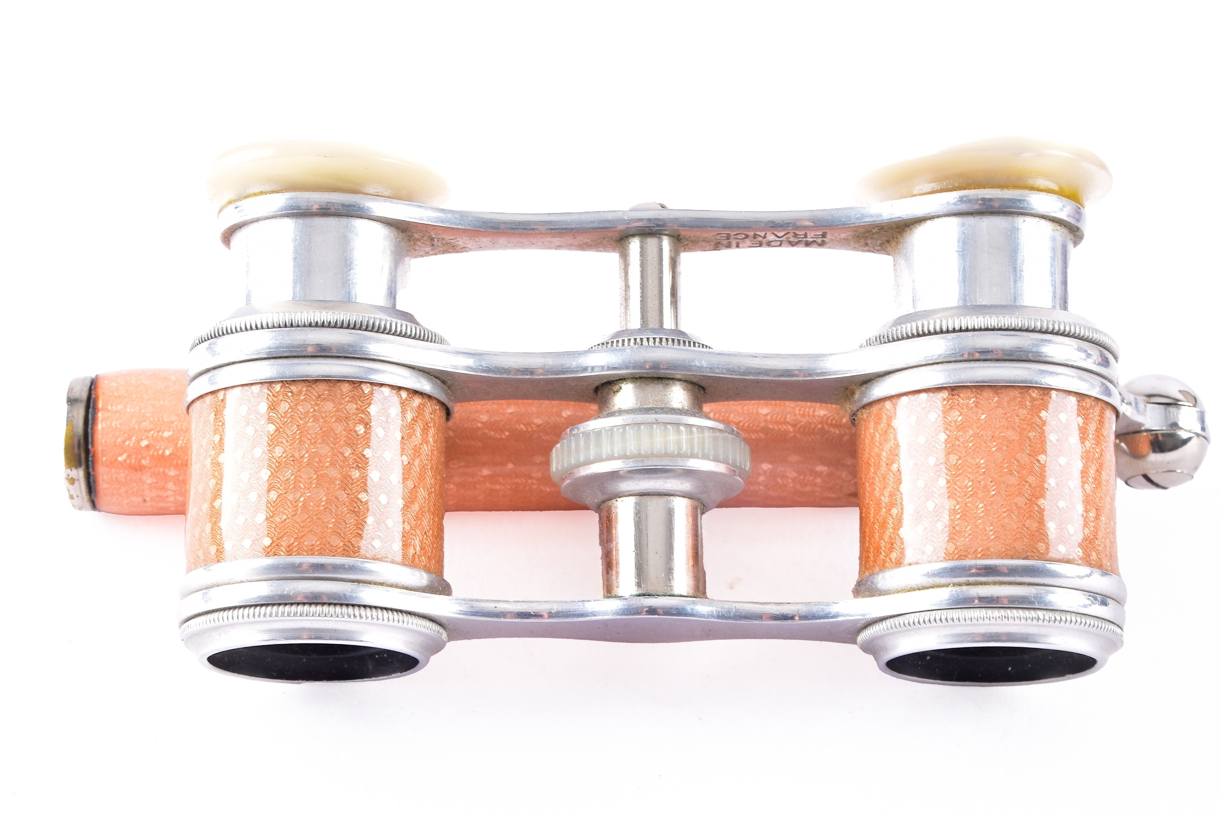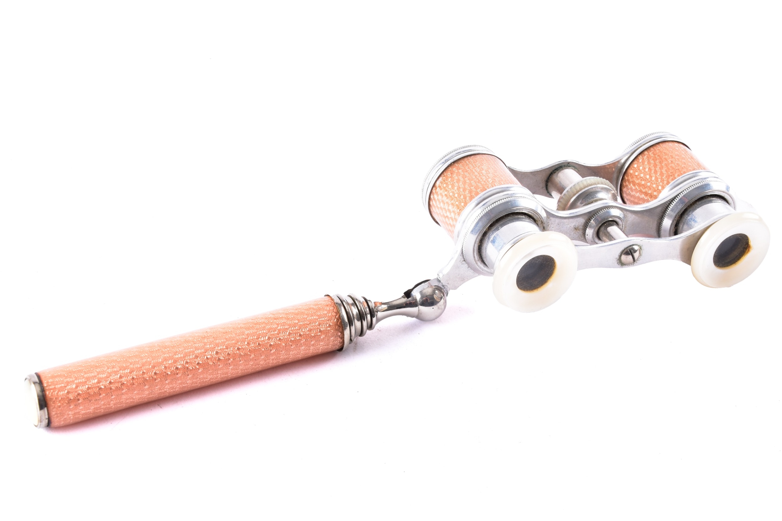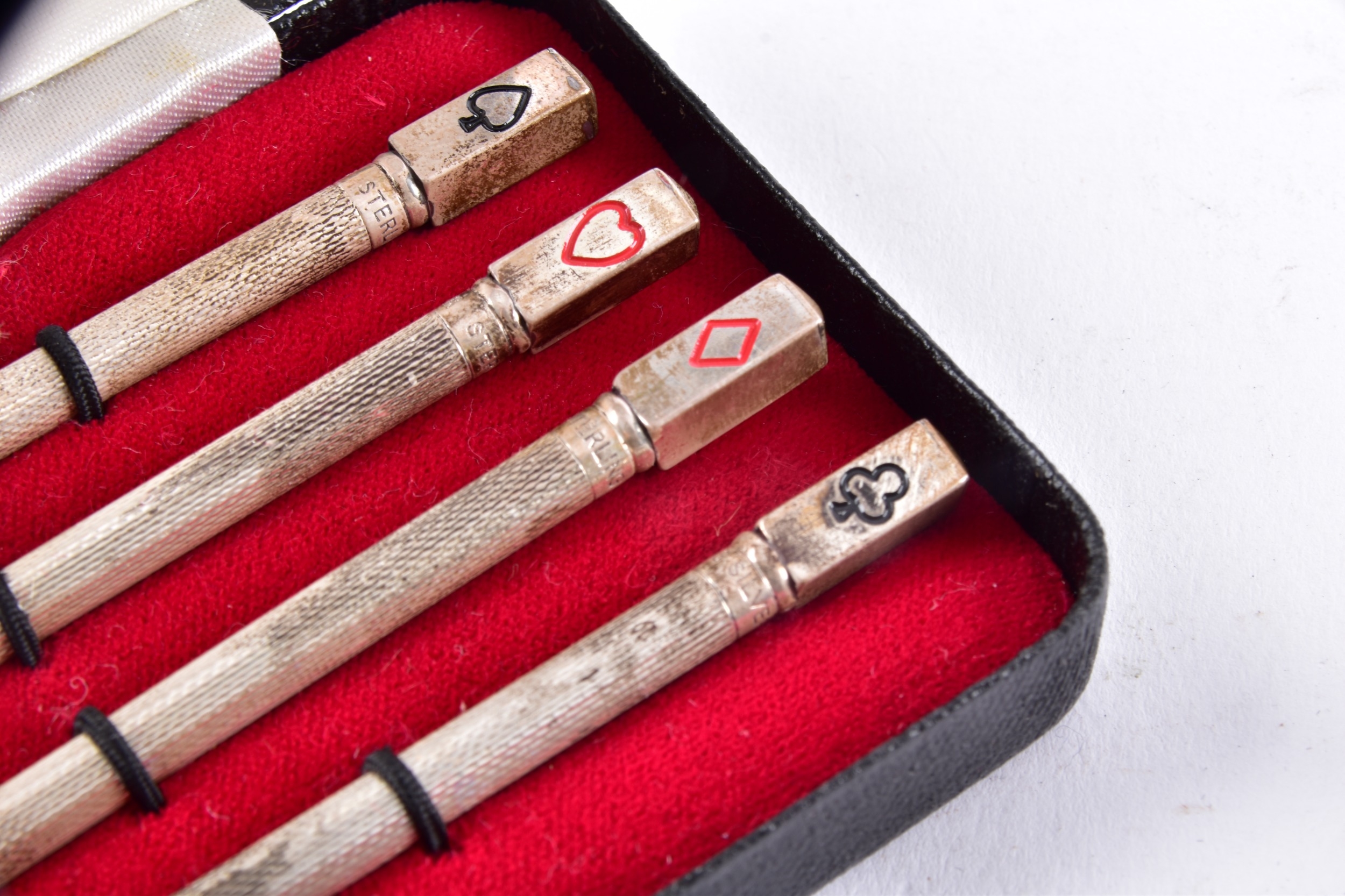 A vintage collection of silver bridge pencils, featuring engine turned decoration to the barrels,meach pencil capped with a terminal enamelled with one of the four card suits, in fitted presentation box, together with a pair of vintage French opera glasses, featuring a handle and embossed enamel decoration. (2)