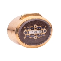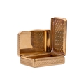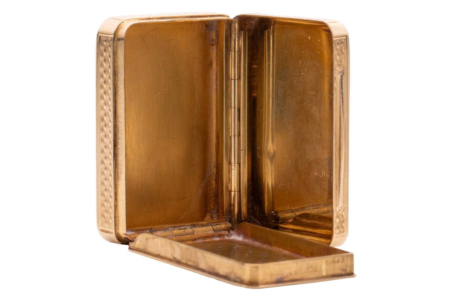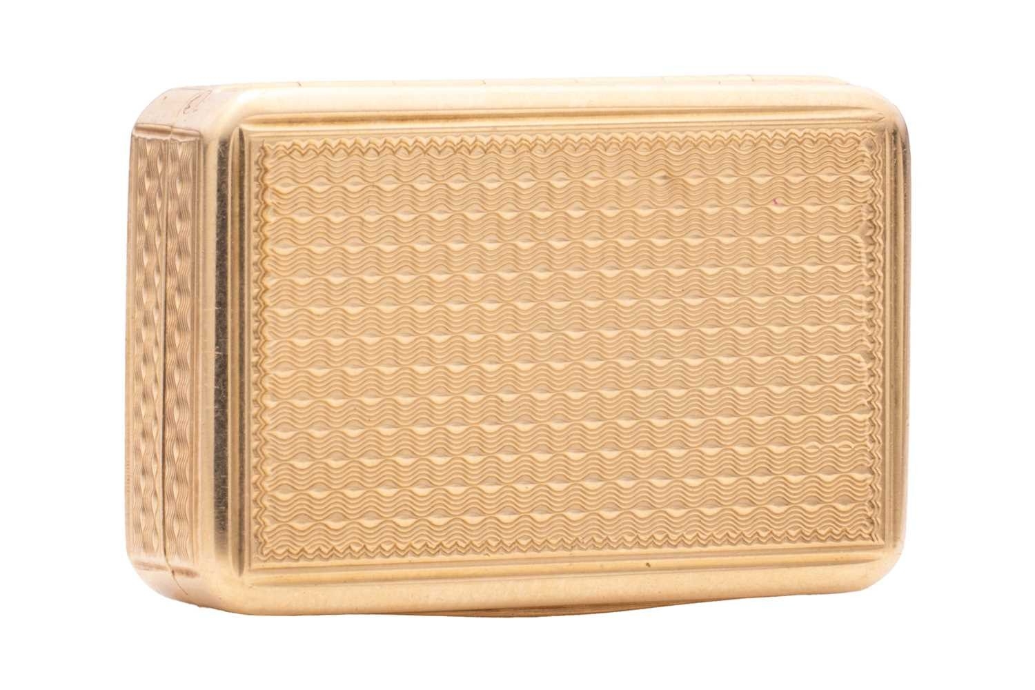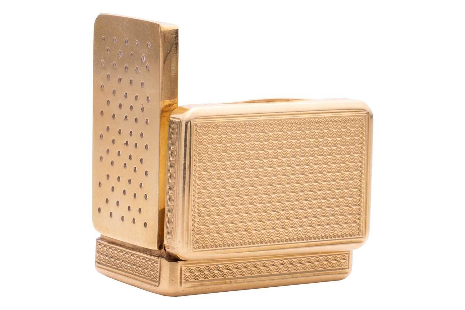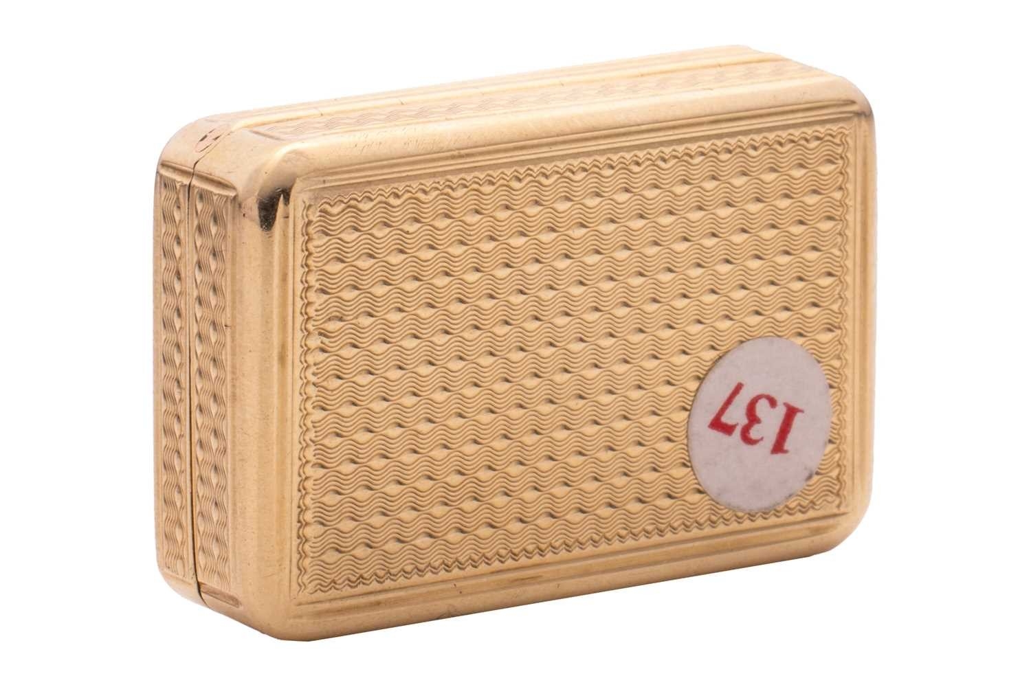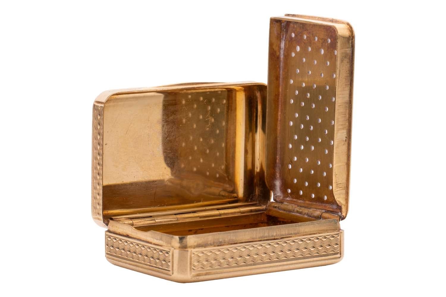 A vinaigrette of engine-turned design, rectangular form, cover with thumbpiece open to reveal drilled grille, apparently unmarked, yellow metal testing as 15ct, 3.5 cm wide, 20.4 grams.