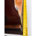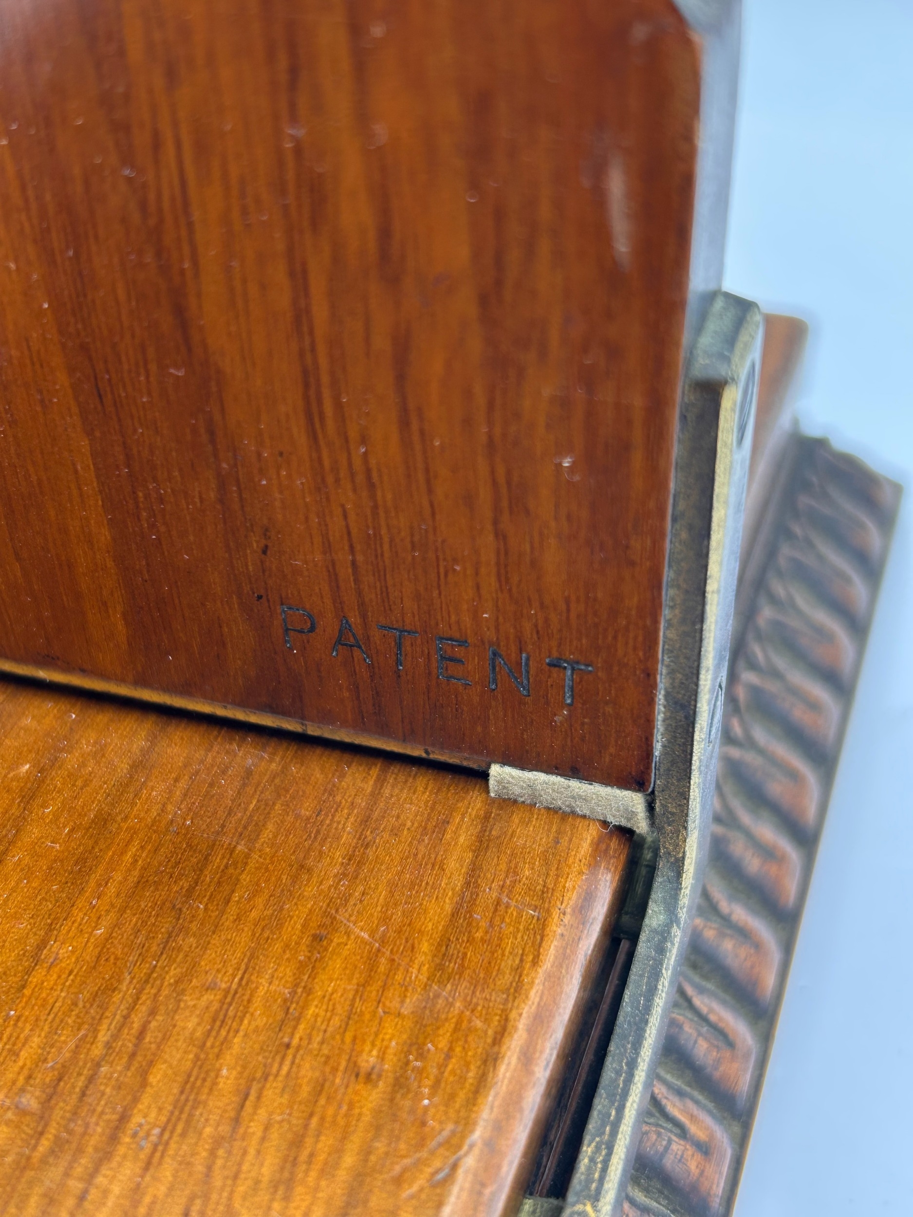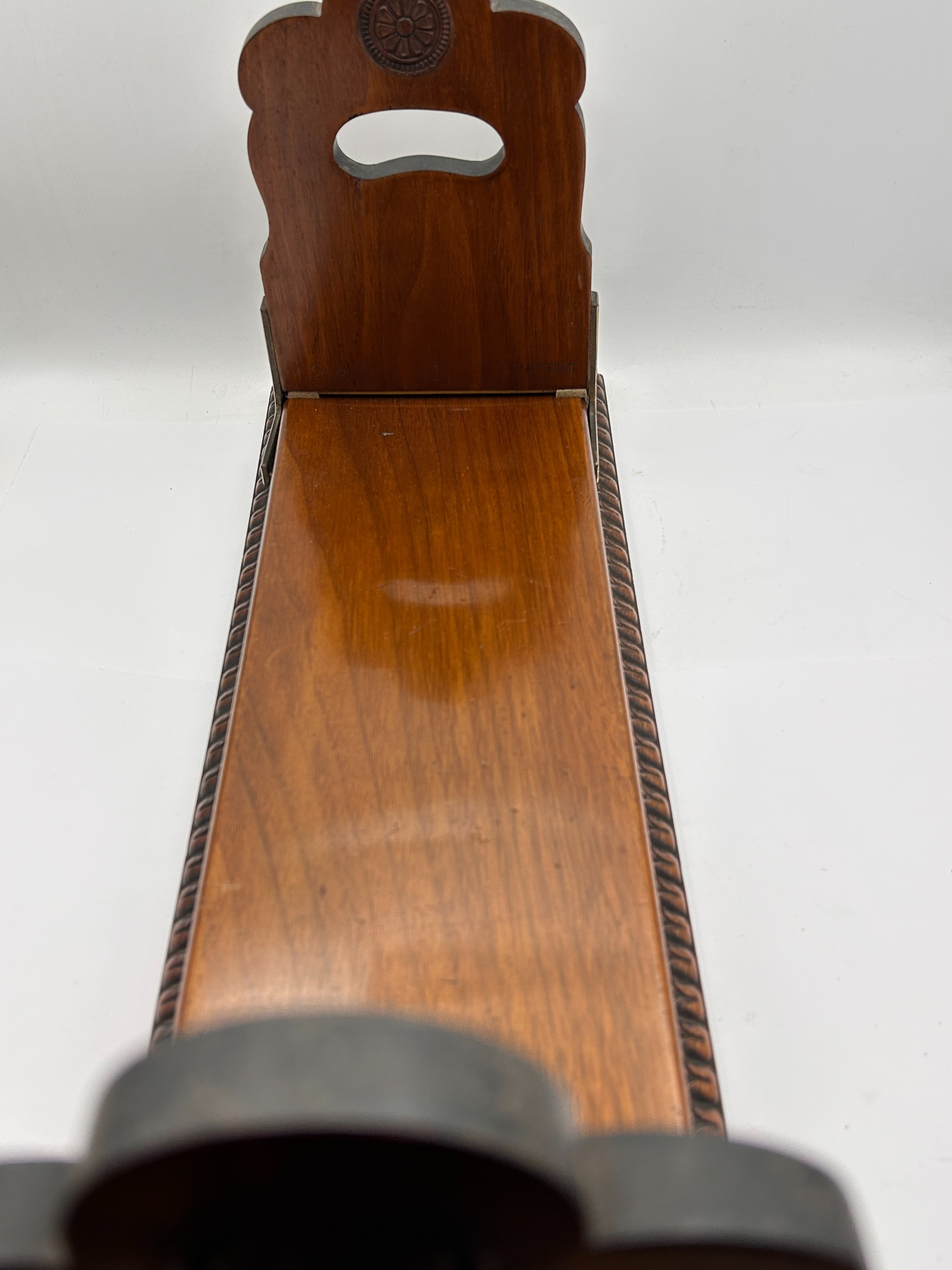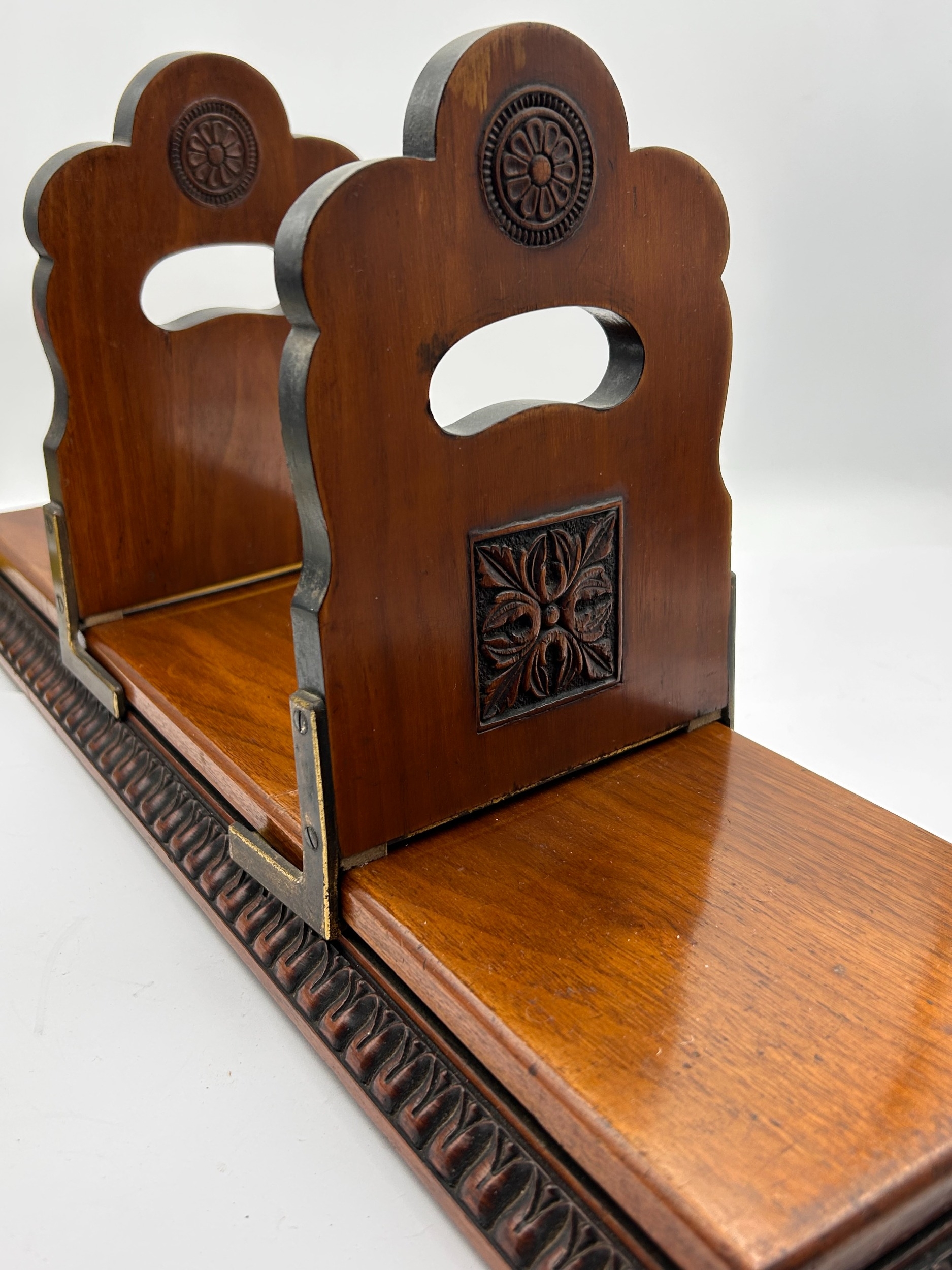 An antique adjustable book slide constructed of dark hardwood, likely mahogany, featuring brass fittings. The design exhibits characteristics of the late-Victorian or Edwardian period, utilizing deeply carved decorative elements. The two upright bookends are scalloped along the top edge and feature circular rosette carvings at the apex. Below the handle cutouts, square panels contain detailed foliate or floral carvings. The adjustable base includes heavy, repeating scroll carving along the front edge. The item is marked with the impressed word "PATENT" into the wood near the brass hinge of one support, indicating a registered design.