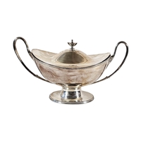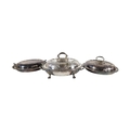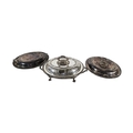 To include a dish with chased foliate decoration and detachable handle, two further lidded serving dishes, and a pierced circular gallery basket.