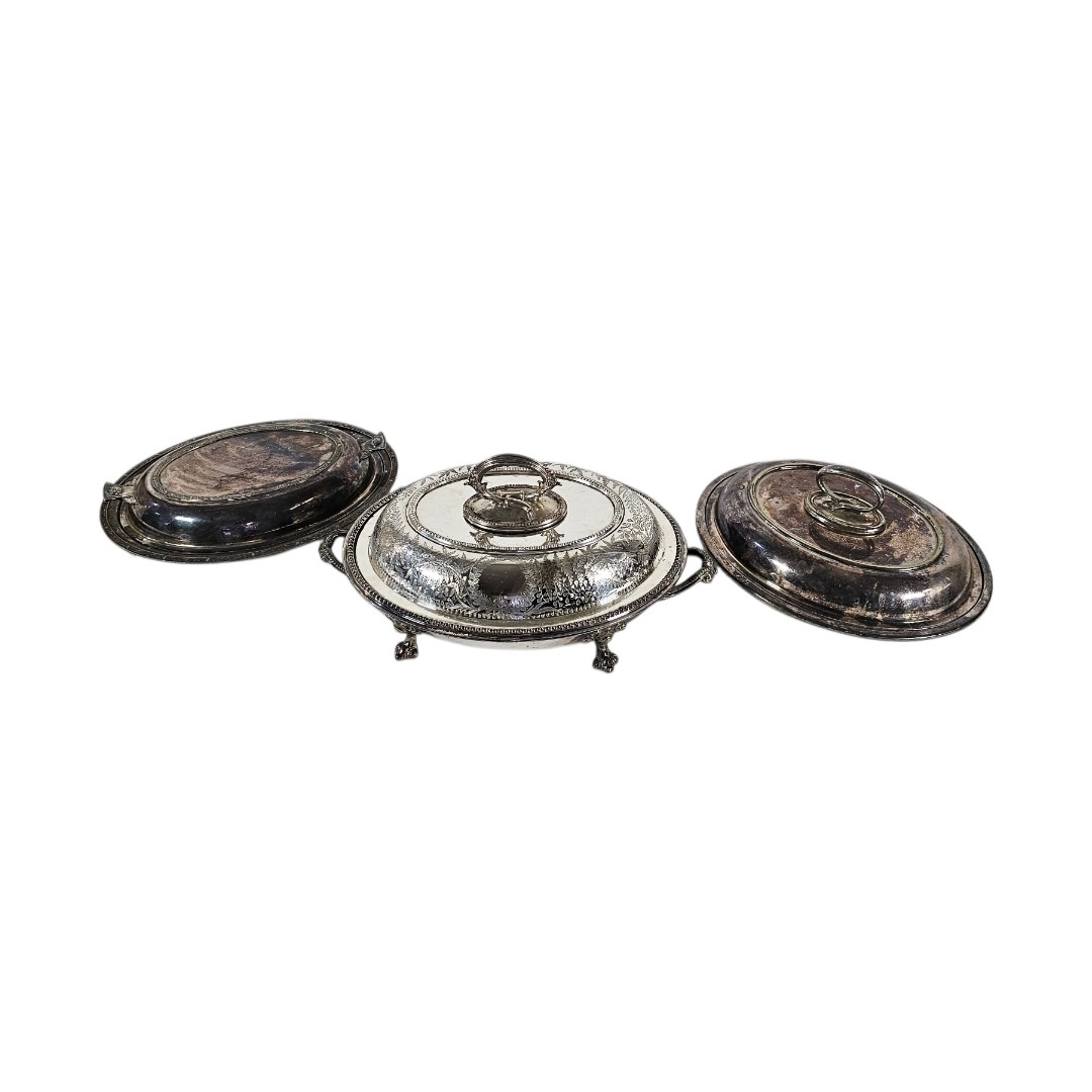 A COLLECTION OF VICTORIAN AND LATER SILVER PLATED ENTREE DISHES