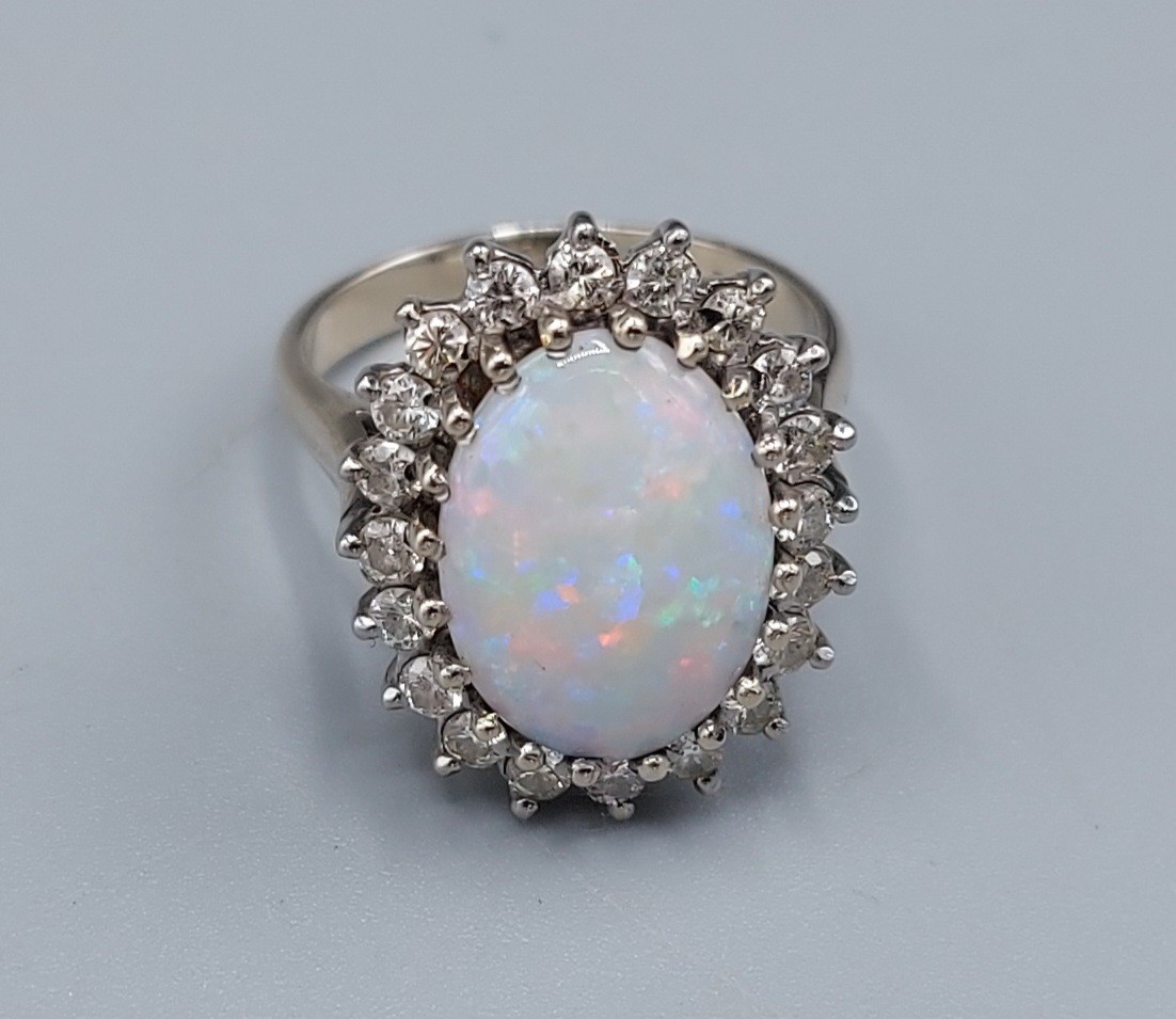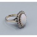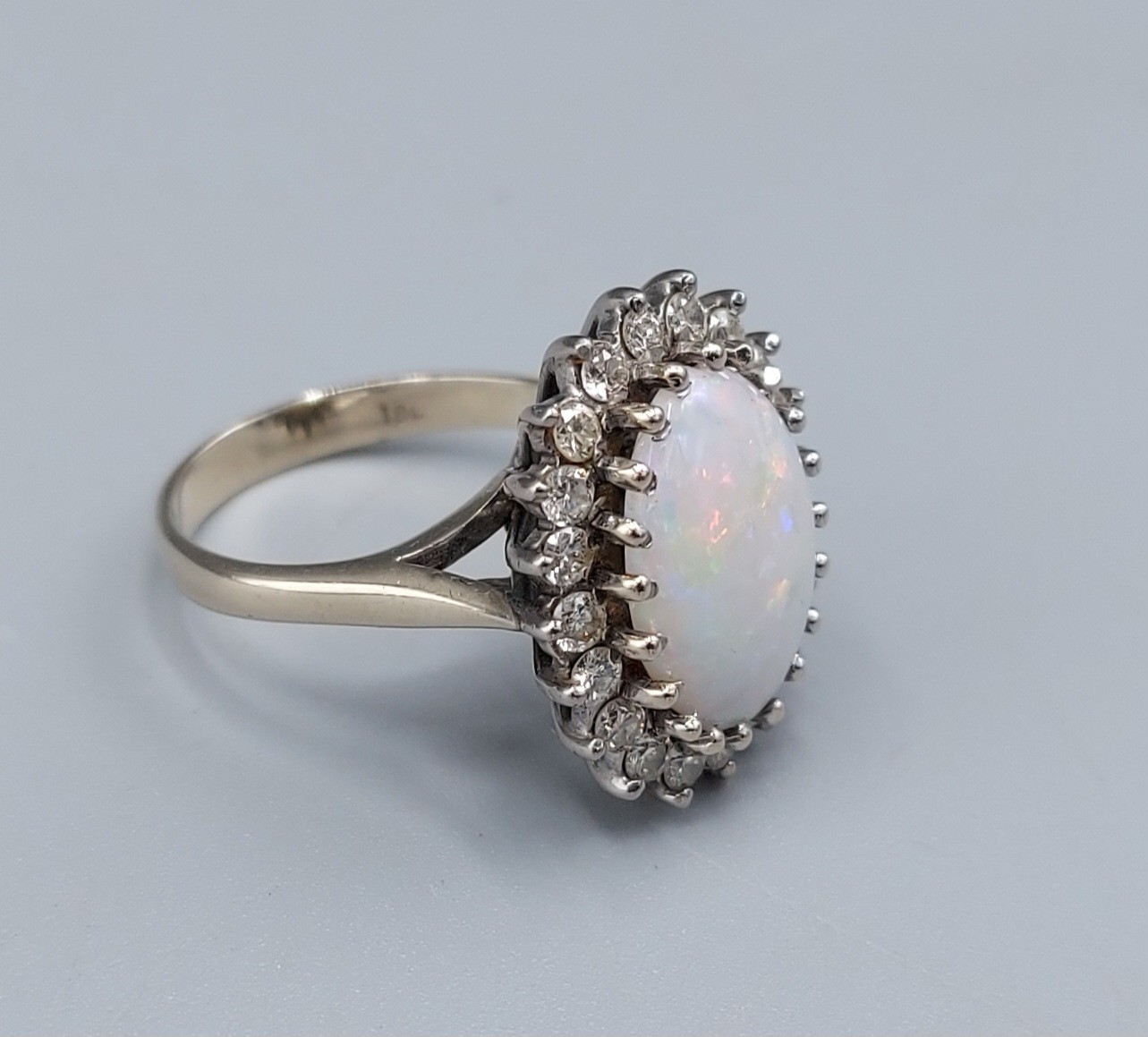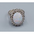 An 18ct white gold Opal and Diamond cluster ring set with large central oval Opal surrounded by Diamonds, ring size M, 7gms