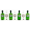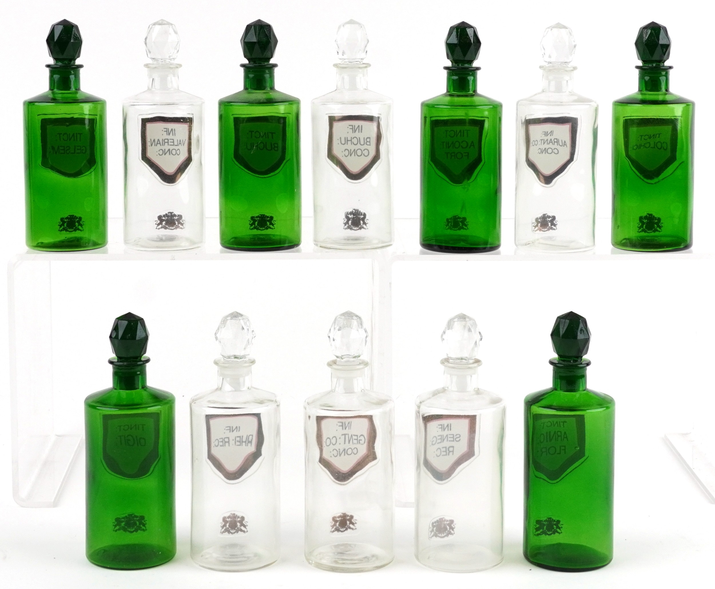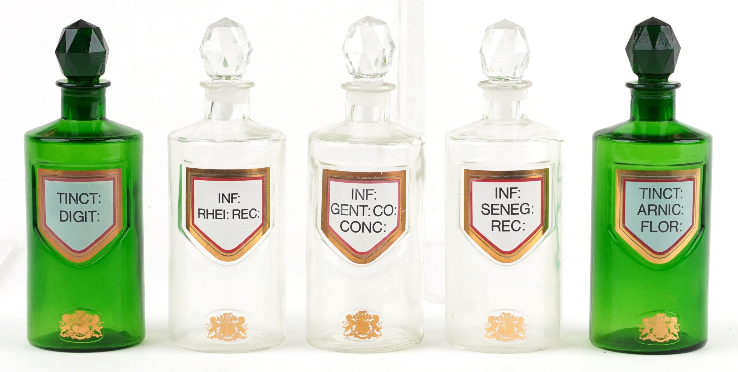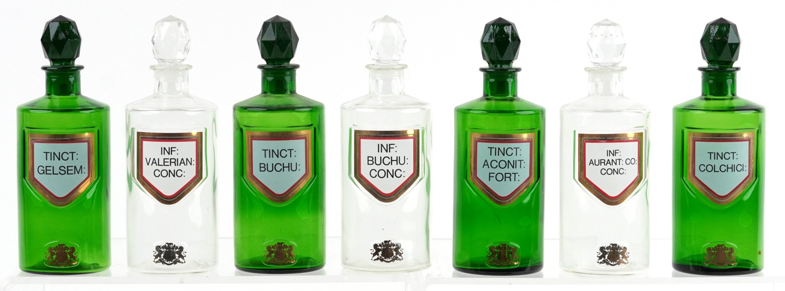 A collection of Royal Pharmaceutical Society coloured glass chemist bottles with facetted stoppers, each bearing a gilded crest, 19cm high.