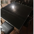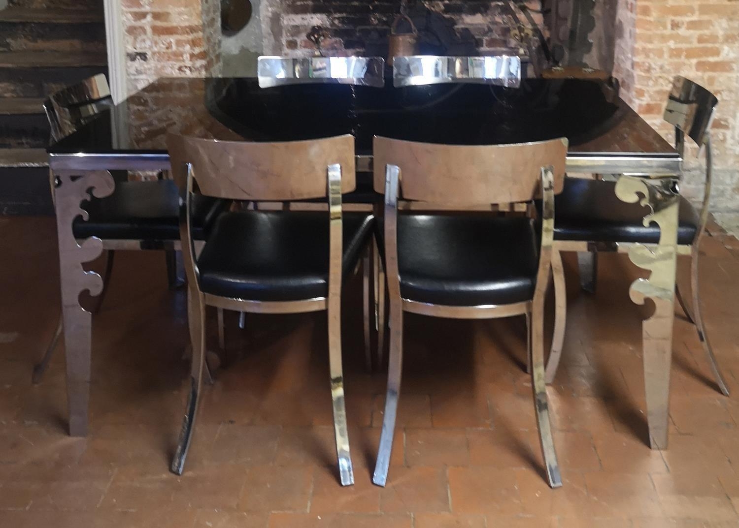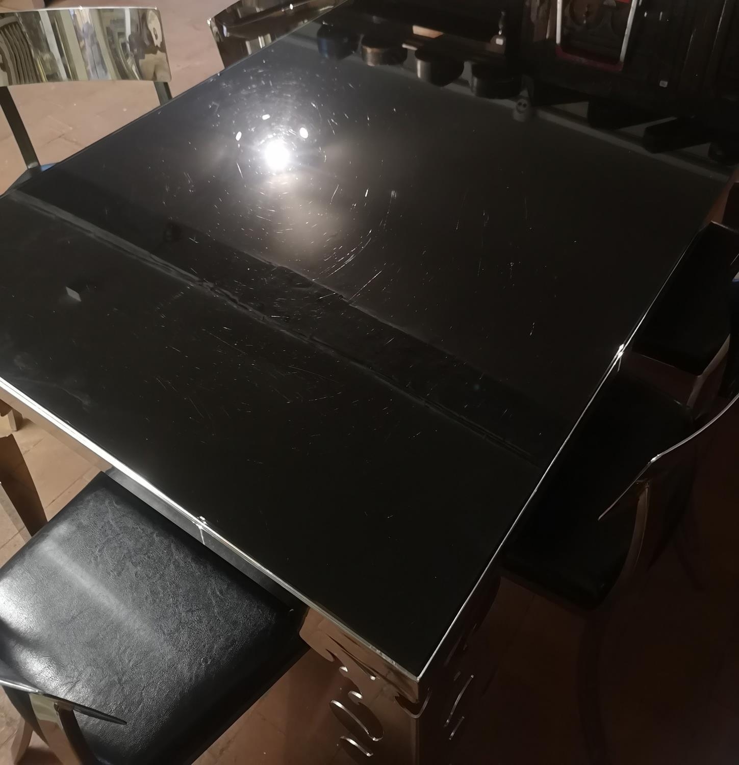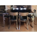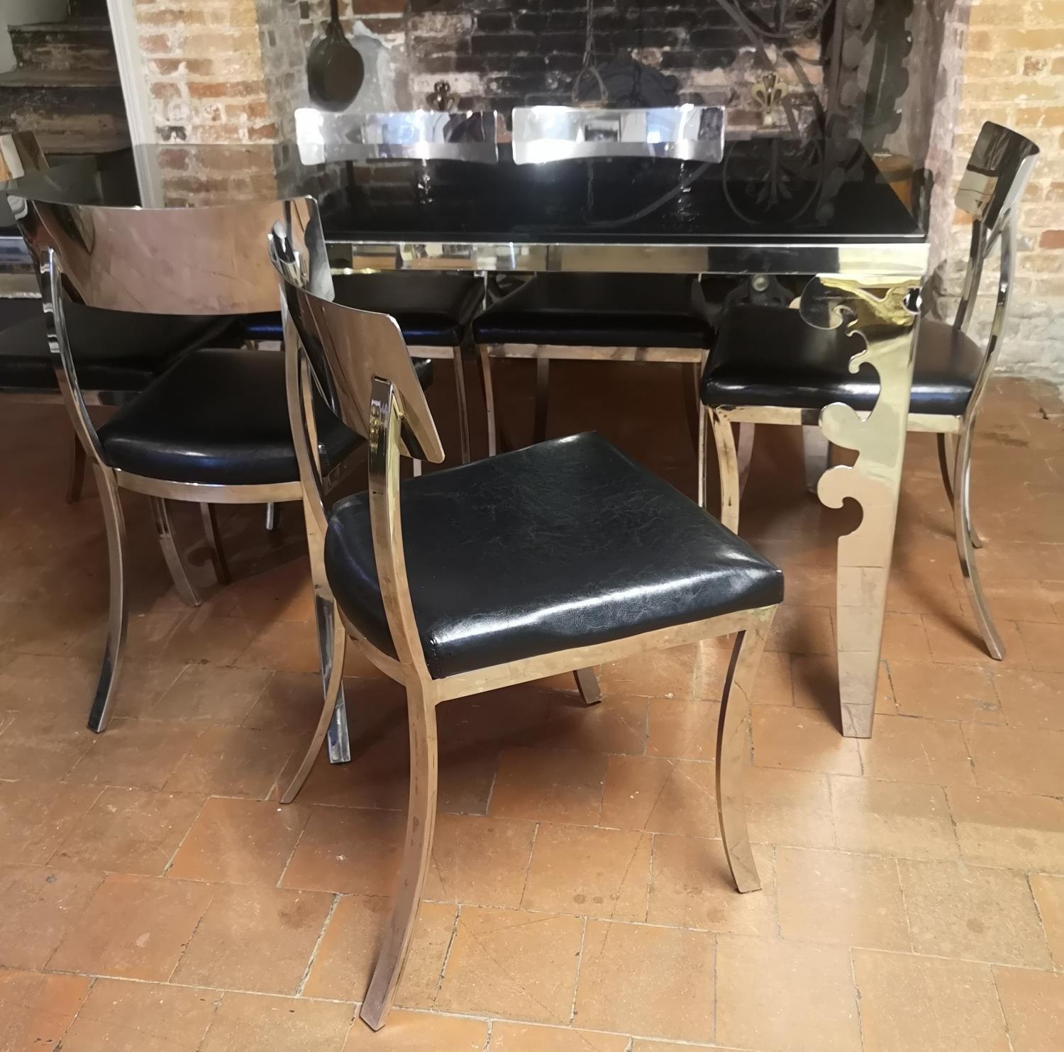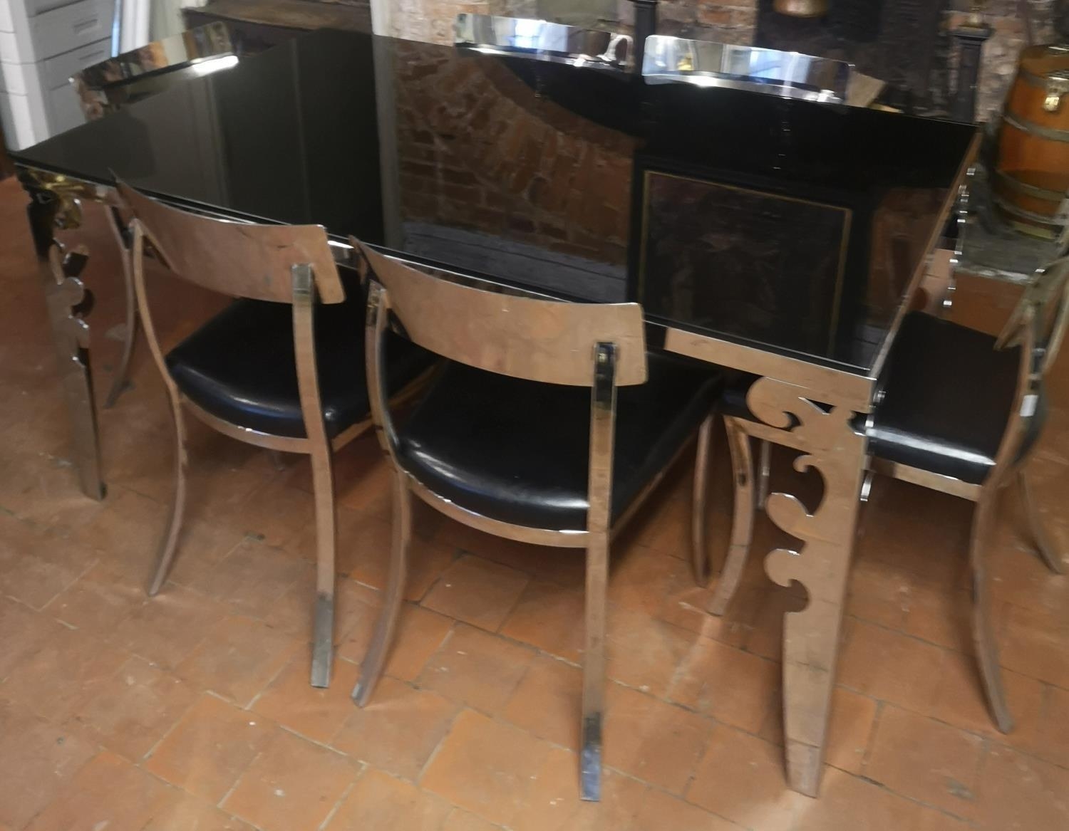 Comprising a black glass top table and six black faux leather upholstered chairs, raised on sabre legs.