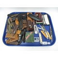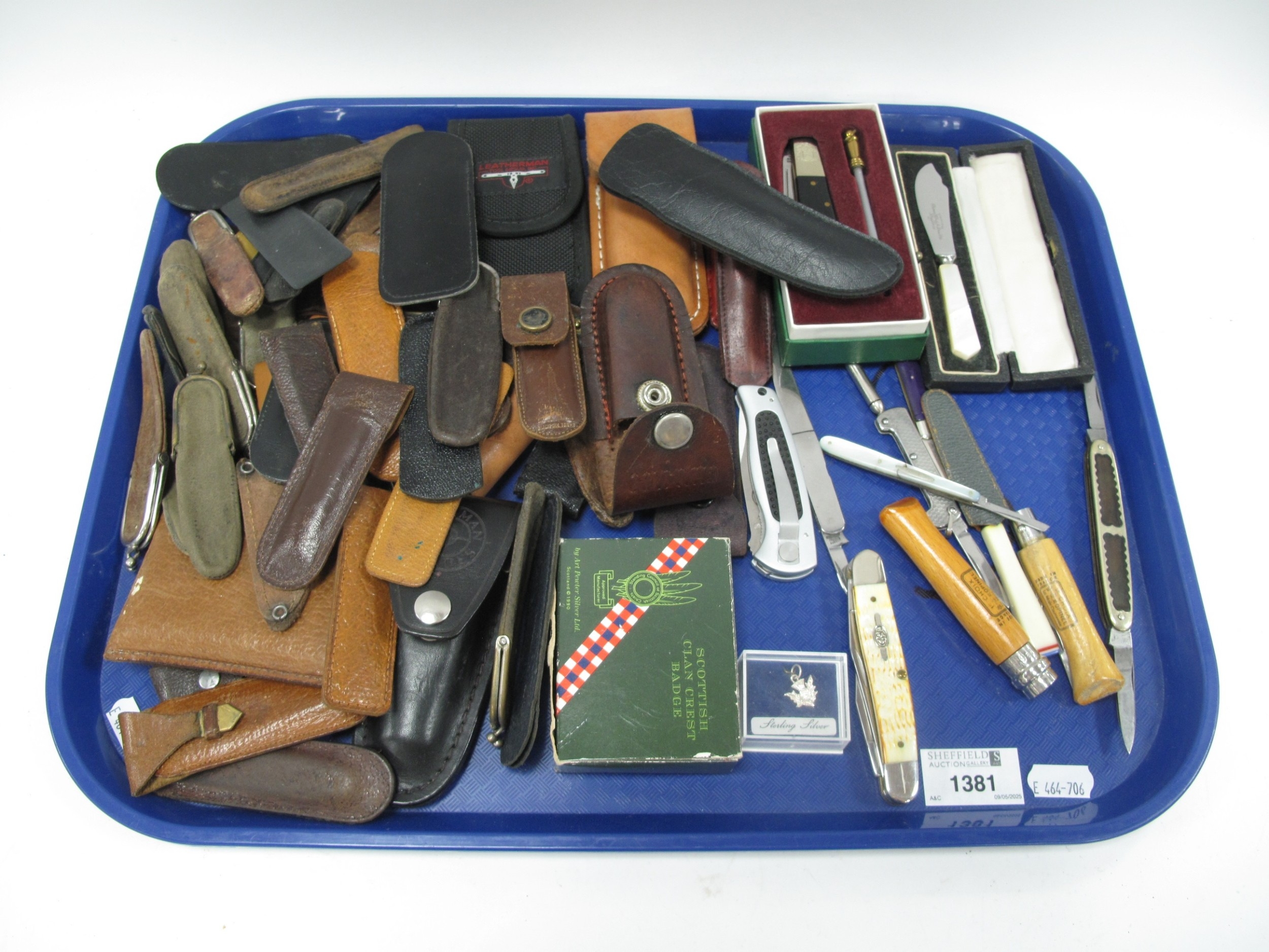 Penknives: a collection of modern examples to include USA muskrat, two choix wooden handle examples, mother of pearl, etc together with a large collection of leather sheaths etc:- One Tray.