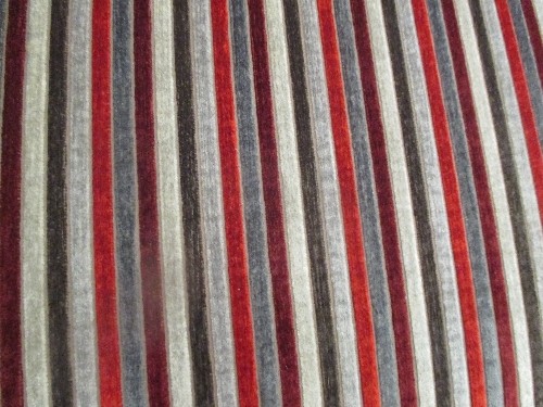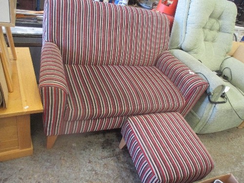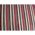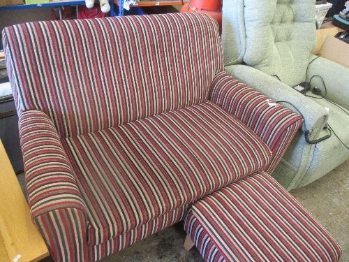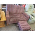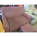 SMALL CONTEMPORARY TWO SEATER SOFA IN STRIPED RED AND GREY FABRIC (124CM X 84CM X 82CM) TOGETHER WITH A MATCHING FOOTSTOOL