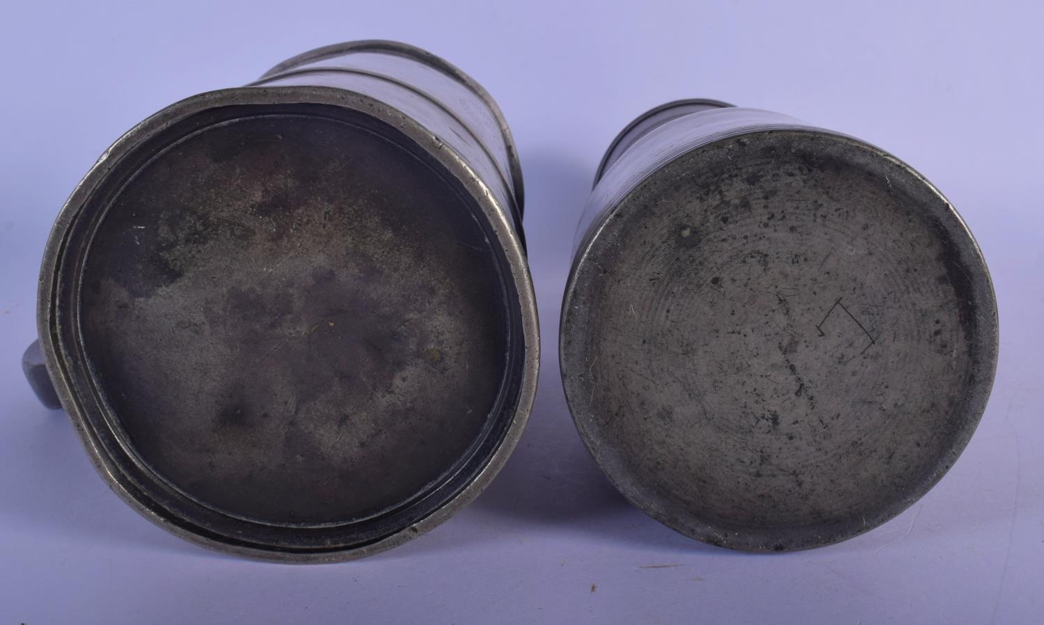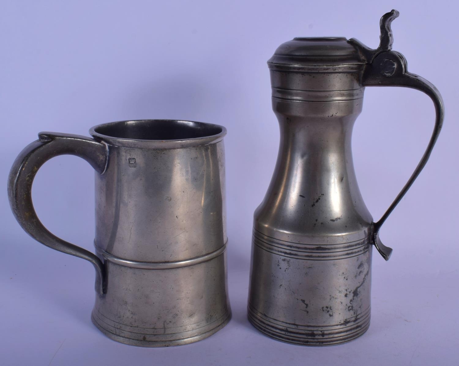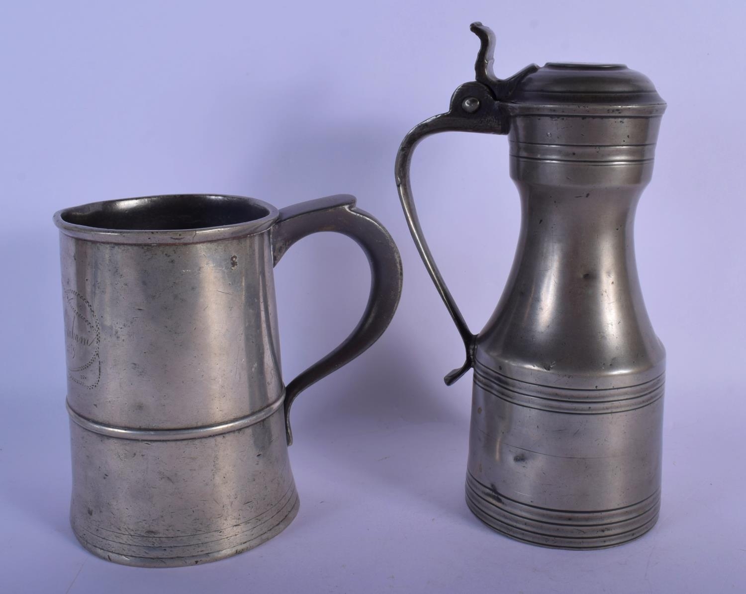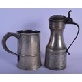 A MID 19TH CENTURY PEWTER TANKARD and a tappit hen. Largest 25 cm high. (2)