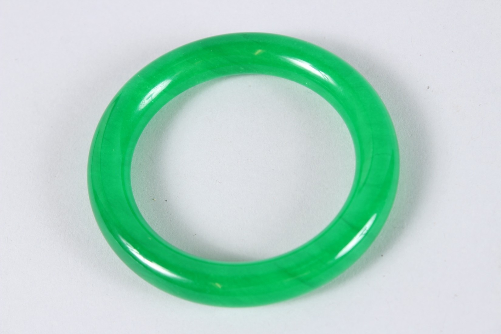 A CHINESE APPLE GREEN JADE BANGLE. 3.25ins diameter.