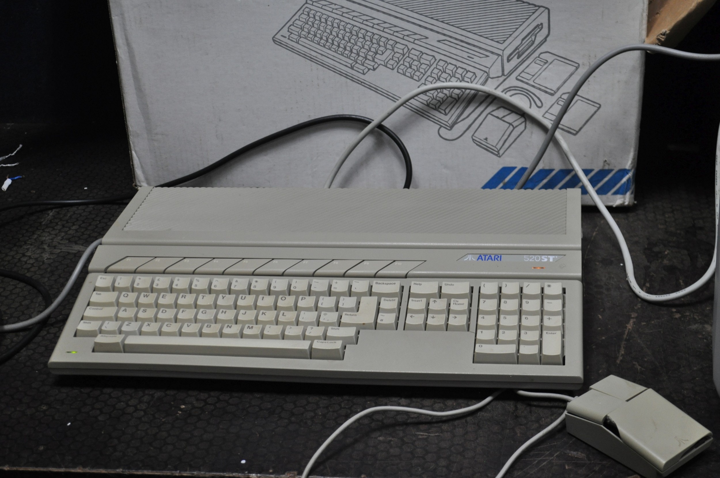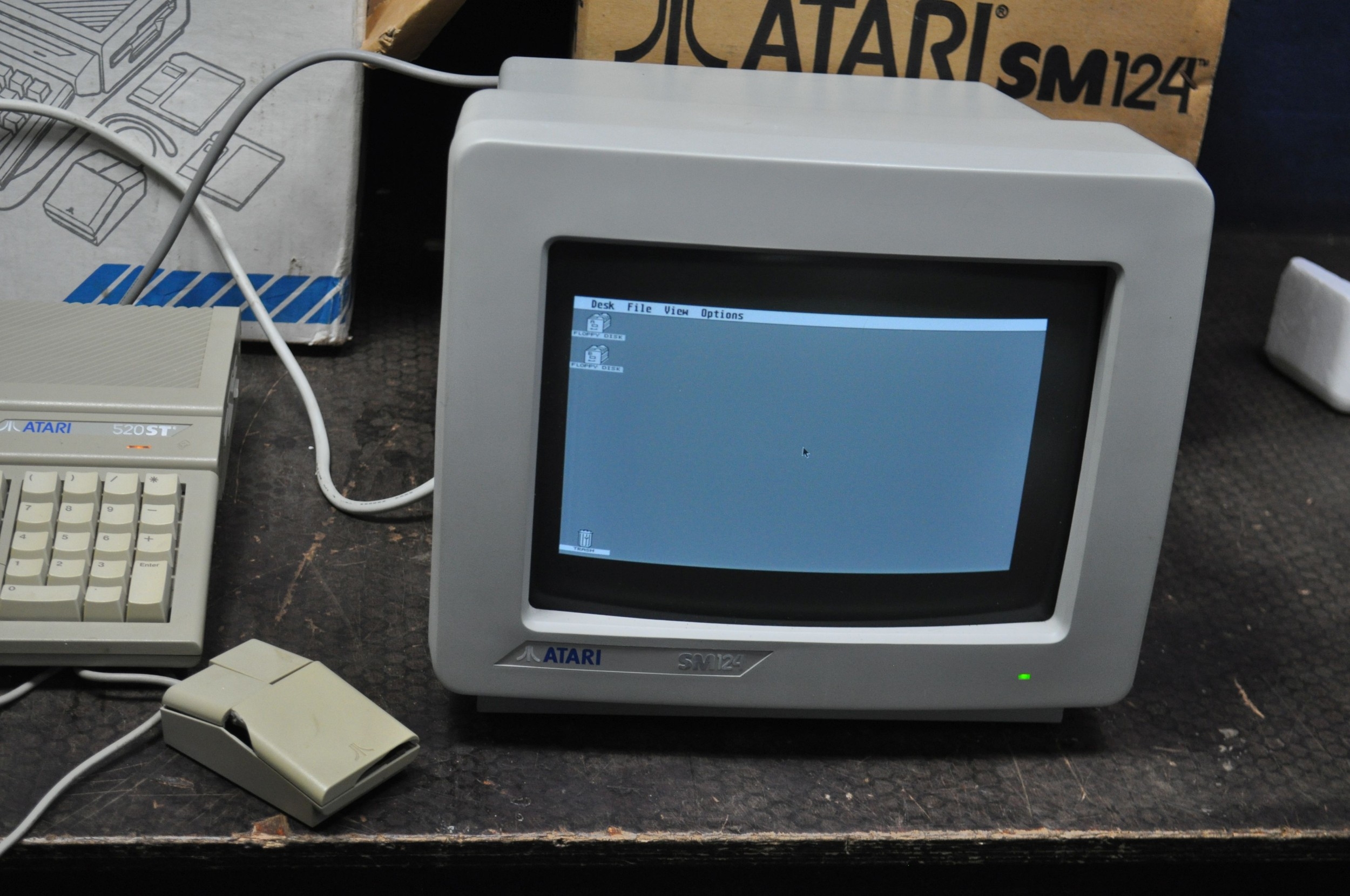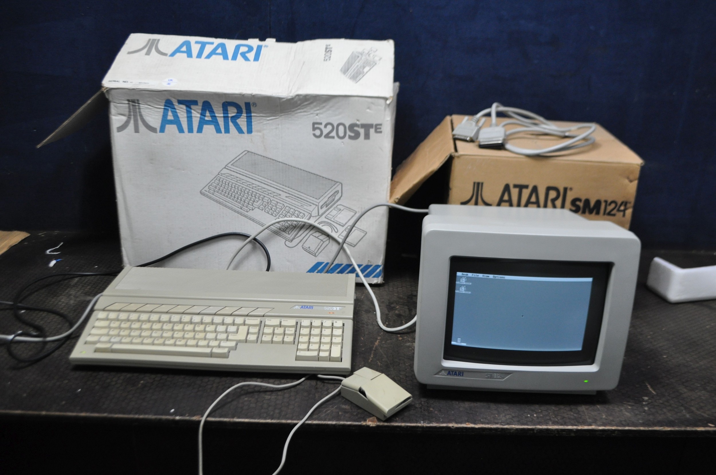 AN ATARI 520STE VINTAGE PERSONAL COMPUTER with original box, mouse (broken case) and a SM124 monitor with original box (both PAT pass and working)